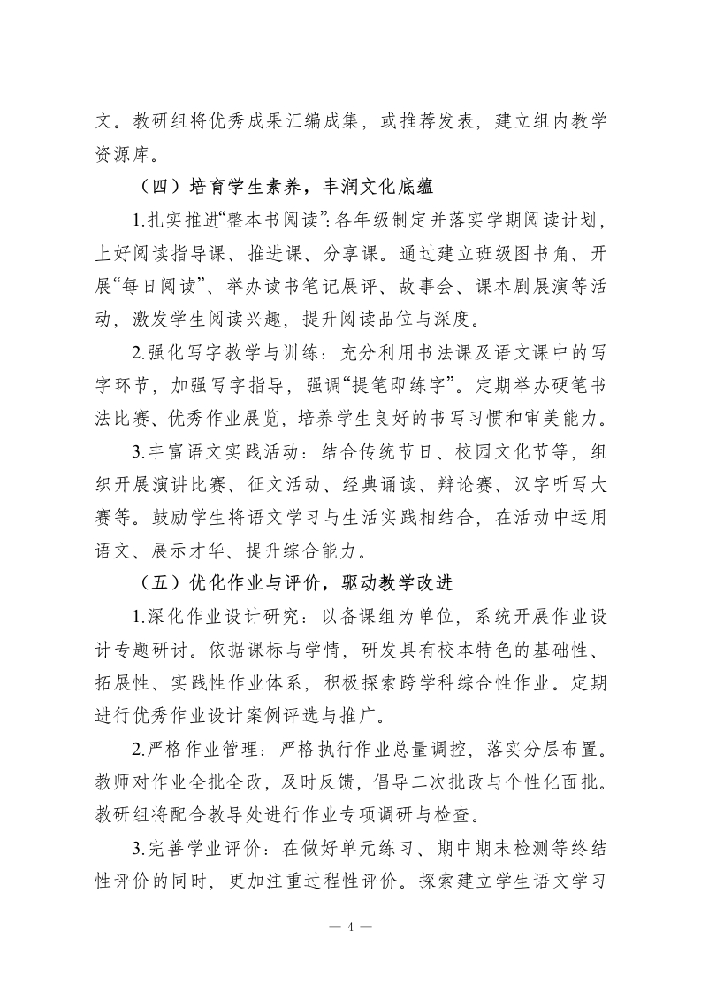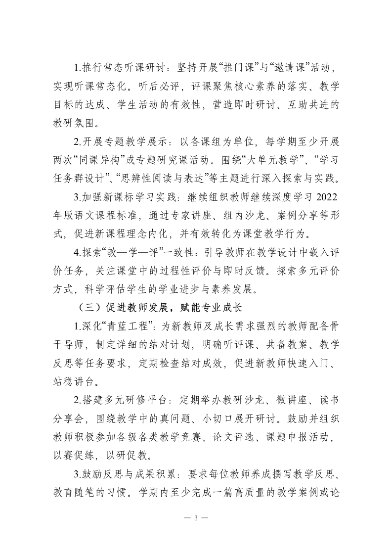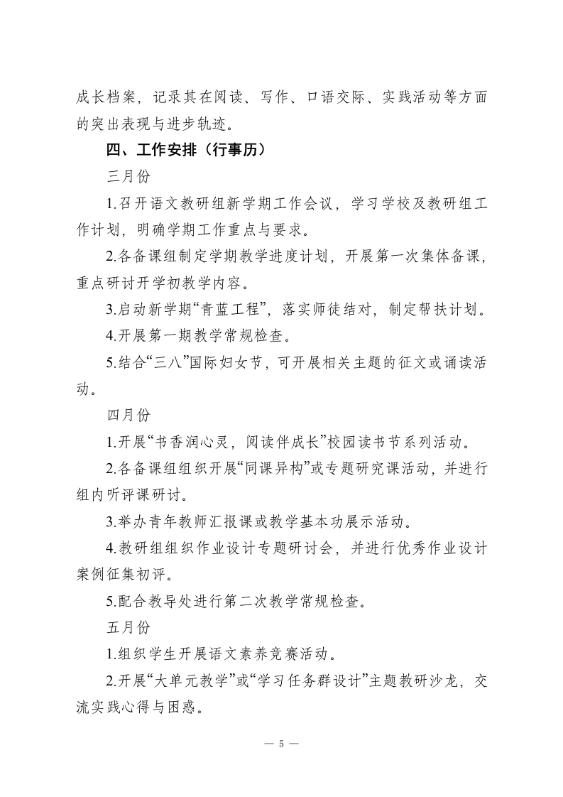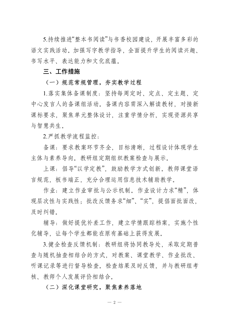 2025-2026学年第二学期语文教研组工作计划:时光织锦语漫漫骐骥奔腾逐新程一、指导思想道阻且长,行则将至;行而不辍,则未来可期。本学期,语文教研组将以学校整体教学工作计划为指引,深入贯彻国家教育方针,积极践行新版《义务教育语文课程标准》理念。我们将坚持以学生发展为中心,以教师专业成长为驱动,围绕“真实、有效、创新”的教研主题,深化课堂教学改革,夯实教学常规管理。通过系统化的校本研修、主题式的教学研讨、多元化的学生活动,致力于构建高效语文课堂,全面提升学生的语文核心素养,促进教研组全体教师的协同发展与专业精进。二、工作目标1.严格执行并优化教学常规“备、教、批、辅、评、研”各环节,通过制度化检查与反馈,实现教学过程的规范化、精细化,保障基础教学质量稳步提升。2.聚焦学生语文核心素养发展,深入推进大单元整体教学实践,探索“教一学一评”一体化。以常态课、研究课、示范课为抓手,切实提高课堂教学的效益与活力。3.系统研究并实施分层、弹性、个性化作业。控制作业总量,提高设计质量,加强批改反馈,实现“轻负高质”。4.依托“青蓝工程”、校本研修、专题研讨、教学竞赛等平台,为不同层级教师搭建成长阶梯,提升团队整体的教研能力、课程实施能力与反思创新能力。1