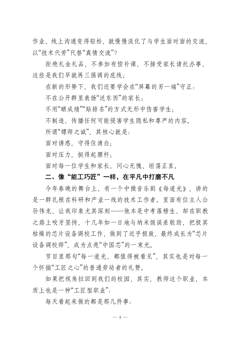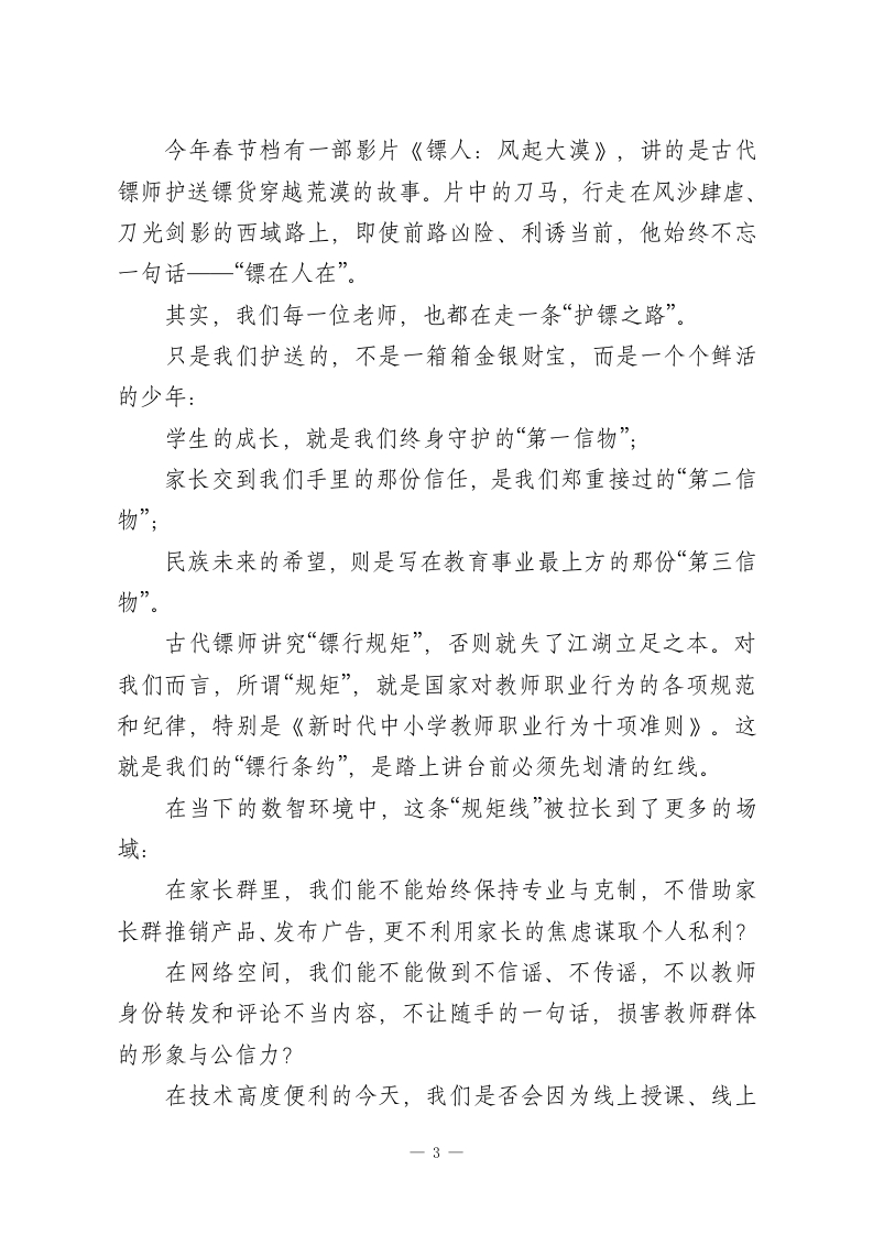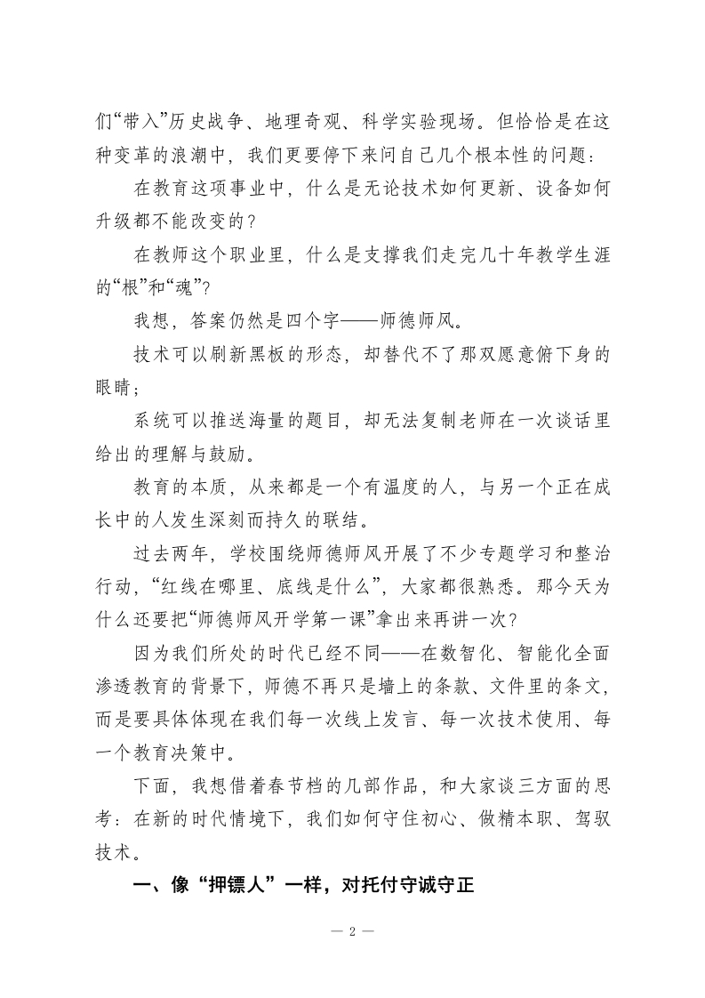 2026春季师德师风开学第一课:不忘初心,做新时代学生成长的“护镖人”!各位老师:大家上午好。春风又起,校园里的草木正在慢慢苏醒。告别团圆温馨的春节假期,我们再次回到熟悉的讲台、走廊和办公室。今天把大家聚在一起,上好新学期“师德师风建设的第一课”,既是提醒我们把心思从“假期模式”调回“育人主业”,更是希望在新一轮教育变革的节点上,把全校教师的思想与行动再一次凝聚在一起。这个春节,相信不少老师和我一样,一家人坐在电视机前看了春晚。和以往相比,今年的晚会给人的一个强烈感受,就是“科技感”扑面而来:舞台上,AI生成的四季画卷在我们眼前流转;身着“铠甲”的机器人与演员同台起舞;虚实交织的骏马在大屏上奔腾;传统戏曲、古画、文物通过XR、数字人等技术重新“活”了起来。曾经只在科幻电影里出现的场景,如今作为普通观众的我们,在除夕夜的几小时之内就看得一清二楚。这背后,不仅是舞台技术的升级,也是整个社会正加速走向“数智时代”的缩影。科技飞速前进,教育也不可能停留在原地。也许再过不久,学生的身边会常驻一个AI学习助手;课堂上,虚拟现实会把他-1