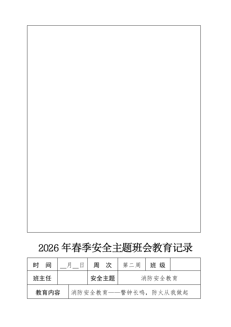 2026年春季安全教育班会记录表周次安全教育内容备注第1周开学安全第一课一一启航安全,守护新学期开学第一课第2周消防安全教育一一警钟长鸣,防火从我做起消防安全第3周春季传染病防控一一守护健康,春季防疫先行传染病预防第4周交通安全教育一一安全出行,幸福回家安全教育日第5周清明假期安全教育一一祭扫安宁,安全伴行清明节假期第6周防溺水安全教育一一温暖春光,远离水域隐患防溺水第7周全民国家安全教育一一护国保家,共筑安全防线国家安全教育日第8周手机网络安全教育一一网络安全,智慧生活网络安全第9周五一假期安全教育一一欢乐假期,安全同行五一劳动节第10周安全用电教育一一用电有道,安全每一刻用电安全第11周防灾减灾安全教育一—预防为主,减灾有力全国防灾减灾日第12周防校园欺凌教育一一关爱同行,远离暴力防欺凌第13周心理安全教育一一心理健康,心灵守护心理健康日第14周远离烟草安全教育一一远离烟雾,拥抱健康世界无烟日第15周夏季食品安全教育一一夏日美味,安全至上食品安全第16周端午假期安全教育一一粽香满溢,安全为先端午节放假第17周远离毒品安全教育一一拒绝毒品,守护未来国际禁毒日第18周雷雨天安全教育一一雷雨莫近,安全为上防雷雨第19周暑期安全教育一一快乐过暑假,安全不放假暑期安全