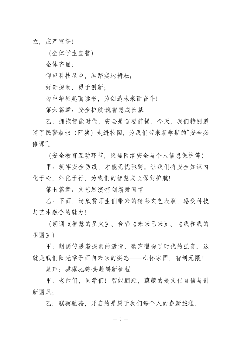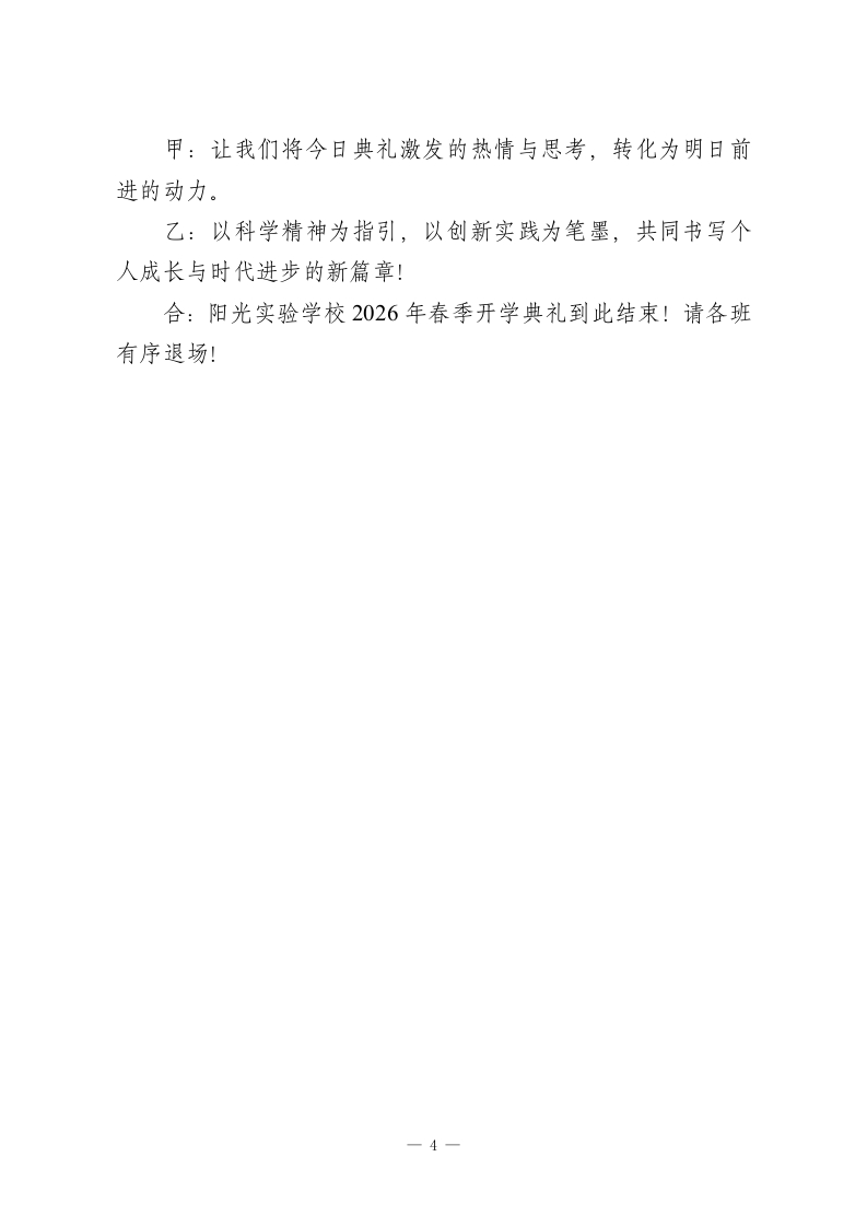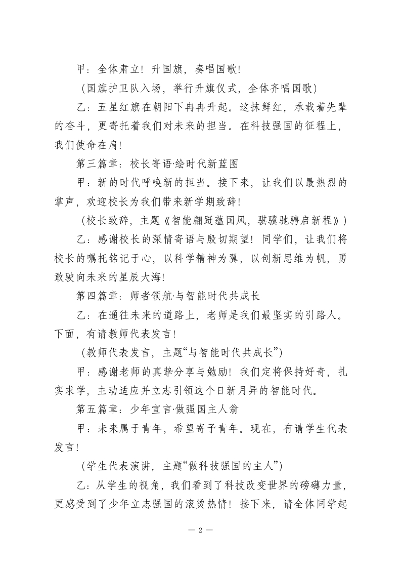 2026年春季开学典礼主持词:智能翻跹蕴国风,骐骥驰骋启新程甲:尊敬的各位领导、各位来宾、敬爱的老师们!乙:亲爱的同学们,各位家长朋友们!合:大家上午好!甲:时代的浪潮奔涌向前,创新的光芒照亮征途。在这春意盎然、万物竞发的时节,我们满怀憧憬,相聚在阳光实验学校,共同开启崭2026年春季新学期!乙:从春晚舞台人机共舞的惊艳亮相,到国际舞台上中国科技的备受瞩目,我们正身处一个科技日新月异、智能蓬勃发展的伟大时代。今天,我们以“智能翩跹蕴国风,骐骥驰骋启新程”为主题,在传承与创新的交响中,启航新学期!甲:我宣布一阳光实验学校2026年春季开学典礼,现在开始!第一篇章:智启未来·穿行时光隧道乙:首先,请大家将目光聚焦于我们的“科技时光隧道”。从校门至操场,这条长廊浓缩了从工业革命到人工智能的壮阔历程。甲:这里重点展示了我国在机器人、航天、新能源等领域的辉煌成就。每一幅图片、每一个模型,都闪耀着智慧的光芒,诉说着创新的故事。同学们手中充满未来感的创意标识,正是我们探索未知、拥抱变革的生动注脚。第二篇章:国旗飘扬·立科技报国志一1