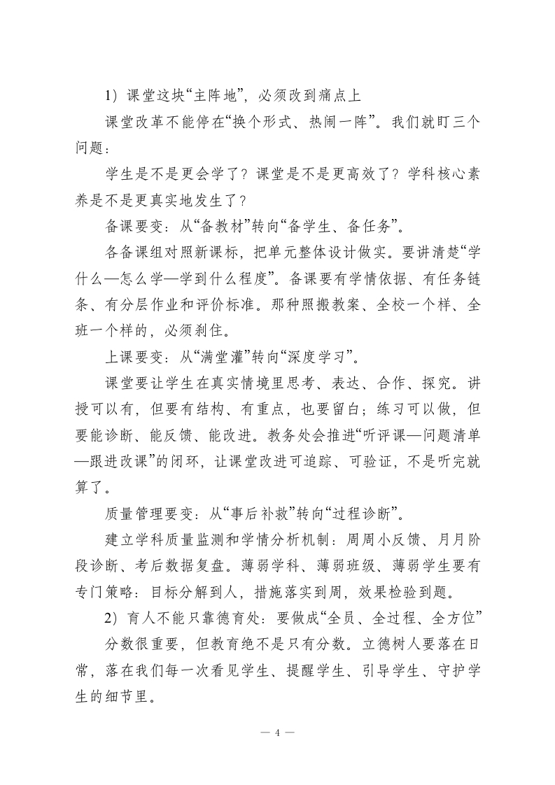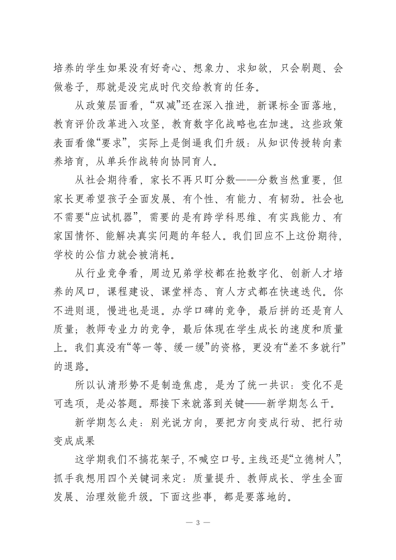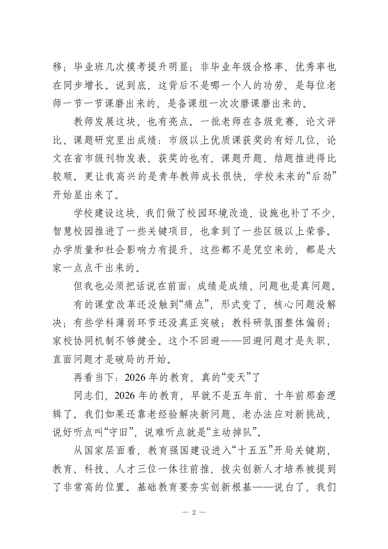 2026年春季开学教职工会议,校长讲话:改革亮剑,实干见效,育人见人各位老师、各位同志们:大家早上好!金蛇辞旧岁,骏马迎春来。寒假说长不长、说短也真短,一转眼大家又回到熟悉的校园。先借这个开学的当口,我代表学校领导班子,给大家送上马年的祝福。也要认真说一句:假期里还有不少同志在岗值守、处理事务、保障运转,辛苦了,学校心里有数,也真心感谢大家。春节这段时间,大家走亲访友、陪老人、带孩子,身体也歇了歇、心也缓了缓,这是好事。但今天一进校门,我们的身份就要“切换”了一一从家人、从普通的生活角色,切回到教育人。我们肩上扛的不是小事:立德树人的责任、家长的期待、孩子的未来,还有这个时代对学校的要求。我今天想讲三件事:过去一年我们做成了什么;现在的形势到底变成什么样了;以及新学期,我们到底怎么干、抓什么、怎么抓出结果。尽量不绕弯,讲点实在的。先说过去:2025年不容易,但每一分努力都算数过去的2025年,说“极不平凡”不夸张。大家一起扛事、一起顶住压力,学校整体交出了一份很硬的成绩单。教学这块,我们把“质量”盯得比较紧。课堂改革推进了,新课标理念也在慢慢落到课堂里,课堂生态确实比以前更顺了些。各年级期末检测整体稳步上升,区域统考多学科位次在前1