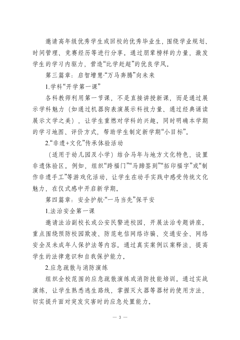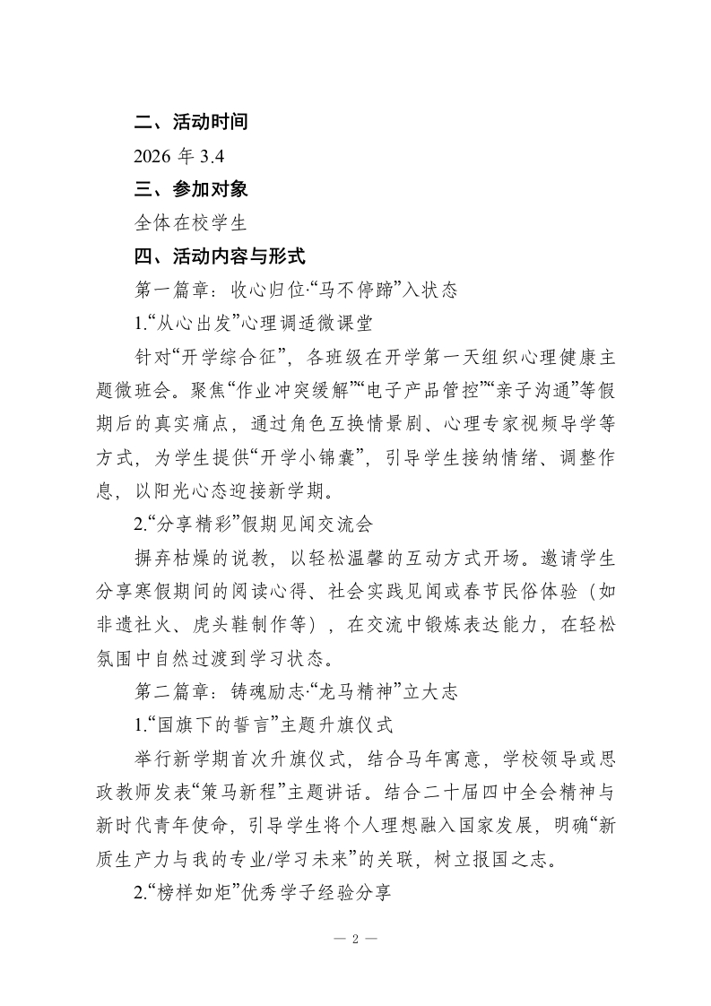 2026年春季学期“开学第一课”活动方案2026年是农历丙午马年,春季学期承载着新的希望与征程。为引导学生尽快从寒假模式切换至校园模式,以龙马精神迎接新学期,本次活动以“策马扬鞭启新程,奋楫笃行向未来”为主题。结合春季开学学生易出现的焦虑情绪、作息紊乱以及安全防范意识淡薄等问题,通过多形式、分层次的教育活动,帮助学生调适心理、明确目标、筑牢安全防线,落实立德树人根本任务。一、指导思想以习近平新时代中国特色社会主义思想为指导,深入学习贯彻党的二十大及二十届四中全会精神,全面贯彻党的教育方针,落实立德树人根本任务。依据《中小学德育工作指南》及2026年全国教育工作会议关于“强化学生心理健康疏导与安全教育”“推进大中小学思政教育一体化建设”的相关要求,结合农历马年“龙马精神、奔腾向前”的文化寓意,立足新学期开学节点学生身心调适的实际需求。坚持“健康第一、生命至上”理念,将理想信念铸魂与心理健康教育相结合,将收心归位引导与行为习惯养成相结合,将安全法治教育与传统文化浸润相结合。通过形式多样、内涵丰富的教育活动,帮助学生迅速调整状态、树立新学期奋斗目标,筑牢校园安全防线,培育学生积极乐观、奋发向上的心理品质,引导全体学生以“策马扬鞭”的昂扬姿态开启新学期征程,努力成长为担当民族复兴大任的时代新人。1