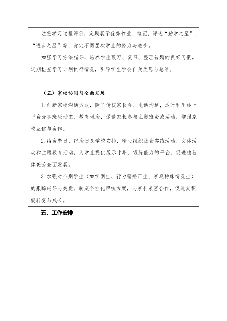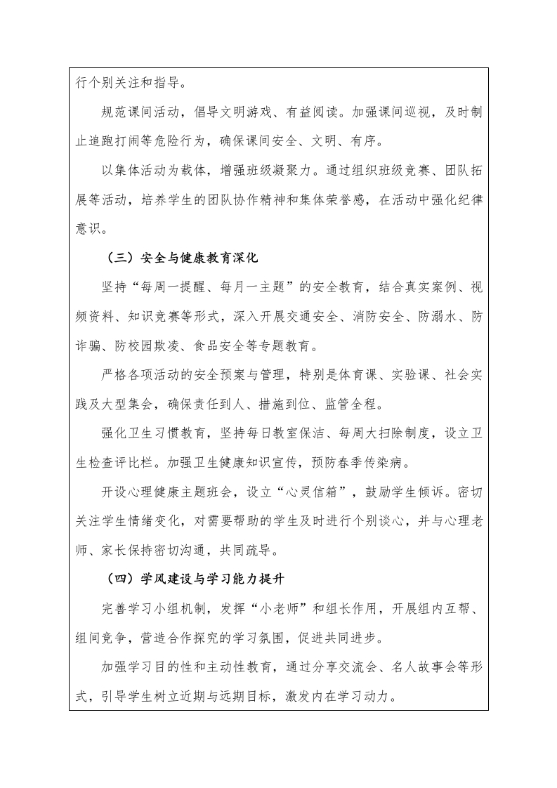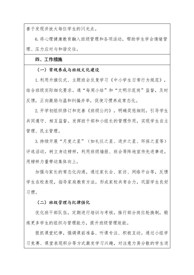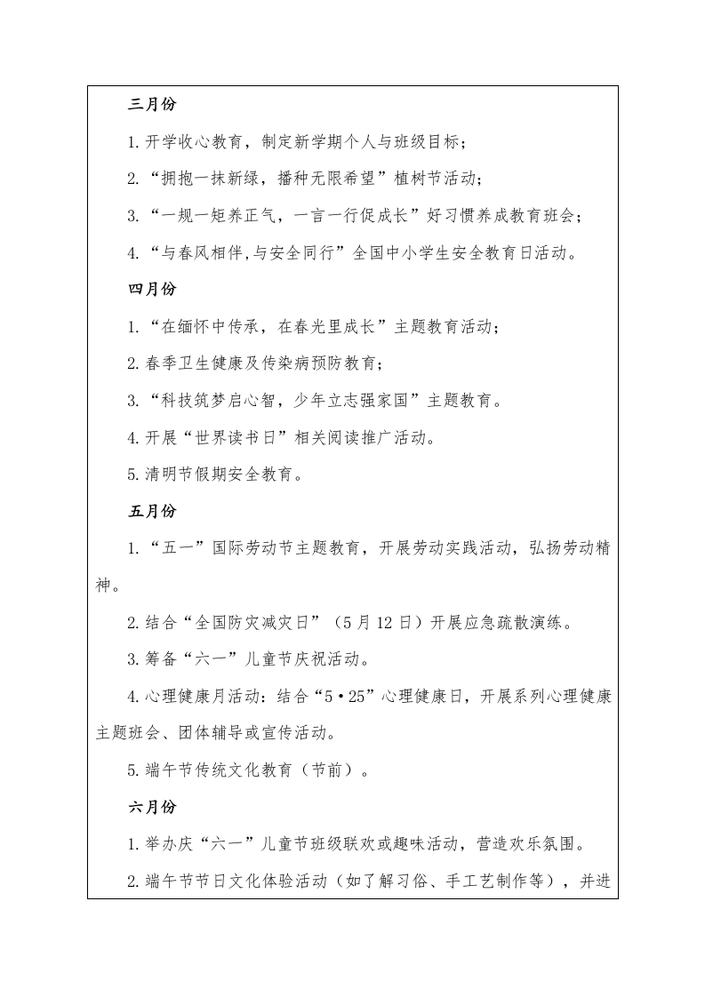 2025-2026年第二学期班主任工作计划(表格版)一、班级基本情况总数总数全班学生数男生留守学生人数男生女生女生标兵人数二、班级情况分析:本班共有46名学生,大部分学生思想比较上进,能够做到热爱劳动,热爱师长,热爱同学,有较强的集体荣誉感,但部分学生由于年龄特点还不能完全够约束自己,缺乏责任感。上课时大部分专心听讲,发言积极,作业美观大方。但也有个别学生学习习惯不好,上课不能集中注意力听讲,需要进行个别辅导和特别的监督。随着年龄的增长和家庭环境的影响,孩子们越来越多的出现心理问题,为班级管理工作带来了很大的难度。三、本期工作目标1.结合重要节日,开展系列主题教育活动,引导学生坚定理想信念厚植家国情怀,增强社会责任感和集体荣誉感。2.常抓不懈文明礼仪、纪律卫生、学习常规等基础养成教育,促使学生内化良好品行,外化规范行为。3.加强课堂纪律、两操、卫生等日常管理,营造“整洁、有序、乐学、奋进”的班级氛围。4.常态化开展涵盖交通、消防、防溺水、防欺凌、网络、心理等方面的安全教育与应急演练,提升学生安全防范意识和自护自救能力。5.营造积极健康的班级文化,鼓励学生“比、学、赶、帮、超”,