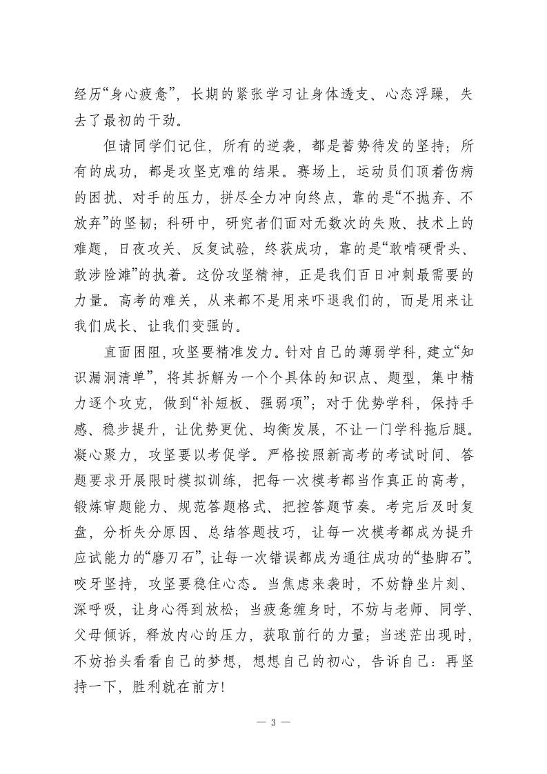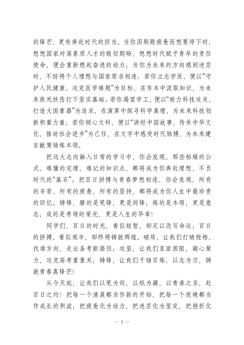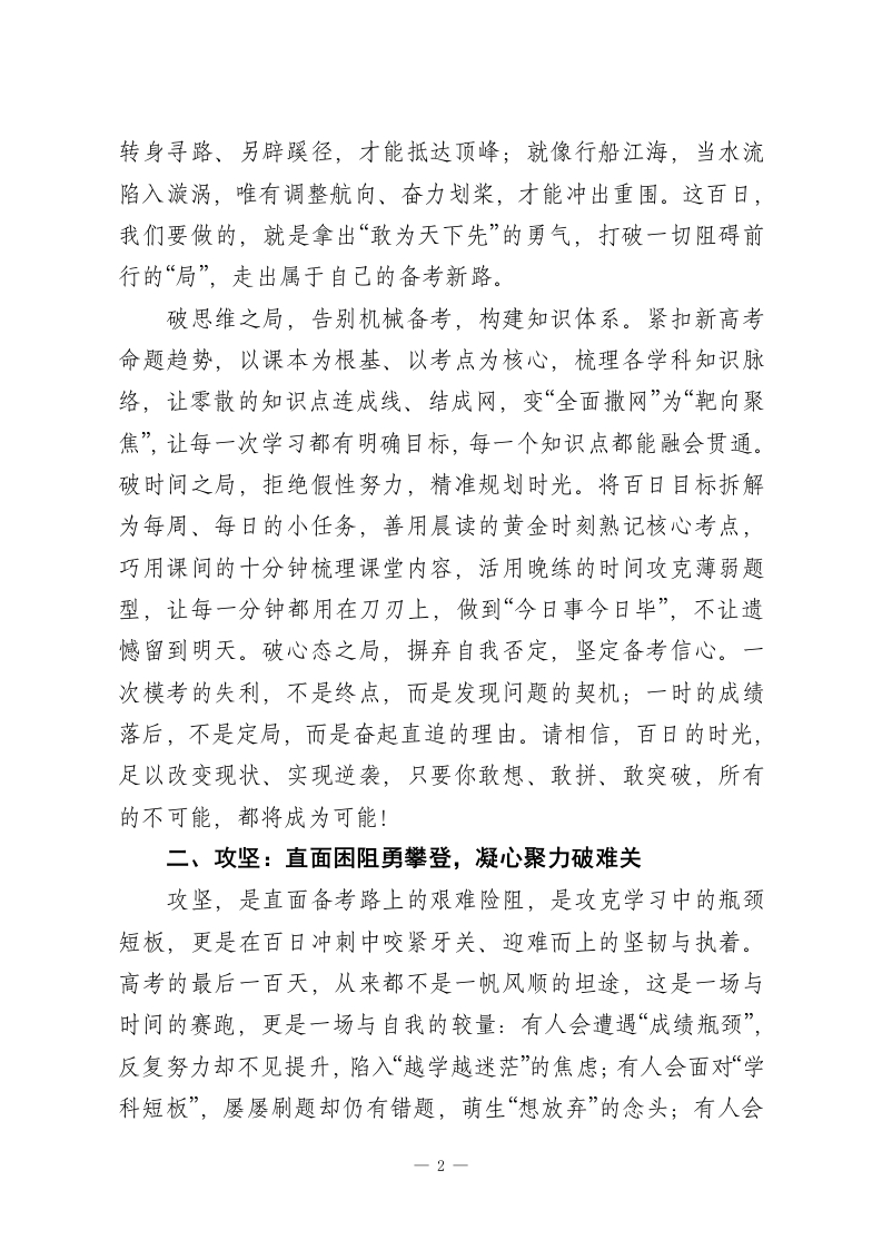 2026年春季学期高考百日誓师大会校长致辞:破局·攻坚·铸锋一一以青春之名决战六月巅峰春潮涌岸,战鼓催征;百日启航,壮志凌云!今天,我们全体2026届高三学子齐聚于此,站在高考百日冲刺的决胜关口,十二年寒窗磨剑,千日夜笃行不怠,此刻皆为最后的蓄力;师长的殷殷期盼、父母的脉脉守望、同窗的并肩相伴,此刻皆为前行的力量。一百天,是时光的淬炼,是意志的磨砺,更是梦想绽放的倒计时!今天,我以“破局、攻坚、铸锋”三字为纲,与大家共勉,愿每一位同学都能以青春之勇破局、以青春之韧攻坚、以青春之志铸锋,在六月的考场上落笔生花,圆梦今夏!一、破局:打破桎梏寻新路,重构备考启新程破局,是打破固化思维的僵局,是挣脱低效备考的桎梏,更是在百日冲刺中找准方向、主动求变的智慧与勇气。当下的备考路上,不少同学仍困在无形的“局”中:有的困于“惯性思维”日复一日机械刷题、死记硬背,却从未梳理知识体系,让学习沦为简单的重复;有的困于“时间内耗”,看似终日埋头苦读,却缺乏科学规划,碎片时间白白流逝,核心考点迟迟未攻;有的困于“自我设限”,一次模考失利便妄自菲薄,一句他人评价便动摇初心,早早给自己的未来画上了“天花板”。同学们,高考的赛场,从来不是墨守成规者的舞台,而是勇于破局者的战场。就像攀登高峰,当一条路走到尽头,唯有