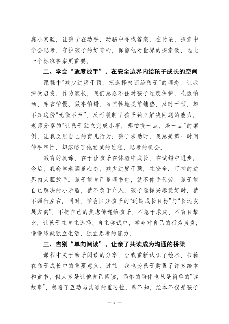 2026年春季学期家长“开学第一课”学习感悟:以爱相伴以智同行,与孩子共赴成长新程2026年春季学期伊始,有幸参与学校组织的家长“开学第一课”,这场干货满满的教育分享,让我对家庭教育的本质有了更深刻的理解,也打破了自己过往的育儿思维定式,解开了日常陪伴中诸多困惑。作为家长,我们总在摸索中陪伴孩子成长,而这堂课程如同指路明灯,让我明白教育不是单向的塑造,而是双向的奔赴;不是一味的控制,而是用心的陪伴与恰当的引导。一、放下“替代思维”,做孩子自主探索的“引路人”随着孩子成长,他的好奇心愈发强烈,常常提出天马行空的问题,从“小鸟为什么能一直飞不累”到“机器人能自己学会做饭吗”,那些充满童真的思考,既让我惊喜,也偶尔让我不知如何回应。课程中提到的“替代型教养”问题,让我颇有感触过往育儿中,我总忍不住替孩子规避困难、直接给出答案,看似是帮助,实则扼杀了他自主思考、主动探索的机会。真正的家庭教育,从来不是家长做孩子的“标准答案库”,而是成为点燃他探索欲的“点火人”。课后,我和家人达成共识,今后面对孩子的问题,不再急于给出答案,而是多问一句“你觉得呢?”“我们一起找找答案好不好?”。无论是通过翻阅绘本、观看科普视频,还是简单的家