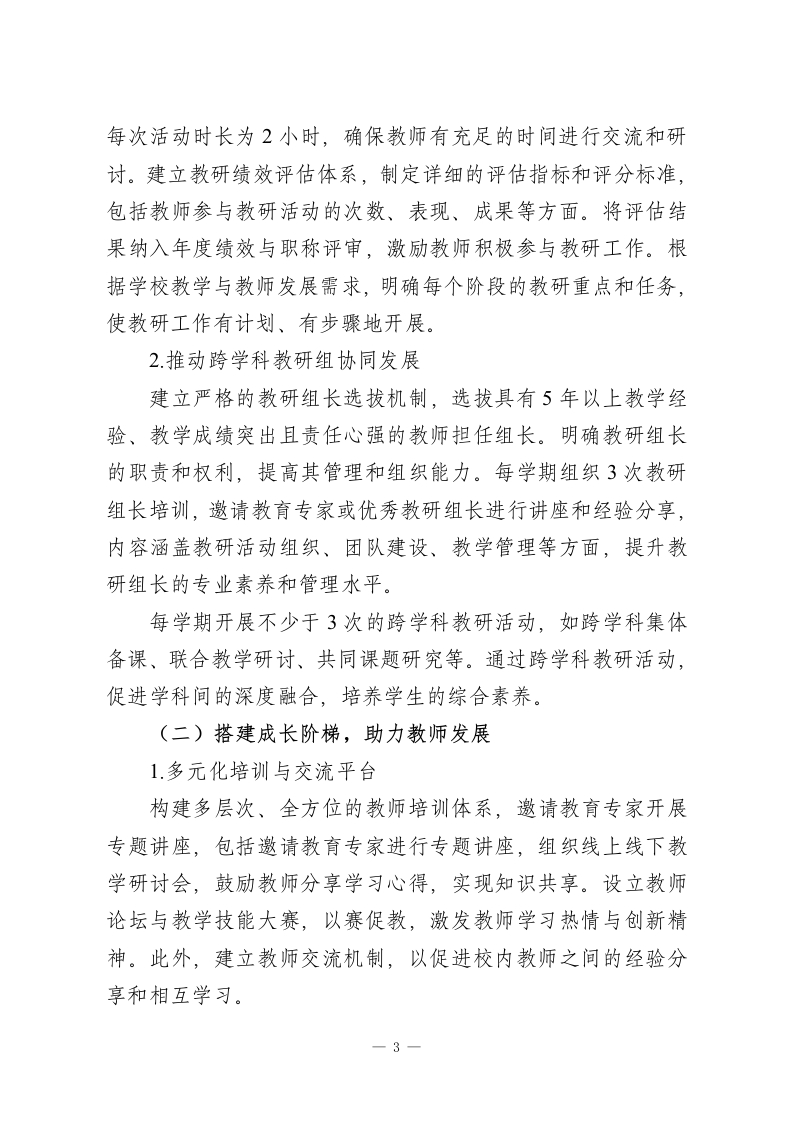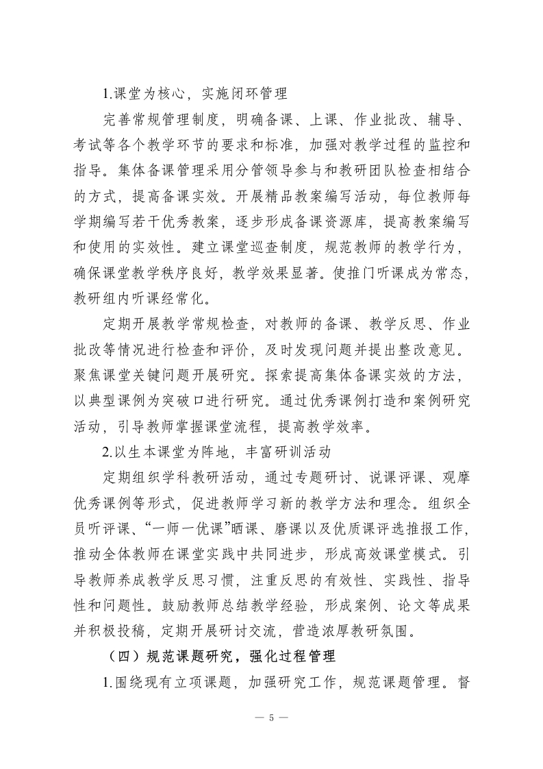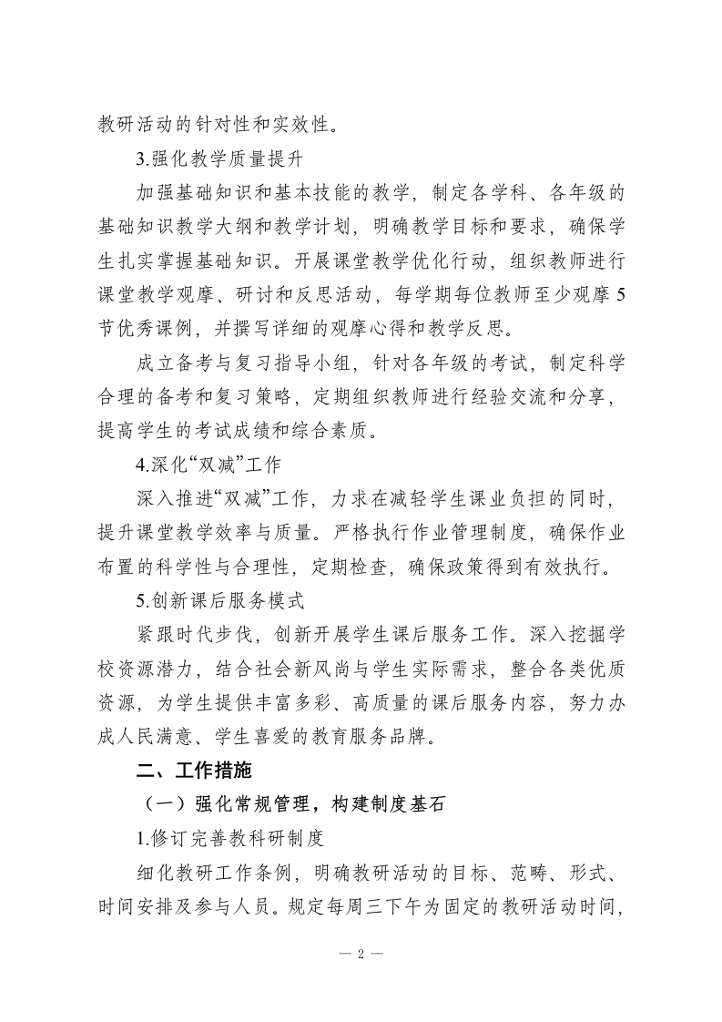 2026年春季学期教科研工作计划一一“教”以共进,“研”以致远一、指导思想秉初心以砺行,担使命而奋进。新学期教研工作的序幕徐徐拉开。本学期,我校教研工作紧密围绕提升教育教学质量这一核心要务,深化课程改革步伐,扎实推进素质教育实践,深度践行“双减”政策,秉持“强化师资,优化教育”的核心理念,坚持从校情出发,强化教师团队建设,不断探索与革新教研模式,力求教研活动的实效性与科学性并重,有效应对教学过程中的实际挑战,为学校教育的持续进步与繁荣奠定坚实基础,让教育的每一步都绽放出智慧与成长的绚烂之花。二、工作目标1.优化教研管理体系全面梳理和完善现有的教研管理制度,明确教研活动的组织流程、参与人员职责以及评价标准,确保教研活动规范、有序、高效开展。每学期组织至少4次“同课异构”教研活动,活动后组织教师进行深入的教学反思和交流研讨,促进教师之间的相互学习与共同进步。2.创新教学研究路径构建多元化、主题化的校本教研模式,除传统的听课、评课活动外,增加教学案例分析、教学问题研讨、教学经验分享等活动形式,丰富教研活动的内涵。每月确定一个教研主题,组织教师围绕主题开展理论学习、实践探索和交流研讨,提高一1