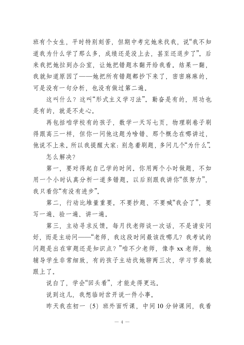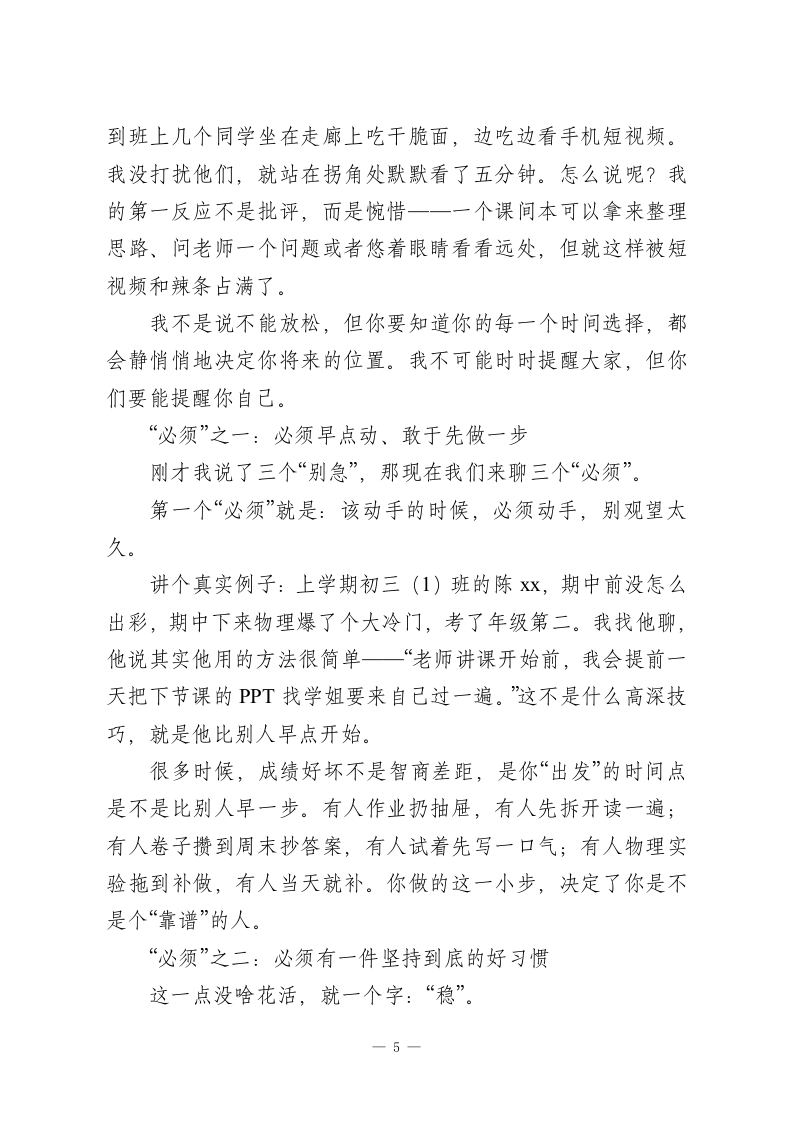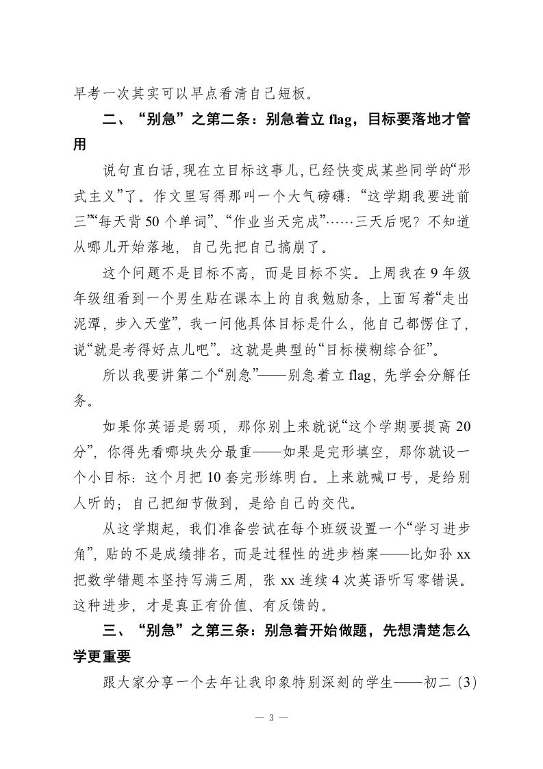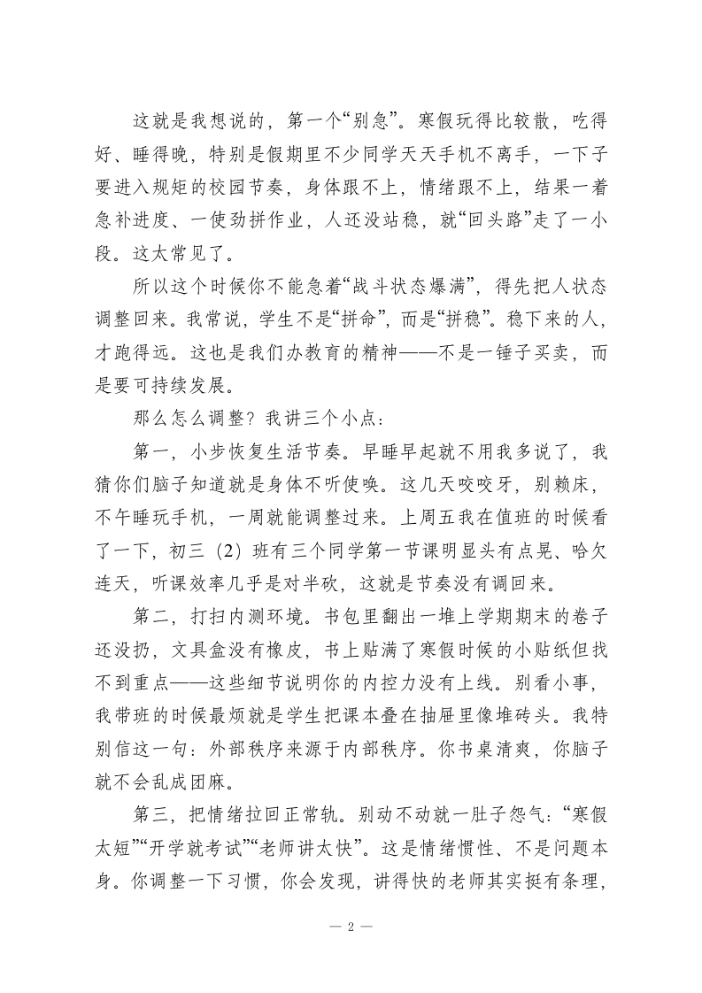 2026年春季学期开学典礼上,校长致辞:新学期,咱们先把三个“别急”和三个“必须”讲清楚!老师们、同学们:早上好!今天这个典礼,我原本琢磨要不要照着以往的老路来讲讲目标、讲讲态度、讲讲奋斗。但后来转念一想,我们的同学也不是第一次开学了,哪句“梦想点燃希望,奋斗成就未来”你们没听过?再念一遍,恐怕有人能抢我台词了。所以,我打算换个思路,今天不讲怎么冲,而是跟你们聊聊新学期最容易“出事”的几个地方。说白了,咱们别一开学就犯老毛病。我今天想从“三个别急”和“三个必须”入手。你看,学校大门一开,学生一回教室,老师一拿教案,新学期就算开始了。但新学期“开始”容易,“走好”难,很多时候出问题不是因为不努力,而是因为太着急。所以,咱今天就一条条聊。一、“别急”之第一条:别急着满血复活,状态调整才是头等大事有的同学一上来就跟打了鸡血一样,不是说不好,但说实话,很多人这一股冲劲儿最多持续三四天,甚至前两天看到有几个高三的同学早晨来得比教导处的人还早,但第三天就赖床没来,问他咋回事,说“我昨晚写作业写到一点半,爬不起来”。