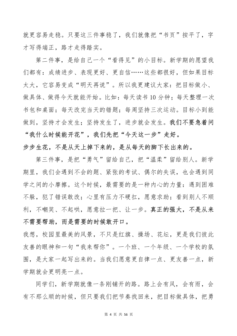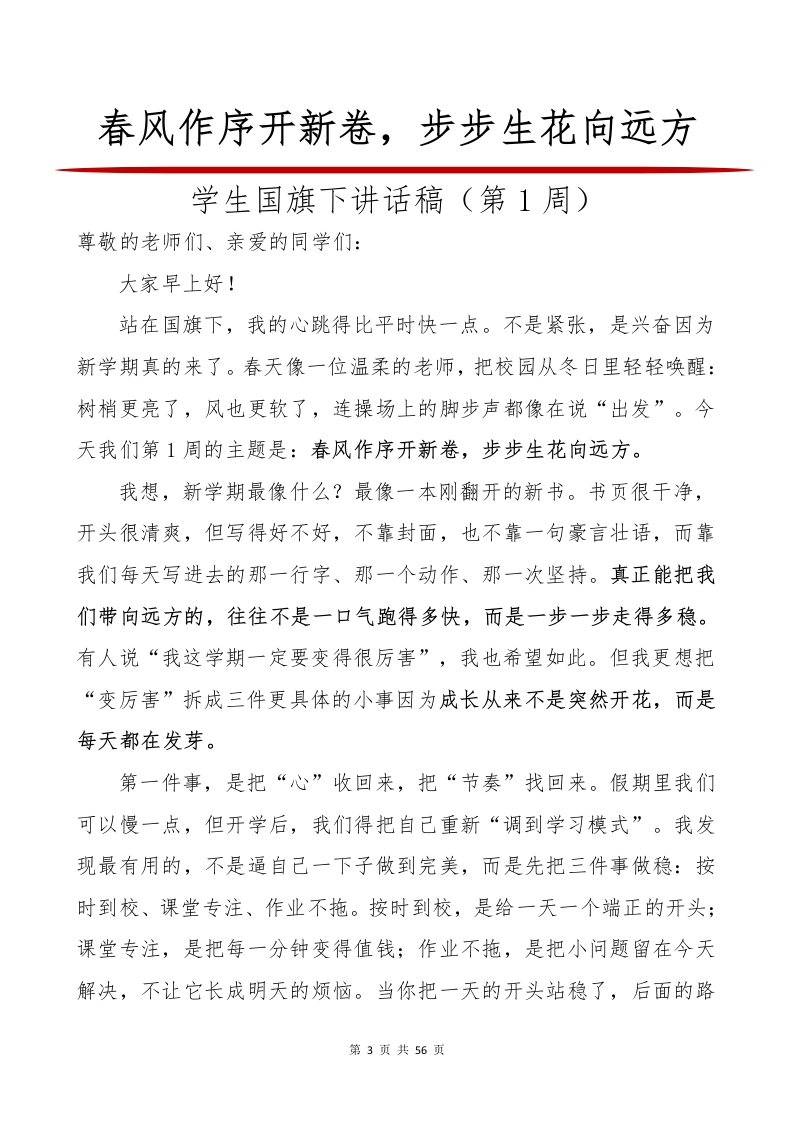 2026年春季学期升旗仪式安排表含:1-18周讲话稿周次日期升旗仪式主题备注班级开学周03.02春风作序开新卷,步步生花向远方学雷锋纪念日03.05203.09绿意落在肩头上,少年携春护新芳植树节03.12303.16清泉不负寸心惜,点滴成风润校园世界水日03.22全国中小学生安全教403.23规则如灯照脚下,平安作伴向前行育日03.30503.30清风寄思连山水,珍惜当下更自强清明节04.04604.06心有边界人更朗,清清爽爽向阳长世界地球日04.22704.13书香作雨润心田,绿意成诗满校园世界读书日04.23804.20双手勤耕开新景,劳动有光照少年劳动节05.01904.27春行千里皆有序,平安归来最心安全国防灾减灾日1005.04识险如握一盏灯,避险成章不慌张05.121105.11回望不是停步处,方法带来新希望1205.18心向晴朗风自暖,脚下稳当路更长心理健康日05.251305.25童心不散迎六月,笑意随风满校园儿童节06.01第1页共56页