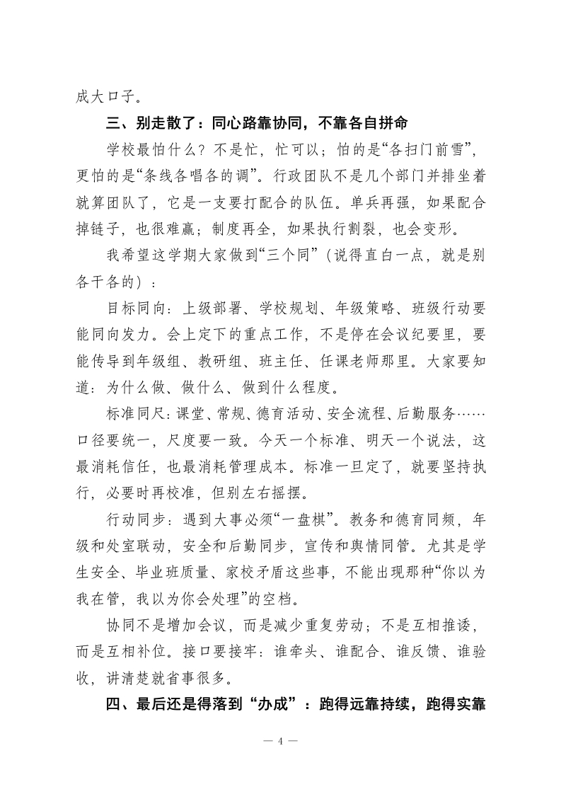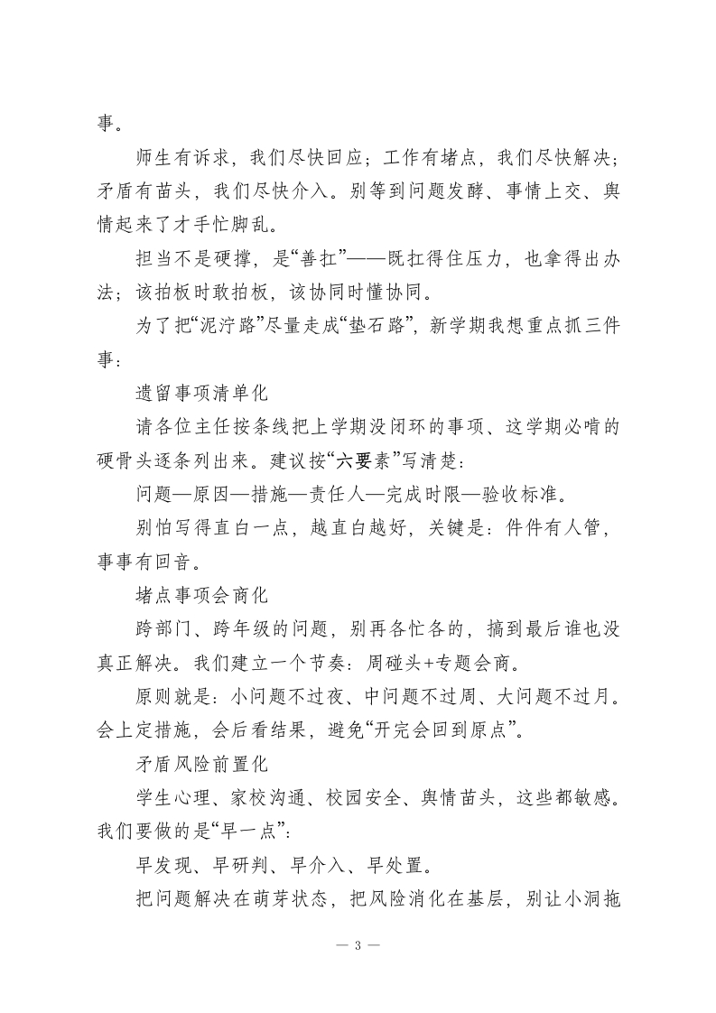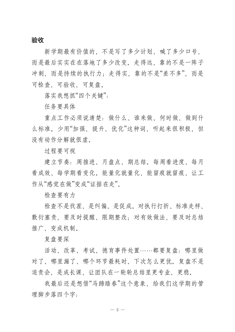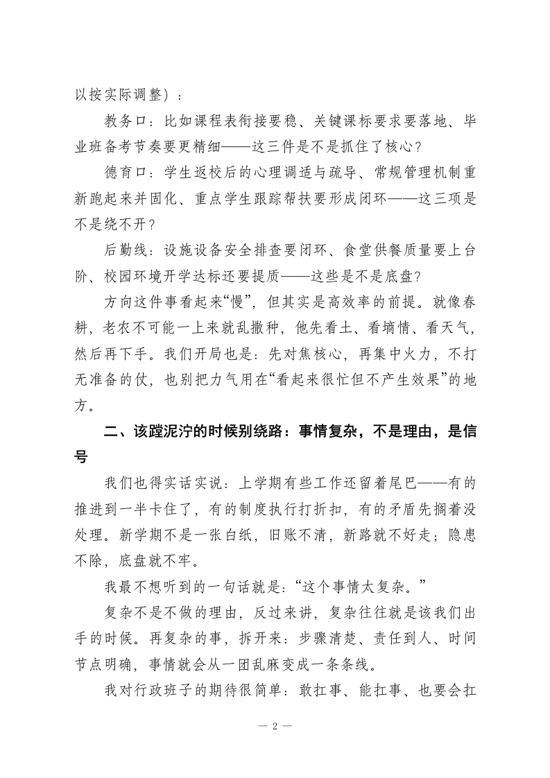 2026年春季学期行政班子会议,校长讲话:抓住这3点,全年工作稳了!各位行政同仁、各位主任:大家早上好!马年开春,空气里都是“要出发”的味道。新学期第一次把大家聚在一起,窗外春光挺好,校园也慢慢热起来了一一学生回来了,老师也回到节奏里,走廊里的人声、笑声一下子就有了。每到开学我都会冒出同一个感受:开学真不是翻个日历那么简单,它更像是一次集体重新整队、再出发。那既然要一起出发,我们先把一个最关键的问题说清楚:新学期这条路,我们到底怎么走,才能走得稳、走得实、走得长远?我今天不讲大而空的道理,就围绕“怎么走好这学期”,跟大家聊四个层面的话,算是一些管理上的“开局提醒”。一、先把脚下的路看清:方向不明,再忙也容易白忙开学前两周,最容易出现一种状态:大家都在跑、都在忙,电话不停、群消息不断、会也不少,但到晚上回头一想一一到底哪几件事真正推进了?有没有抓到最关键的?有时候还真说不清。所以我今天明确提一个要求:请各位主任在本周内,把自己分管条线新学期最核心的“三件事”梳理出来。只要三件,不求面面俱到,但必须是“抓住了就能带动全局”的那种。我给大家举个例子,方便对照(不要求完全照抄,你们可1