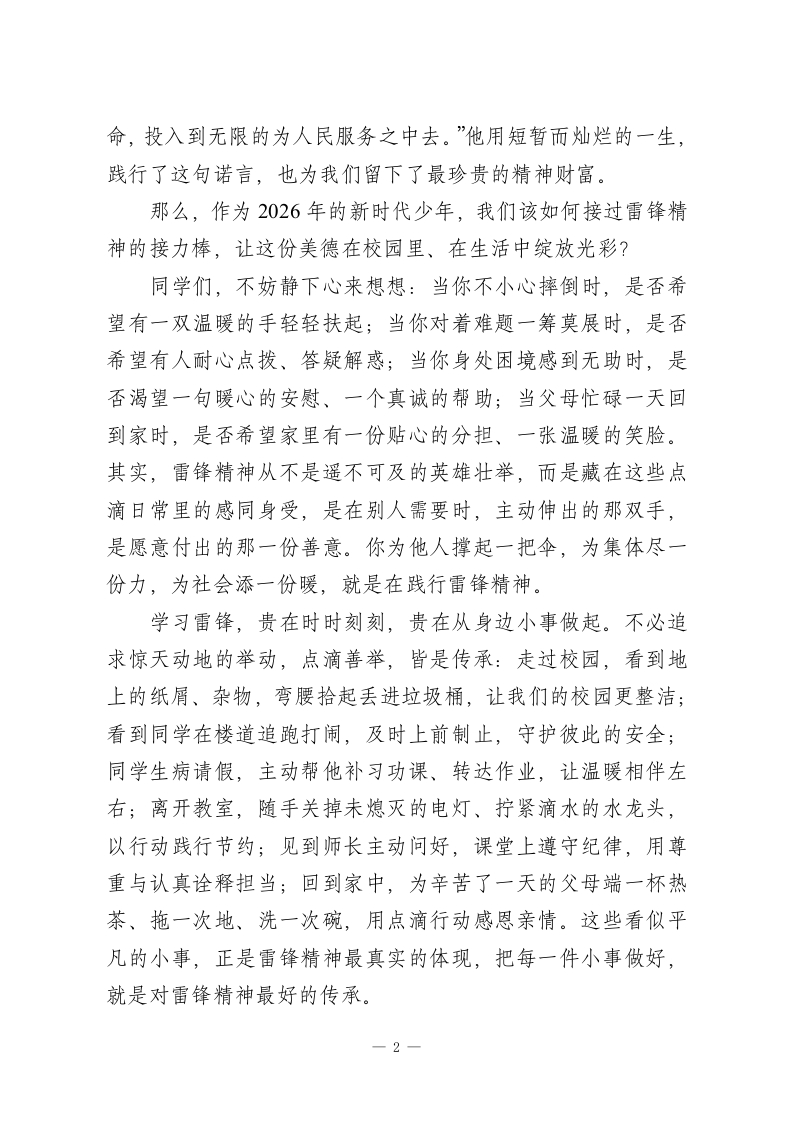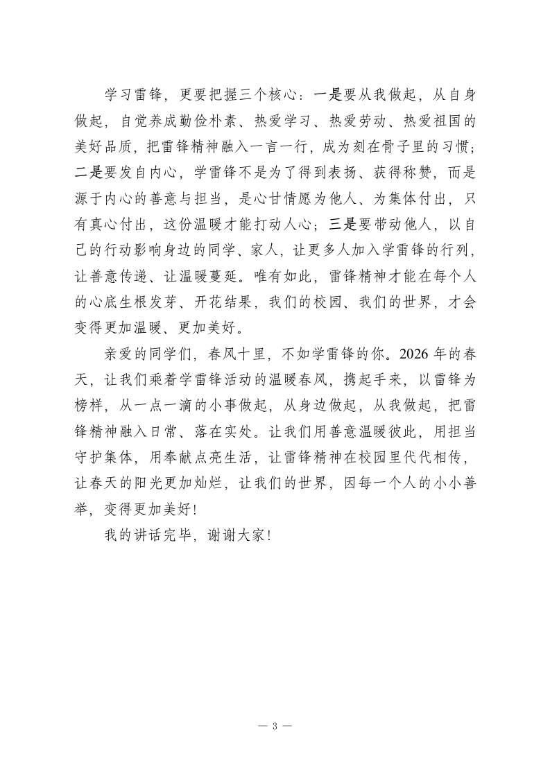 2026年春季学期学雷锋纪念活动日校长讲话:传承雷锋精神,让世界因我们更美好亲爱的同学们:大家好!春风送暖,万物复苏,我们又迎来了一年一度的学雷锋纪念活动日,整个三月也因雷锋精神的传承,成为充满温暖、饱含善意的奉献之月。学雷锋活动在校园里、在社会上已延续多年,这是一种精神的传递,更是一种美德的传承。但与此同时,我们也会听到一些不和谐的声音,有人说“雷锋叔叔三月来四月走”,将学雷锋变成了流于形式的短期活动;也有同学认为“新时代学雷锋已经过时”,看到他人助人为乐时冷眼旁观,甚至出言调侃;还有同学只在学校组织活动时敷衍参与,平日里既不愿为集体出力,也懒得为父母分担。同学们,新时代的我们,真的不需要学雷锋了吗?我们又该如何真正传承雷锋精神,让这份温暖与善意扎根心底、融入日常?答案无疑是否定的。雷锋精神,从不是一个时代的符号,而是跨越岁月、永不过时的精神标杆。大家都听过“雷锋出差千里,好事做了一火车”的故事,这背后,是他刻在骨子里的善意与担当。对待同志,他如春天般温暖,真诚相待、互帮互助;对待学习和工作,他如夏天般热情,脚踏实地、精益求精;对待自身的缺点,他如秋风扫落叶般坚决,勇于改正、不断进步;对待人民的利益,他始终心怀赤诚、坚守初心。他曾说:“人的生命是有限的,可是,为人民服务是无限的,我要把有限的生1
