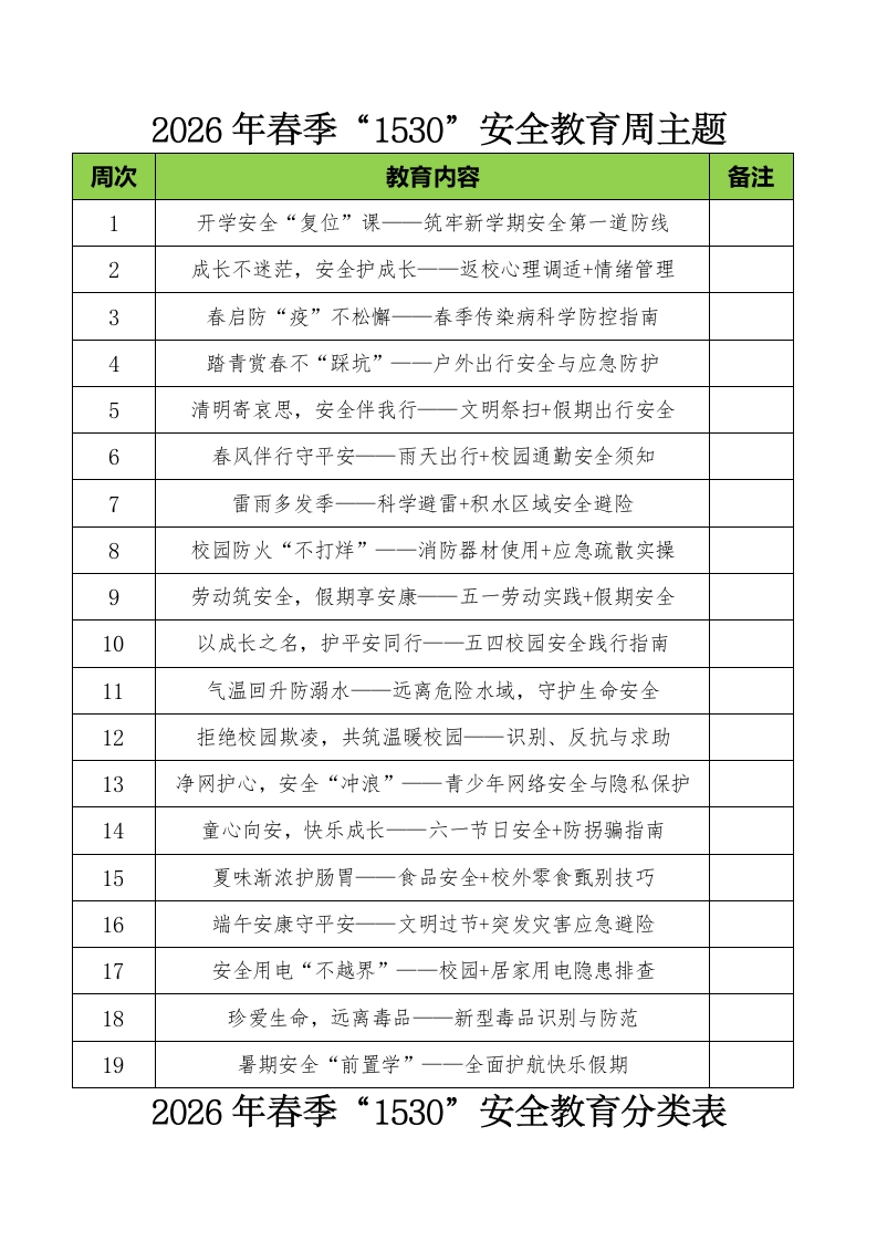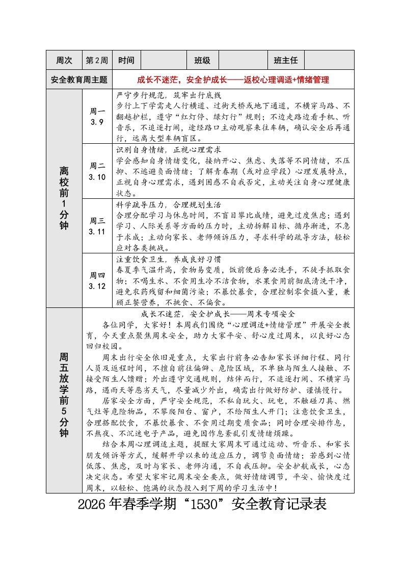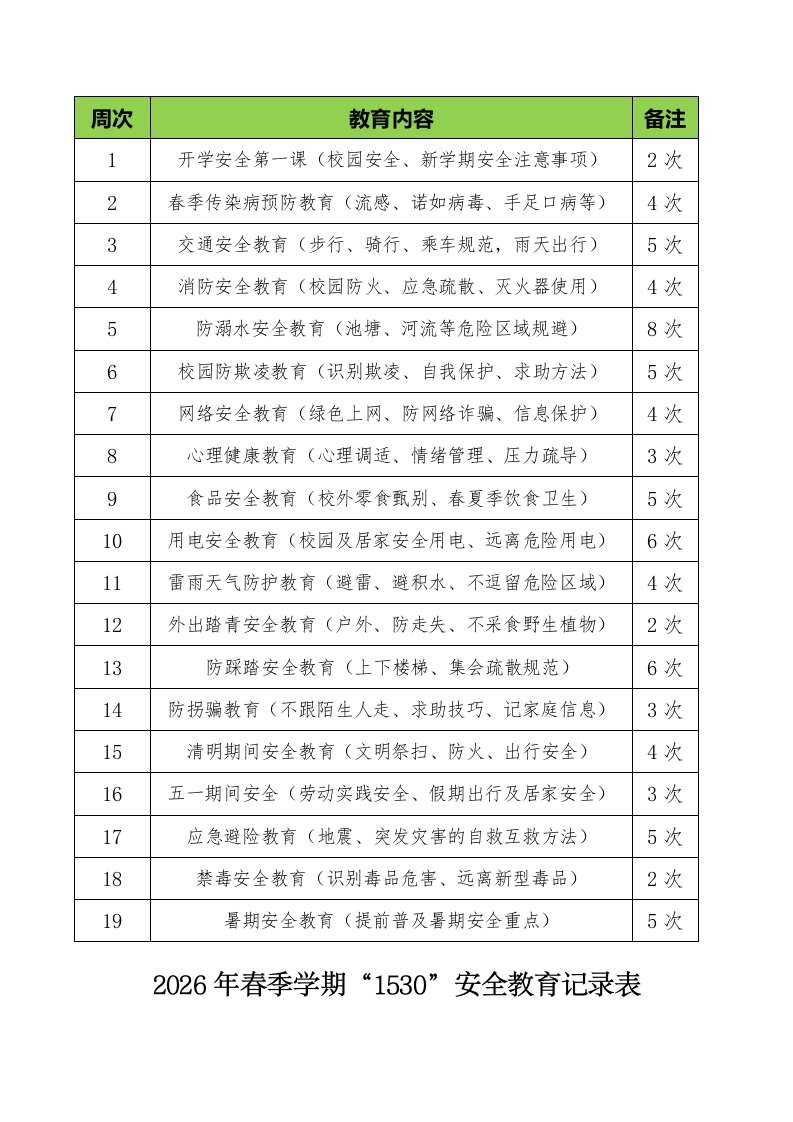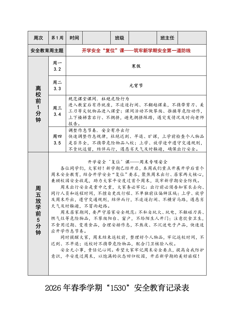 2026年春季“1530”安全教育记录表周次时间周周二周三周四周五周六周日备注3.2-3.6寒假元宵节1分钟1分钟5分钟周末周末3天开学报道23.9-3.131分钟1分钟1分钟1分钟5分钟周末周末5天3.163.201分钟1分钟1分钟1分钟5分钟周末周末5天3.23-3.271分钟1分钟1分钟1分钟5分钟周末周末5天53.30-4.31分钟1分钟1分钟1分钟30分钟清明清明5天假期假期清明1分钟5分钟4.64.6-4.10放假1分钟1分钟周末周末清明放假4.13-4.171分钟1分钟1分钟1分钟5分钟周末周末5天84.20-4.241分钟1分钟1分钟1分钟5分钟周末周末5天劳动劳动劳动4.27-5.11分钟1分钟1分钟30分钟5.1节假节假节假劳动节假劳动劳动5.4-5假105.4-5.8节假节假1分钟1分钟1分钟5分钟周末9日调休5.11-5.151分钟1分钟1分钟1分钟5分钟周末周末5天125.18-5.221分钟1分钟1分钟1分钟5分钟周末周末5天135.255.291分钟1分钟1分钟1分钟5分钟周末周末5天146.1-6.51分钟1分钟1分钟1分钟5分钟周末周末5天156.8-6.121分钟1分钟1分钟1分钟5分钟周末周末5天端午端午端午166.15-6.191分钟1分钟1分钟30分钟4天假期假期假期176.22-6.261分钟1分钟1分钟1分钟5分钟周末周末5天186.29-7.31分钟1分钟1分钟1分钟5分钟周末周末5天197.6-7.101分钟1分钟1分钟1分钟30分钟周末周末5天