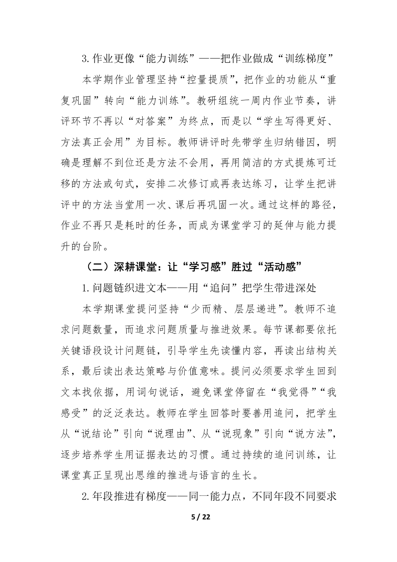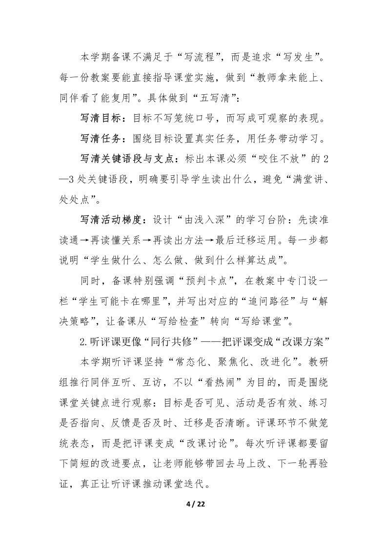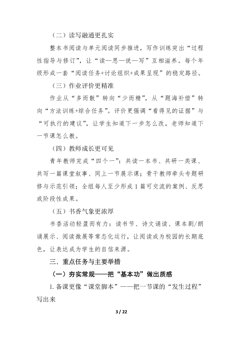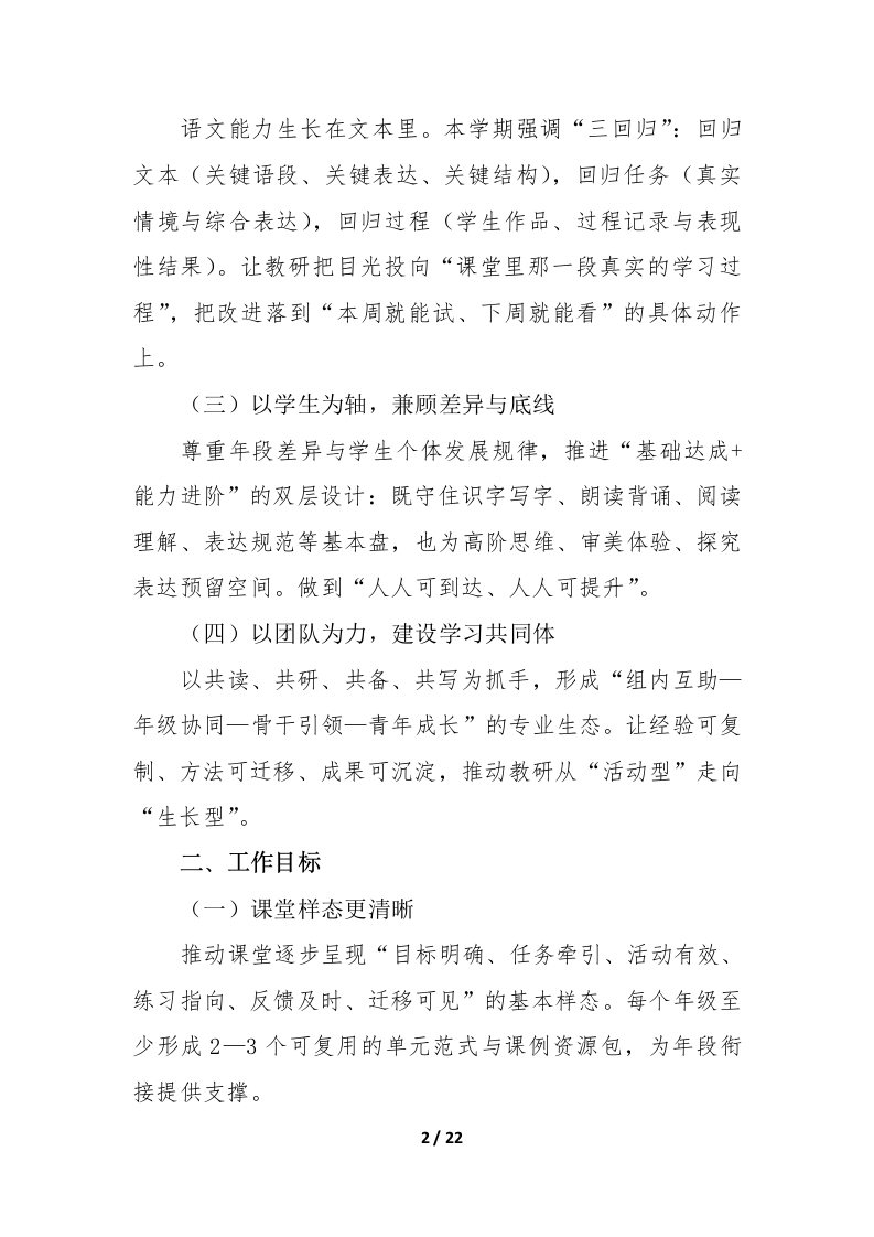 2026年春季语文教研组工作计划一一向下扎根,向上生长,向学而行新学期把我们再次带回语文教学本真的现场,一间教室、一册教材、一群正在生长的孩子,以及一群愿意在“文本一课堂一学习过程”里反复打磨的教师。语文教研的价值,不在“做了多少事”,而在“是否把事做进了课堂、做进了学生的能力里”。因此,本学期语文教研组以《语文课程标准(2022版)》为对照坐标,以“教一学一评一致性”为方法底盘,以“阅读滋养、表达成就、文化涵育、思维生长”为课程气质,强调真实、有效、可持续:让每一次共备都能转化为课时脚本,让每一次研讨都能生成可操作策略,让每一次评价都能回到下一节课的改进中,让语文学习从“会做题”稳步走向“会读、会想、会表达、会迁移”。一、指导思想(一)以课标为纲,对焦核心素养坚持立德树人,立足语文学科育人价值,围绕语言建构与运用、思维发展与提升、审美鉴赏与创造、文化传承与理解四个维度,把“学什么、怎么学、学到什么程度”说清楚、落下去。课堂不追求热闹的表象,而追求学生学习真实发生:读得进、想得透、说得明、写得出。(二)以课堂为本,回到文本的细处1/22