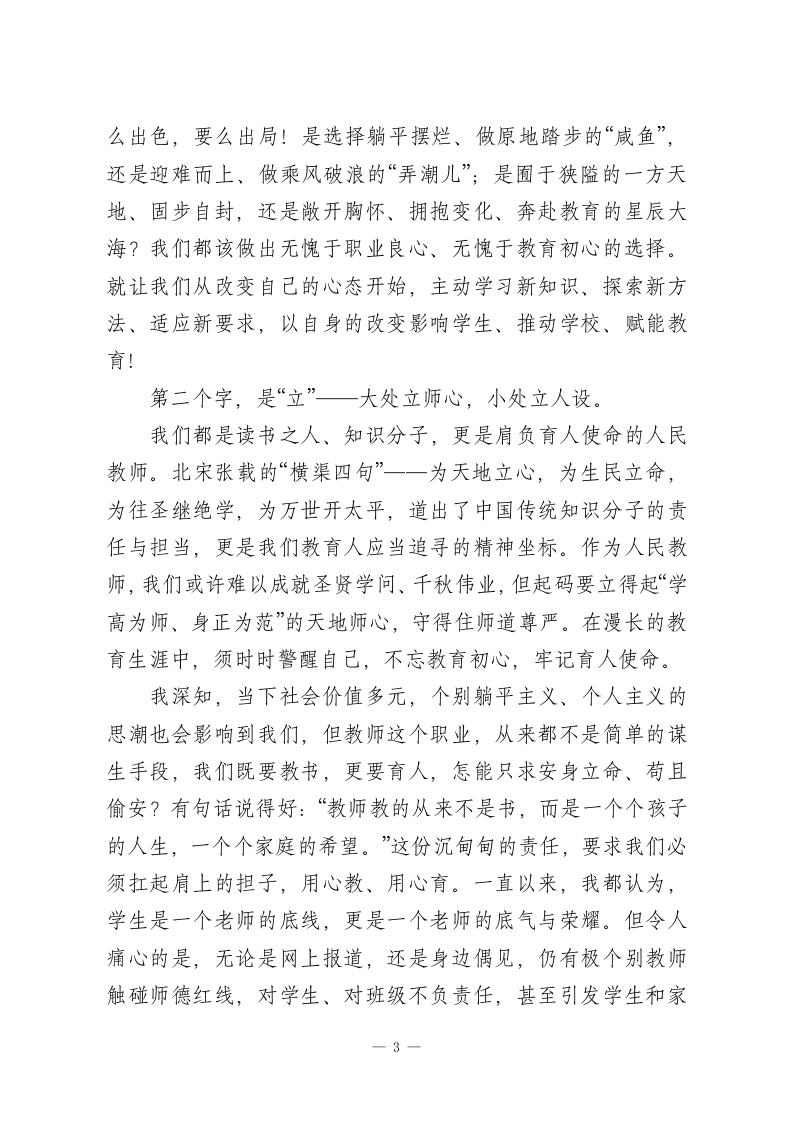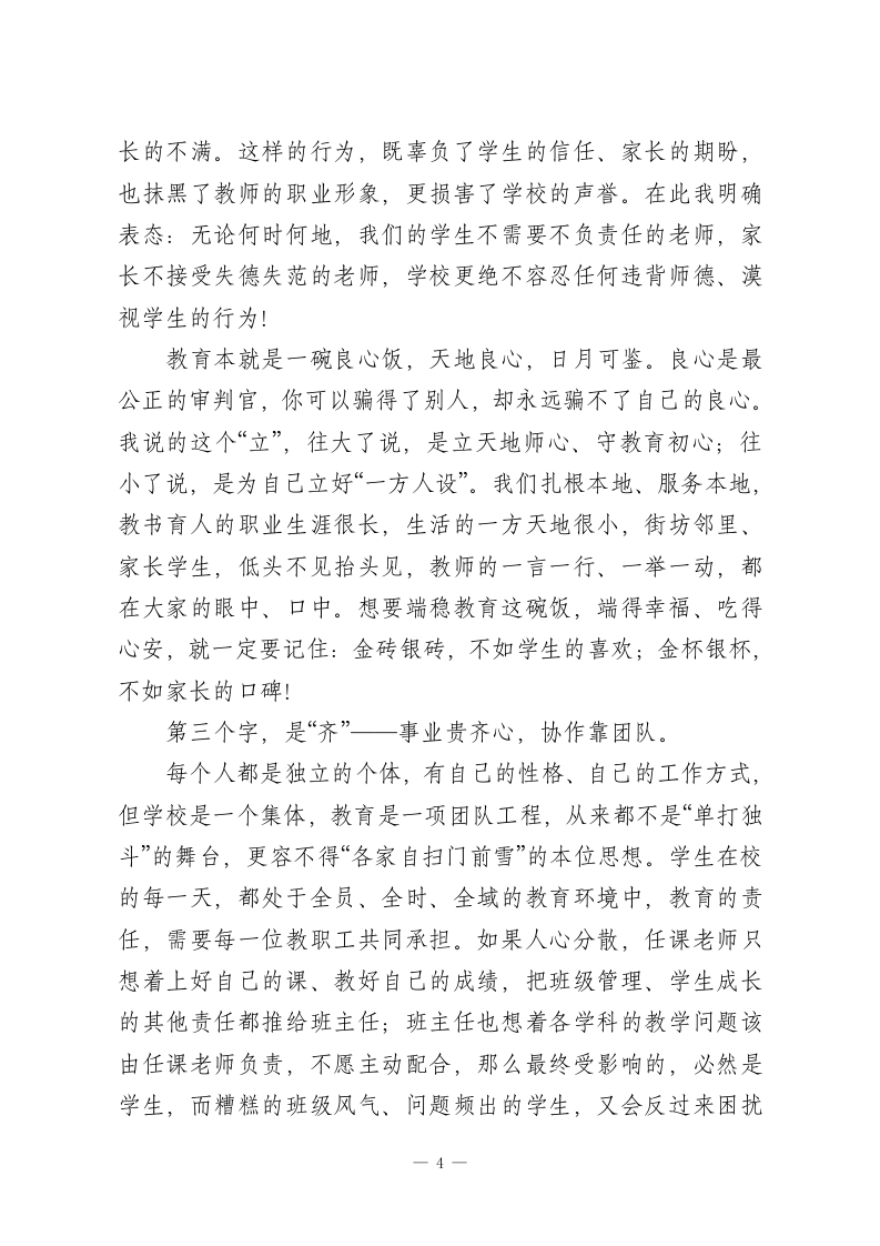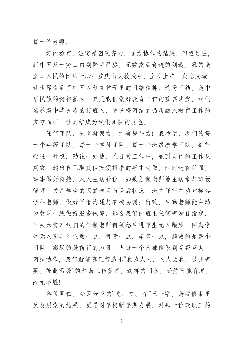 书记在2026年春季学期全体教职工开学工作会议上的讲话:变·立·齐启春季教育新篇亲爱的各位教职工同仁们:大家好!春启新程,万物向荣;初心如磐,步履铿锵。在这播种希望、奔赴新途的美好时节,我们齐聚校园,重返岗位,共同开启2026年春季学期的教育新征程。在此,我谨代表学校党支部、校行政,向全体教职工致以最诚挚的新春问候和美好的开学祝愿,欢迎大家回到我们共同的教育家园!新学期,迎来新气象,更要勇担新使命、展现新作为。九年级的老师们,作为学校中考攻坚的核心力量,即将磨剑百日、冲刺六月,向着中考目标全力进发,打响学校发展进阶的“决胜战”;七、八年级的老师们,要再接再厉、夯基提质,坚守良好的教学与学习习惯,壮大教育教学基本面,打好学生成长、学业提升的“巩固战”。同时,新学期我校还将迎来各类创建工作的终评验收,这是一场关乎学校内涵发展的“攻坚战”,逐条对标整改、升级校园文化、完善办学细节,还有大量具体而艰巨的工作等着我们共同去挑战、去完成。站在2026年春季学期的新起点,回望我们并肩走过的路,学校的社会声誉日益提升,发展根基愈发坚实:行政团队履职能力持续增强,硬件设施不断完善升级,教风学风向上向好,校园文化丰富多彩、独具特色。而今,学校发展的新篇章正待
