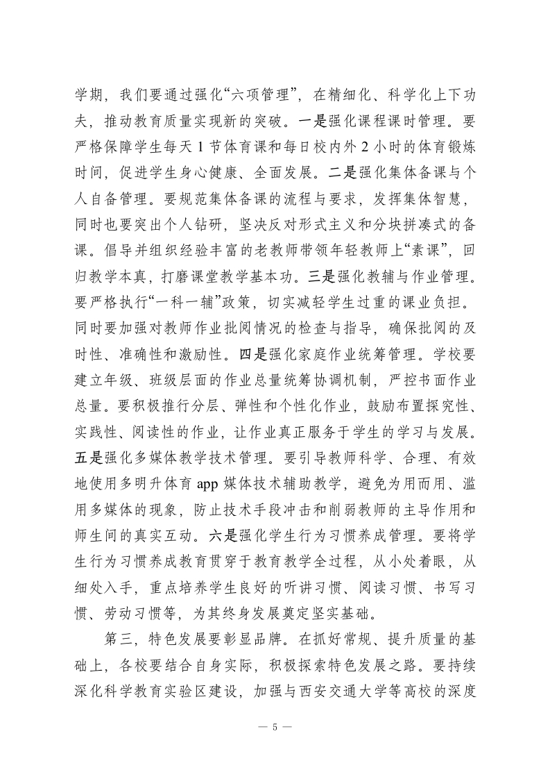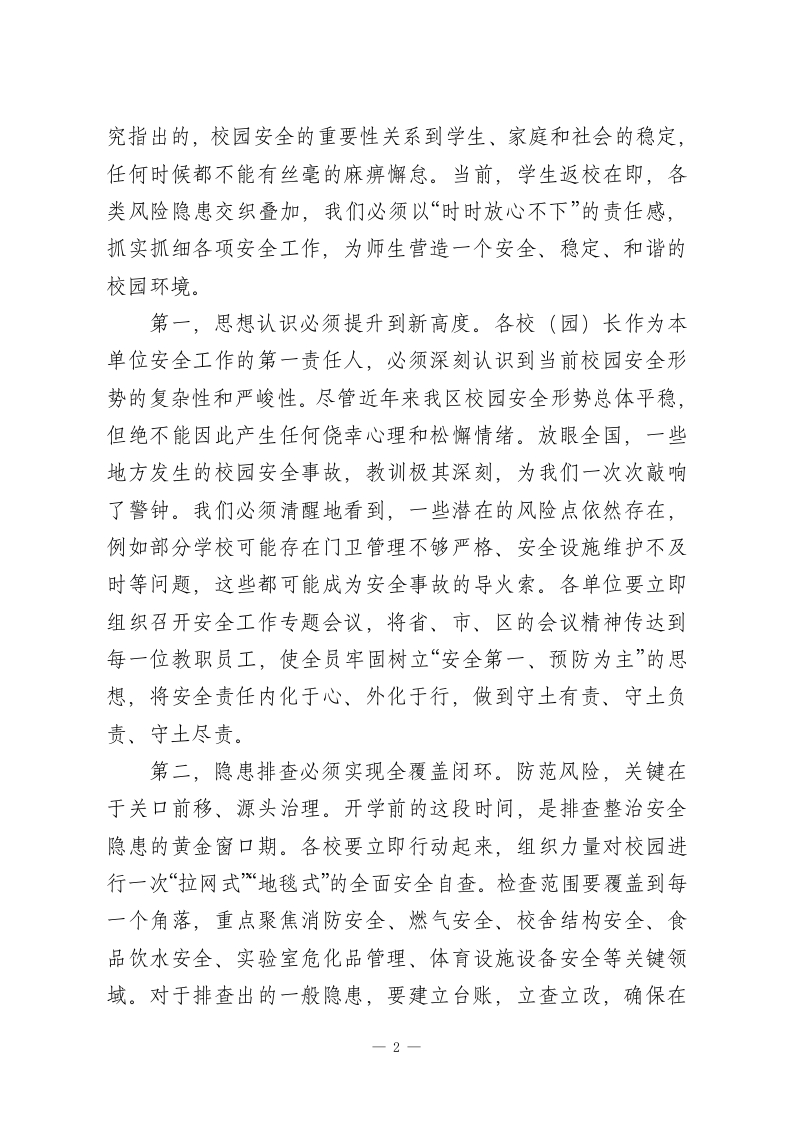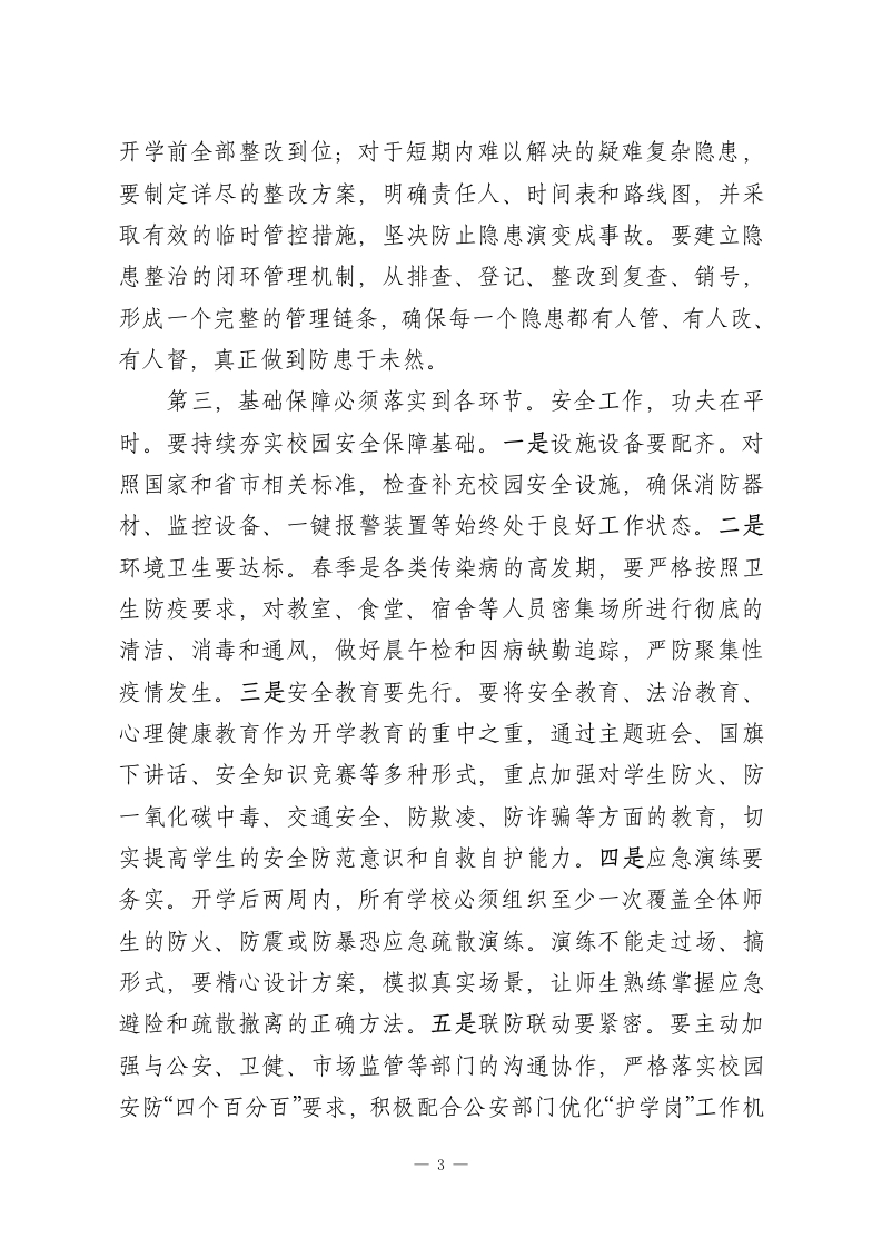 在XX区2026年春季开学安全工作暨开学准备工作会议上的讲话同志们:大家好!岁序更替,华章日新。我们刚刚度过了一个欢乐祥和的春节,带着对新春的美好祝愿,怀着对新学期的无限憧憬,今天我们齐聚一堂,召开全区2026年春季开学安全工作暨开学准备工作会议。这次会议的主要任务,是在深入传达学习省、市教育系统安全工作会议精神的基础上,全面部署新学期开局的各项重点工作,确保全区教育事业在新的一年里开好局、起好步。今天的会议,既是一次收心会,更是一次动员会、部署会。全区各校(园)长、机关各办公室、局直各单位以及民办教育机构的负责同志,共计260余人,共同参与这场“开学第一课”。希望大家迅速从“假期状态”切换到“工作状态”,以饱满的热情和扎实的作风,共同擘画新学期的宏伟蓝图。教育是国之大计、党之大计。新学期的开启,承载着万千家庭的期盼,关系着每个孩子的未来。做好开学工作,意义重大,责任在肩。下面,我将围绕“安全托底、质量为本、育人为核”三个方面,讲几点意见。一、固本强基,以最高标准织密校园安全防护网安全是学校一切工作的底线和红线,是须臾不可放松的头等大事。没有安全,教育发展就无从谈起。校园安全工作不仅是教育问题,更是关乎社会和谐稳定的政治问题。正如相关研1