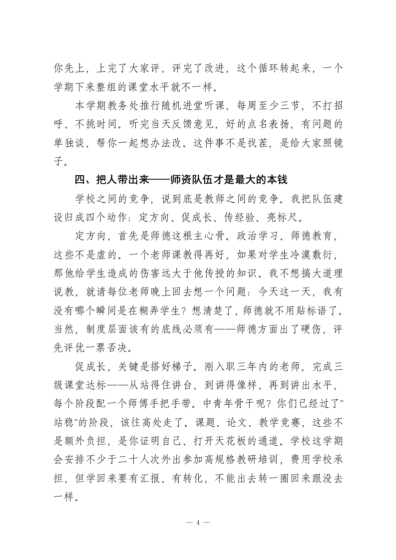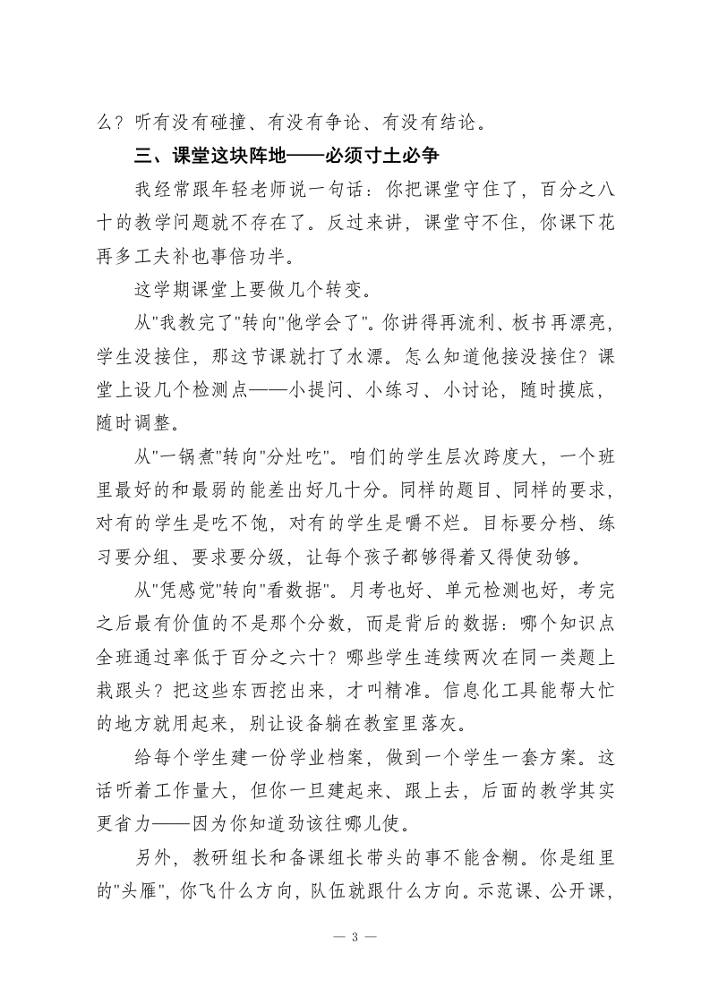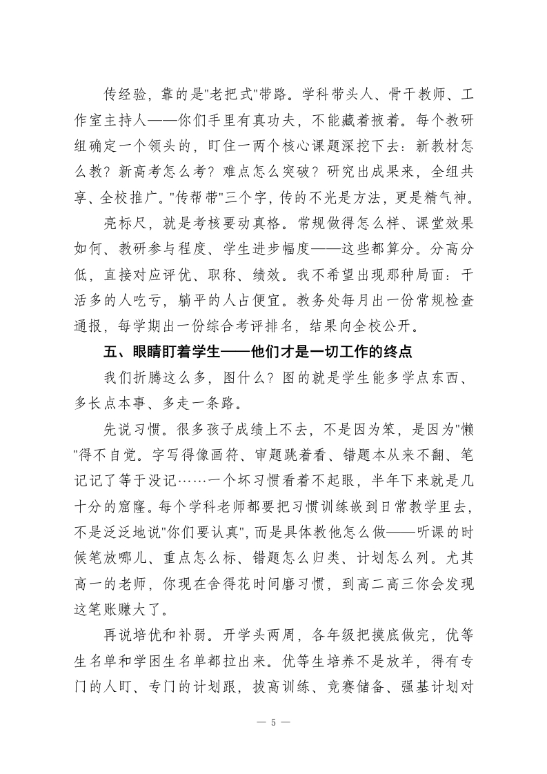 春季开学教学教研工作会炸场:教学副校长抛出六大方面、五道硬关,谁都别想混!老师们、各位同事:上午好!冬去春来,草木萌发。借着这股子蓬勃劲儿,我们坐到一起,把新学期教学这盘棋好好捋一捋。今天这个会,目的很明确:把活儿摆上台面,把担子压到肩上,把路子理清楚,让接下来半年的教学工作扎扎实实往前走。先说两句总的判断。上学期大伙儿干得不赖,该出的成绩出了,该做的事情做了,学生和家长嘴上有好话,我心里有数。但“不赖“两个字顶不了饭吃。咱们学校地处城郊,招进来的孩子底子薄,学习习惯上的欠账不少一这个现实谁也装不了糊涂。越是这样的校情,越不能靠惯性滑行。这学期怎么干?我想了六件事,一件一件跟大家过。一、把规矩立住一教学常规这根弦不能松课备得实不实、堂上得活不活、作业批得细不细、辅导跟得紧不紧、评价给得准不准一一这五样东西撑着整个教学的骨架。骨架散了,什么花哨的改革都白搭。备课这一块,我不反对借鉴现成资料,但你得消化过、嚼碎了、对着自己班的学生重新组装。拿来就用、换个名字就交的教案,检查一次通报一次。课堂四十分钟,值钱得很。一节课如果前十五分钟还在"我说你听",后十五分钟学生已经走神了,一1