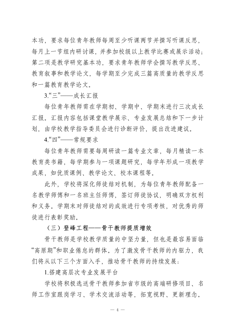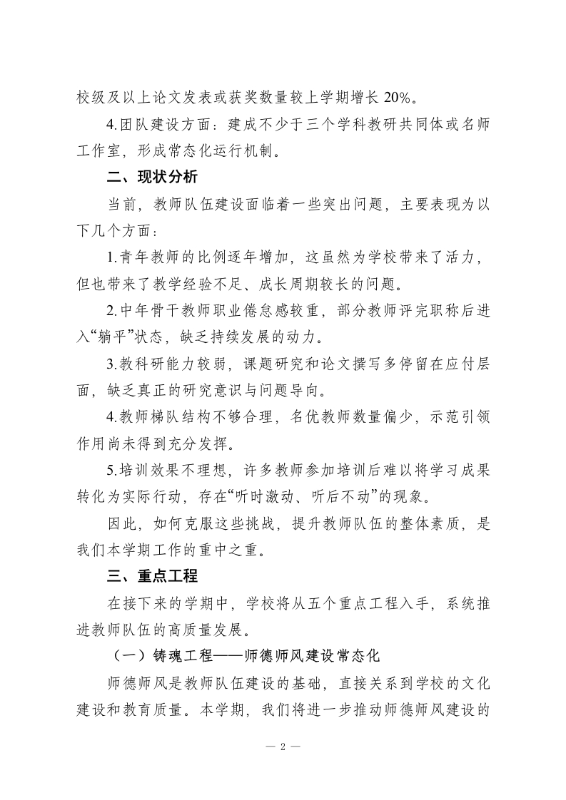 春季学期教师队伍高质量发展工作方案:铸魂·赋能·提效,打造新时代高素质专业化教师梯队一、指导思想2026年春季学期,学校继续秉持习近平新时代中国特色社会主义思想,以党的教育方针为指导,全面落实《新时代基础教育强师计划》的精神,致力于通过师德为先、能力为本、分层培养、梯队发展的原则,建设一支高素质、专业化的教师队伍。我们的目标是通过系统性的发展工作,铸造一支师德高尚、业务精湛、结构合理、充满活力的教师队伍,为学校的内涵式发展提供坚实的人才支撑。(一)发展目标本学期的总体目标是通过有计划、有针对性的发展行动,构建一个符合学校特点、适应时代发展要求的“师德引领、分层培养、梯队发展、评价驱动”的教师发展体系。具体目标为:1.师德师风方面:确保师德违规零发生,教师满意度和家长满意度均达到90%以上。2.专业成长方面:所有青年教师(教龄5年以内)完成“站稳讲台”达标考核,骨干教师至少完成一项校级及以上课题研究或公开教学展示,名优教师在区域内发挥示范辐射作用不少于两次。3.教科研方面:教师参与课题研究的覆盖率达到60%以上,