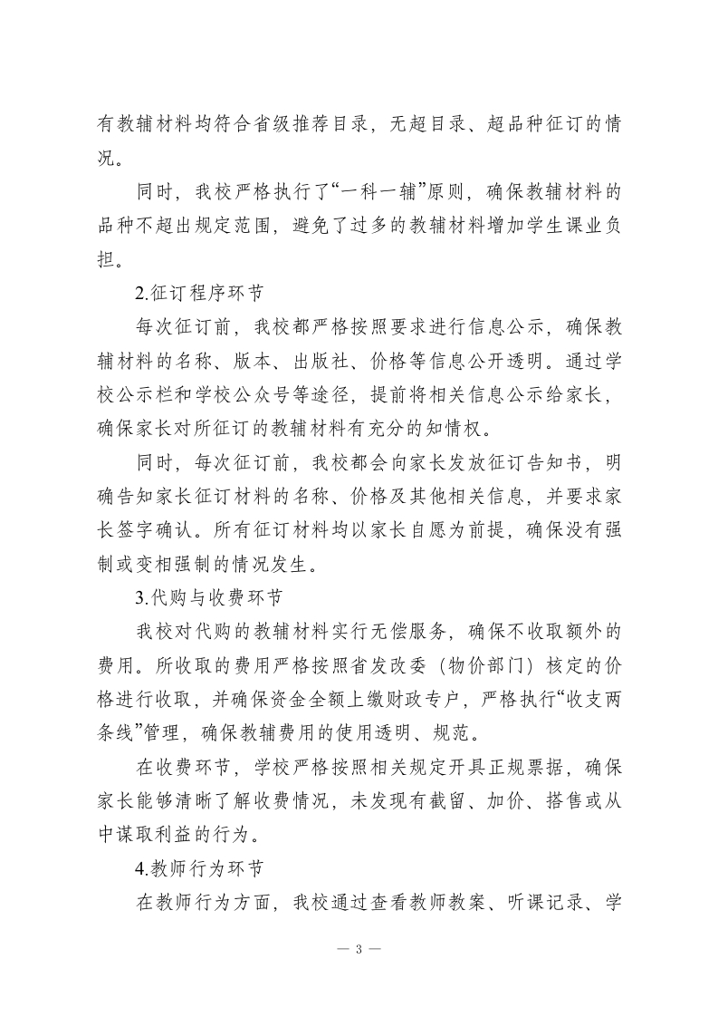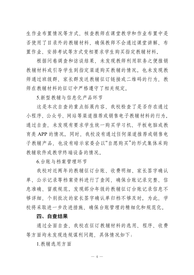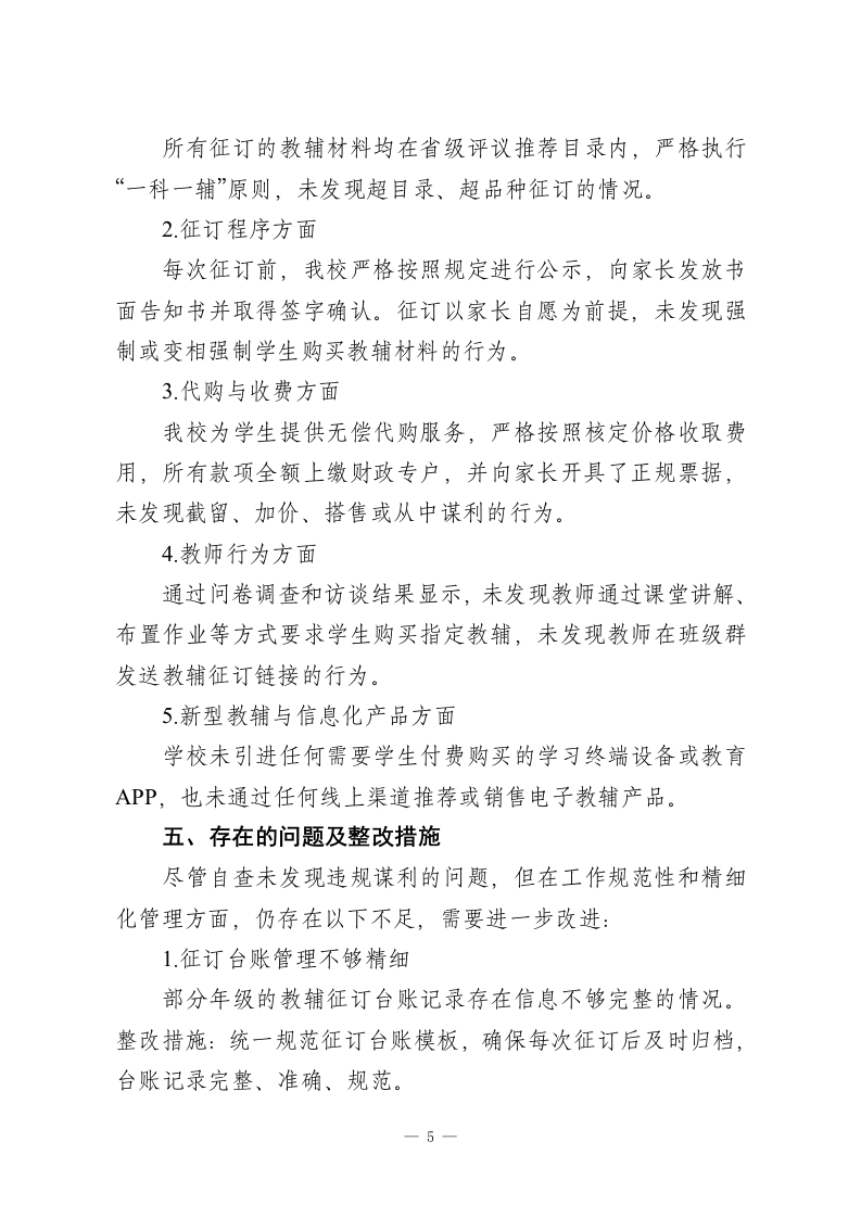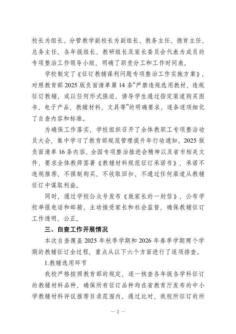 关于2026年中小学征订教辅谋利问题专项整治自查报告为深入贯彻落实教育部《关于开展基础教育规范管理提升年行动的通知》及《基础教育规范管理负面清单(2025版)》精神,认真落实2025年7月全国中小学深化“校园餐”专项整治和开展利用征订教辅购买校服谋利等问题专项整治推进会部署要求,按照省(市、区)教育局关于征订教辅谋利问题专项整治工作的统一安排,我校高度重视、迅速行动,对2025一2026学年教辅材料征订工作进行了全面、深入的自查自纠。现将有关情况报告如下。一、学校基本情况我校是一所公办九年一贯制学校(或:完全小学/初级中学/完全中学),现有教学班XX个,在校学生XX人,在编教师XX人。学校始终坚持立德树人根本任务,严格落实国家和省市关于规范办学的各项规定,致力于为学生提供公平、优质的教育服务。学校设有多个学科组,教师队伍稳定,注重学科之间的协作与互动,同时积极推动学校教育的创新与变革。长期以来,我校高度重视教辅材料的管理与使用,力求通过规范的管理机制,保障学生的学习权益,确保教育质量的不断提升。二、组织领导与工作部署接到上级关于开展征订教辅谋利问题专项整治工作的通知后,学校第一时间召开党政联席会议进行研究部署,成立了以一1