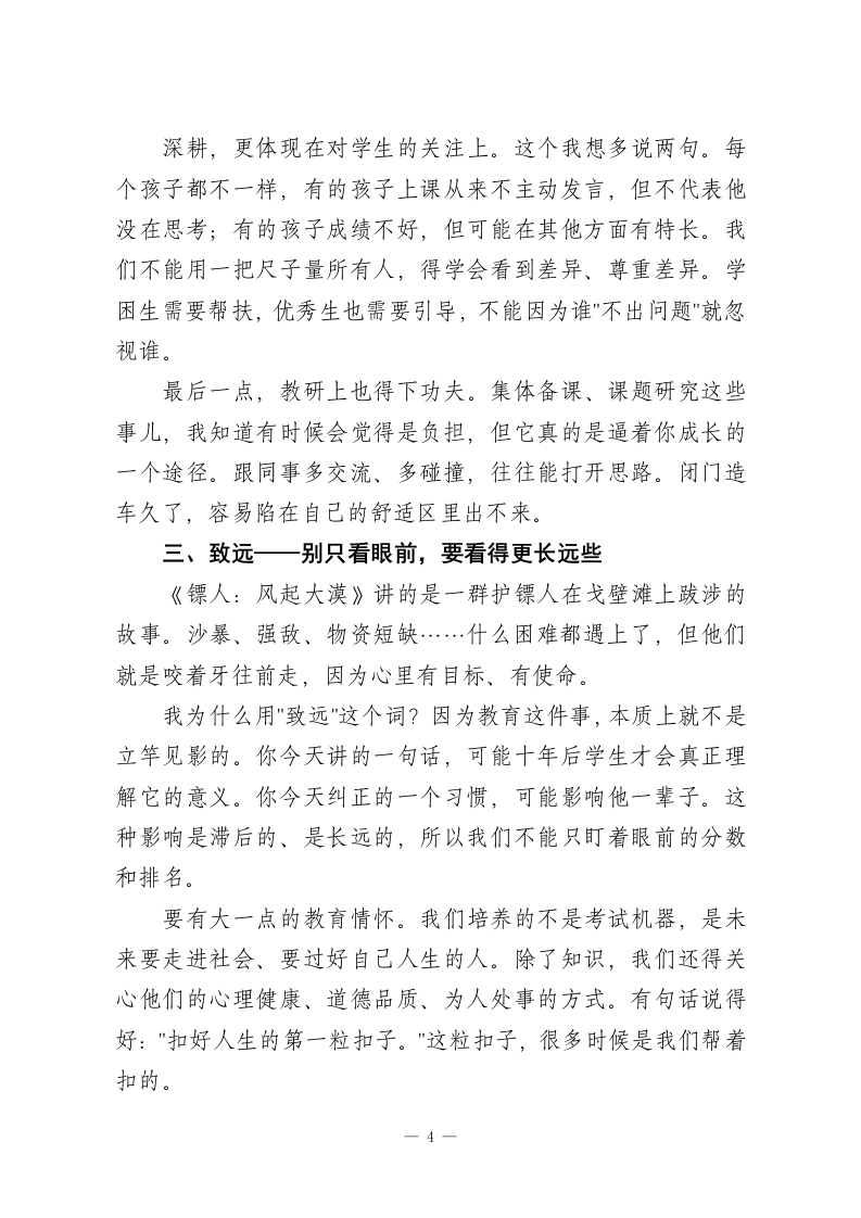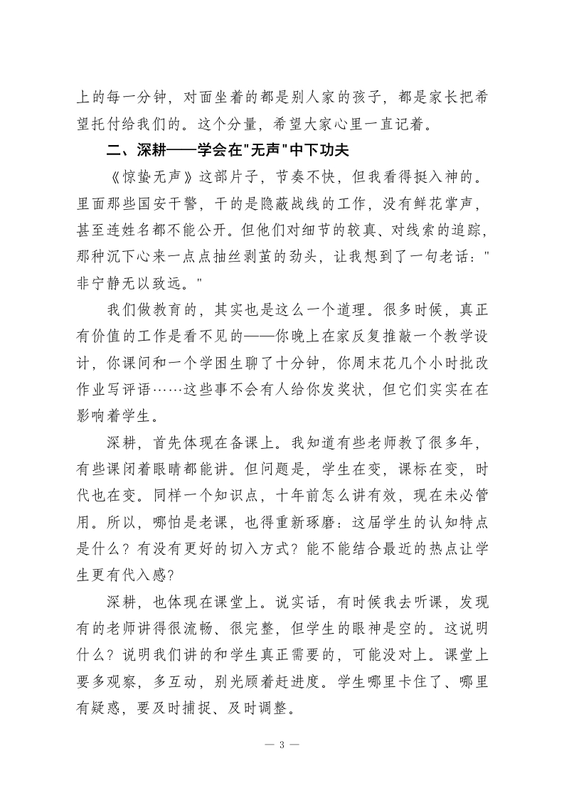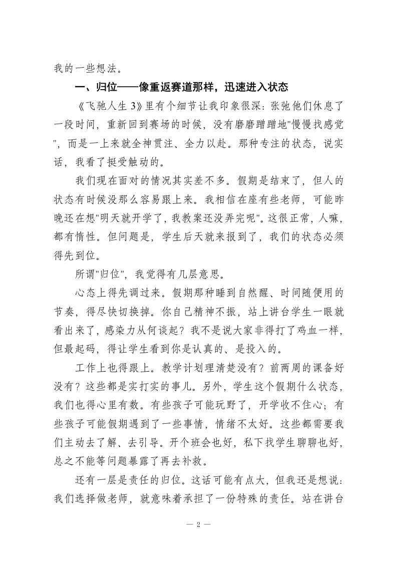 归位,深耕,致远:2026春季新学期第一次教师待会校长开场白,句句说到老师心坎里各位老师:新年好」说实话,站在这儿看到大家,我心里挺踏实的。寒假这二十多天,不知道你们过得怎么样?我估计有人陪孩子写作业写到怀疑人生,有人追剧追到凌晨两三点,也有人出去玩了一圈回来发现胖了好几斤一一这都正常,毕竟一年忙到头,该歇就得歇。但话说回来,今天咱们又坐到一块儿了,新学期也就这么开始了。回头看看2025年,真是不容易的一年。教学改革那几个难啃的骨头,愣是被大家一点点磨下来了。优质课评比我们拿了好几个奖,学生综合素质测评的数据也比前年好看不少,家校沟通这块儿以前总被投诉,去年明显顺畅多了。这些事说起来轻巧,但我知道背后是多少加班、多少备课、多少次和家长磨嘴皮子。所以这里我得正式说一句:谢谢大家,真的辛苦了。今年春节我难得有空,进了几趟电影院。先是看了《飞驰人生3》,后来又看了《惊蛰无声》,最后还补了一部《镖人:风起大漠》。可能是职业病吧,看电影的时候我老往教育上联想。看完之后我就在想,这三部片子传递的东西,其实跟我们这学期要做的事挺像的。今天我就借这三部电影,跟大家聊聊