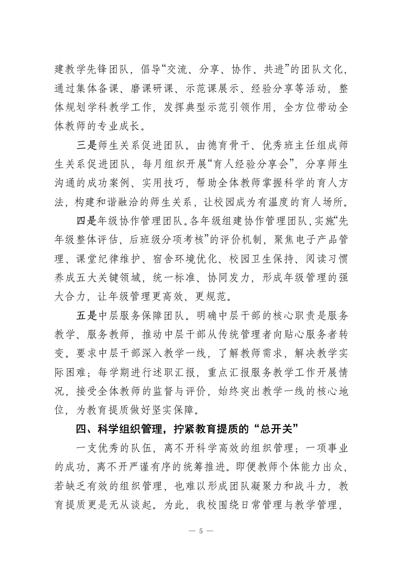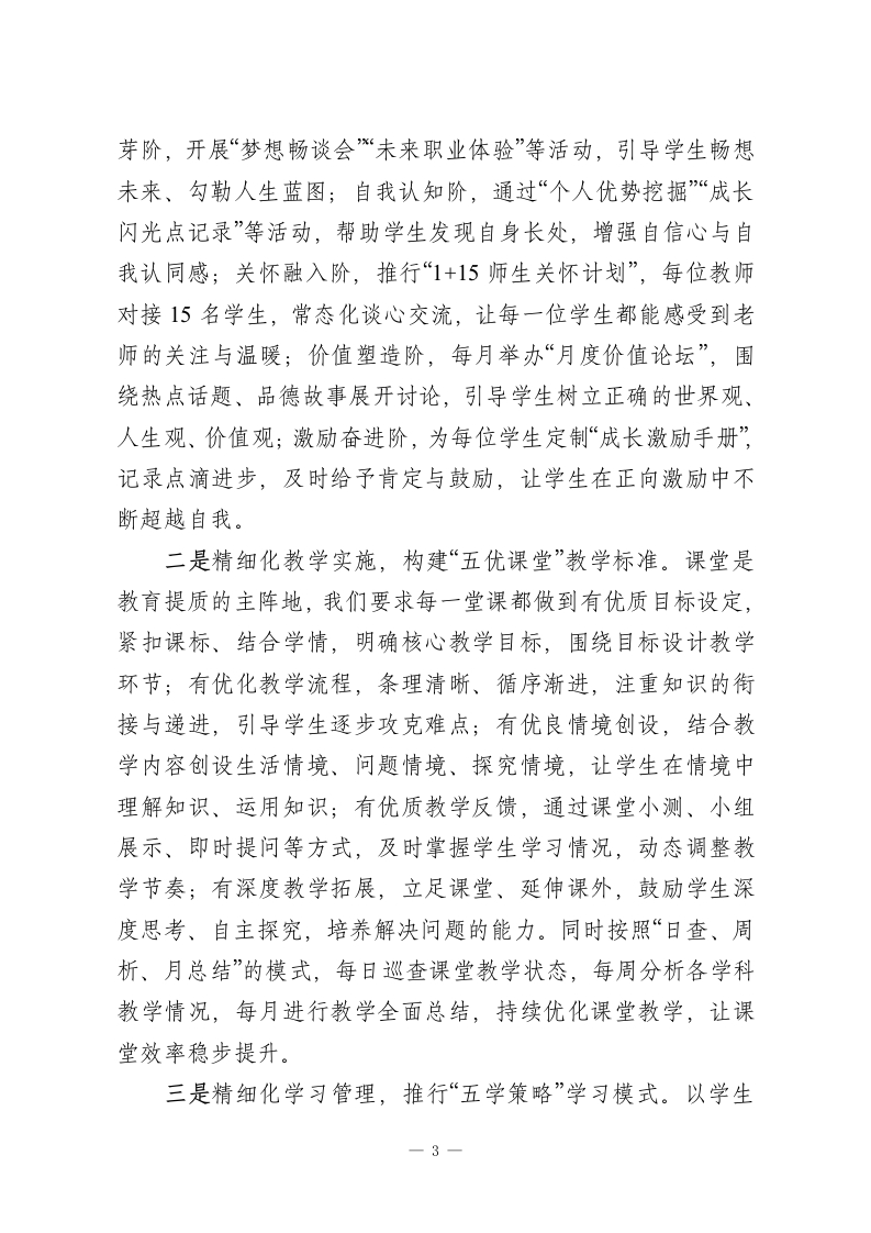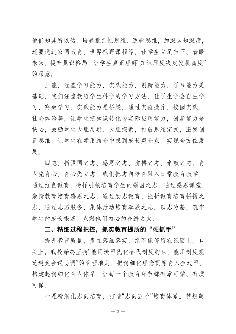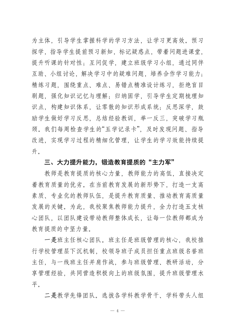 全区提升教育质量会议上校长交流发言:五个行动聚合力,一个目标促提质尊敬的各位领导、亲爱的同仁们:大家好!教育是国之大计、党之大计,提升教育质量是每一所学校的核心使命与永恒追求。学校作为培育人才、传递知识、塑造灵魂的主阵地,教育质量的提升从不是单一环节的发力,而是理念、实践、团队、管理、文化等多要素的协同共振、同向发力。其中,师生同心的紧密联结是基础,以学生为中心的育人理念是根本,挖掘并激发师生的内在潜能则是关键。2026年春季学期,我校围绕教育提质工作进行了一系列实践与探索,总结出教育提质“5+1”法则,即通过五大关键行动,锚定一个核心育人目标,接下来与各位同仁分享交流,共勉共进。一、精准锚定目标,立牢教育提质的“定盘星”教育质量的评估从来都是多元的,分数是重要的评价指标,但绝非唯一标准。如果单纯把分数作为教育的终极目标,很容易陷入唯分数论的误区,就像企业仅以盈利为单一追求,终究难以形成核心竞争力与社会价值。基于此,结合新时代育人要求,我校跳出单一评价维度,精心搭建了“三识三能四志”的教育质量目标架构,让教育提质的方向更清晰、内涵更丰富。三识,即知识视野、认知深度、见识格局。我们倡导不仅要让学生掌握课本知识,更要通过课外阅读、实践探究、主题研学等方式拓展知识视野;不仅要教会学生知其然,更要引导1-