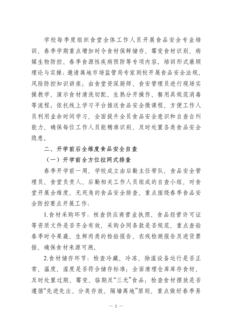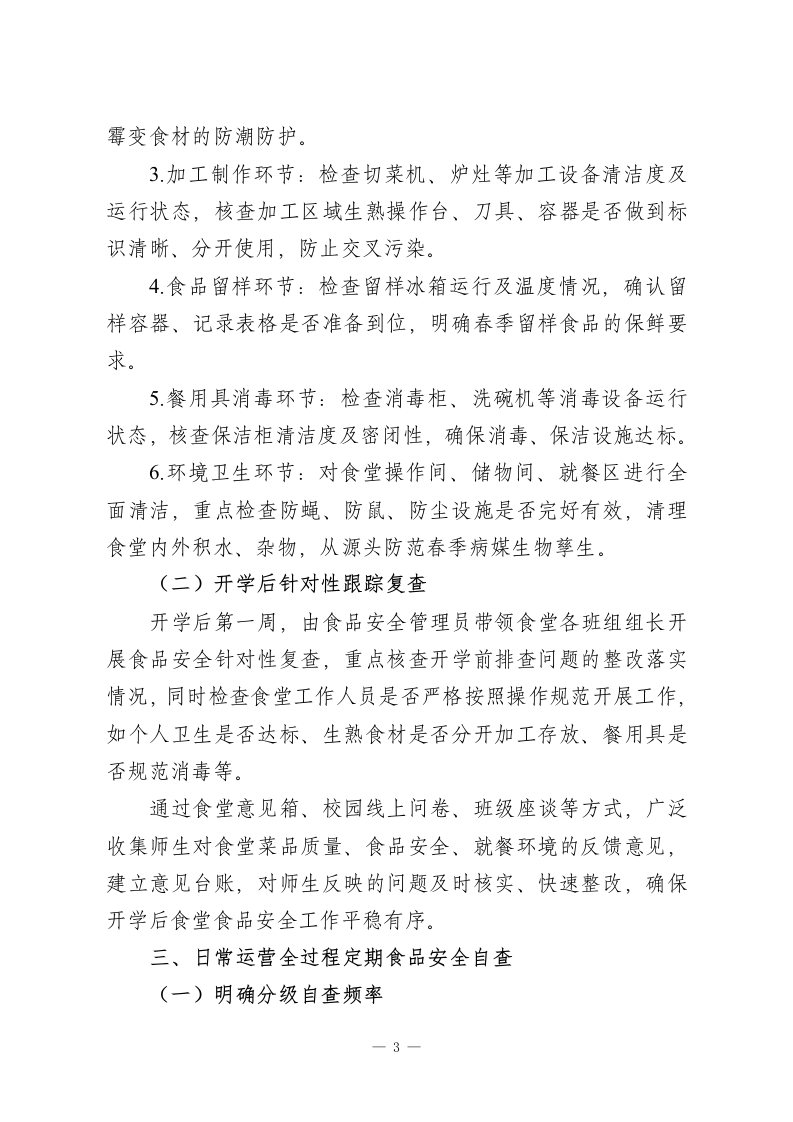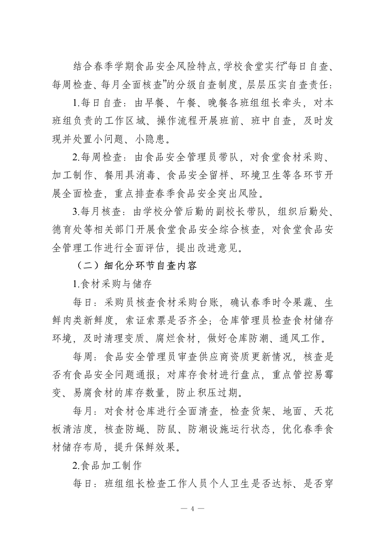 春季学期中小学食品安全自查管理制度一一守牢食安防线,护航师生健康中小学生正处于身体发育的关键时期,校园食品安全直接关系师生饮食健康与生命安全。2026年春季学期气温逐步回升、湿度增加,食材易腐变质、病媒生物开始孳生,食品安全防控压力显著加大。为全面强化学校食品安全管理,切实防范春季食品安全风险,依据《食品安全国家标准餐饮服务通用卫生规范》《餐饮服务食品安全操作规范》等法规要求,结合本校春季学期食堂运营实际,特制定本食品安全自查管理制度。一、食品安全自查机制构建(一)健全常态化自查体系学校食堂管理部门设立专职食品安全管理员,全面统筹组织食品安全自查工作,明确食堂采购员、厨师、保洁员、留样管理员等各岗位人员的食品安全自查职责,形成“专人负责、全员参与、各岗尽责”的自查体系。采购员重点把控食材采购源头安全,厨师聚焦加工制作环节规范操作,留样管理员严格落实食品留样要求,保洁员负责餐用具及环境卫生的自查整改。食品安全管理员结合春季学期食品安全特点,定期分析食堂运营各环节风险点,如春季时令果蔬保鲜难度大、高湿度易导致食材霉变、加工环节生熟交叉污染、病媒生物孳生等,据此制定针对性的自查清单和月度自查计划,明确检查标准、重点环节和完成时限,确保自查工作全覆盖、无死角。(二)开展针对性专业培训1