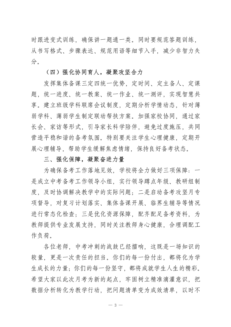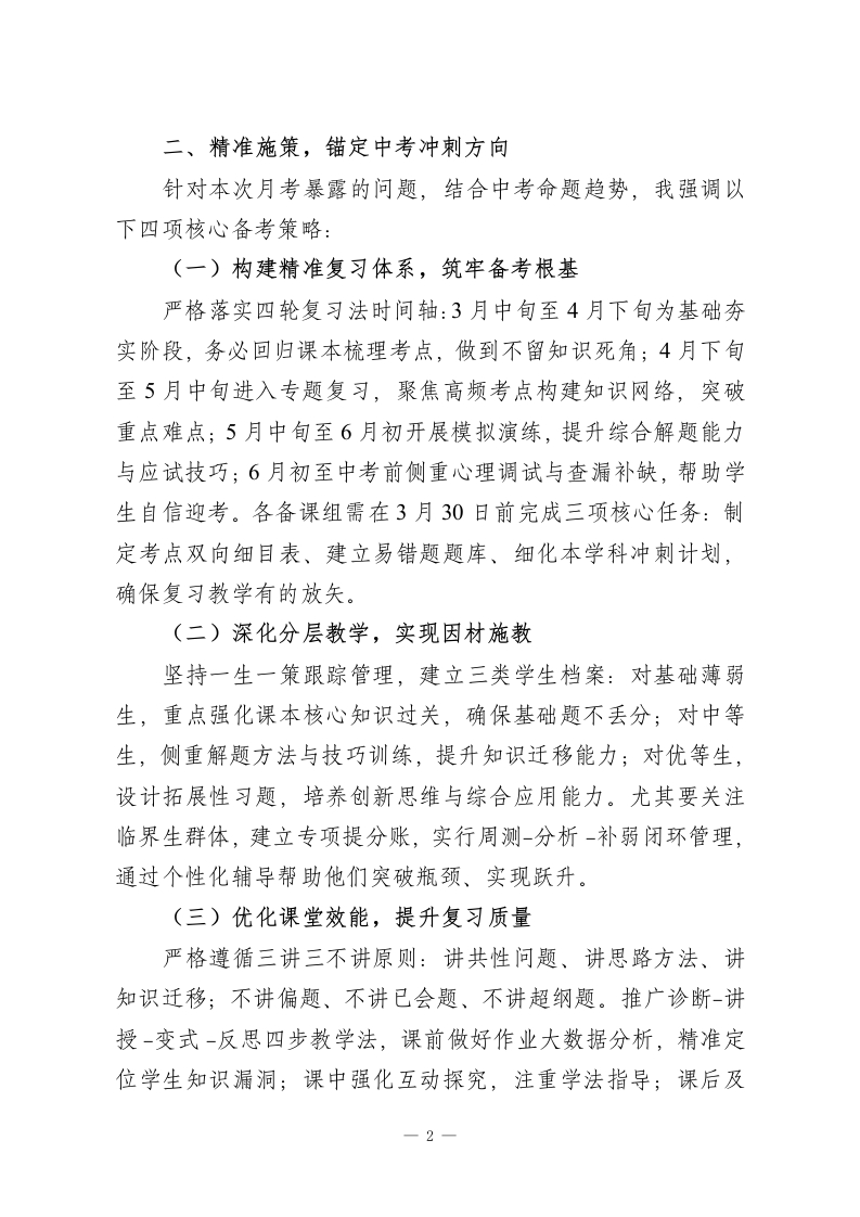 2026九年级第二学期第一次月考分析会上的校长讲话各位老师:大家下午好!春潮涌动处,奋进正当时。今天我们齐聚这里,召开九年级第二学期第一次月考分析会,既是对前段教学工作的复盘总结,更是为中考冲刺吹响精准发力的号角。距离2026年中考仅剩80余天,这次月考作为冲刺阶段的首次全面检测,其诊断价值、导向意义尤为重要。在此,我首先向辛勤耕耘在教学一线的全体九年级教师致以诚挚的敬意!一、数据为基,客观审视月考成效从本次月考数据分析来看,我们既看到了亮点成效,也清醒认识到差距不足。亮点方面,多数班级整体成绩稳中有升,部分学科平均分较上学期期末实现显著提升,尤其基础题型得分率明显提高,这印证了大家前期夯实基础的成效;一批临界生通过针对性辅导,单科成绩实现突破,呈现出良好的上升态势。但同时,我们也必须直面突出问题:一是学科发展不均衡,部分学科压轴题得分率偏低,知识迁移能力有待提升;二是学生个体差异凸显,部分学生存在答题不规范、步骤不完整等非智力失分现象;三是薄弱环节仍未突破,理化生实验操作、综合探究题等题型成为共性短板;四是临界生转化效率有待提高,个别学生偏科问题较为突出。这些问题既是我们接下来的攻坚重点,也是提质增效的关键突破口。1