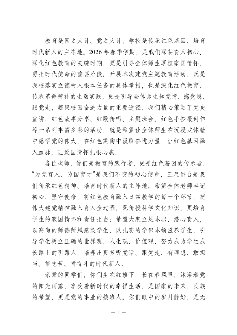 2026年春季学期校长在庆祝建党主题教育活动中的致辞与号召讲话尊敬的各位老师,亲爱的同学们:大家上午好!春潮涌动启新程,红心向党建华章。在这万物复苏、生机盎然的美好时节,我们齐聚校园,隆重开展庆祝建党主题教育活动,共同回望党的百年光辉历程,感悟党的初心使命,传承党的红色基因,凝聚奋进力量。首先,我谨代表学校全体师生,向伟大的中国共产党致以最崇高的敬意和最诚挚的祝福!向辛勤耕耘在育人一线、践行“为党育人、为国育才”使命的全体教职工,致以亲切的问候!向朝气蓬勃、心怀理想、立志听党话、跟党走的全体同学们,致以美好的期许!百年风雨兼程,百年砥砺奋进。从嘉兴南湖的一叶红船启航,到如今引领中国号巨轮驶向民族复兴的壮阔航程,中国共产党历经百年淬炼,始终坚守“为中国人民谋幸福、为中华民族谋复兴”的初心使命,书写了一部波澜壮阔的奋斗史诗。这百年,是坚持真理、坚守理想的百年,是践行初心、担当使命的百年,是不怕牺牲、英勇斗争的百年,更是对党忠诚、不负人民的百年。从革命年代的抛头颅、洒热血,到建设时期的攻坚克难、艰苦奋斗,再到新时代的砥砺前行、勇毅担当,共产党人用初心诠释忠诚,用行动践行使命,带领中国人民实现了从站起来、富起来到强起来的伟大飞跃,创造了一个又一个彪炳史册的人间奇迹。1