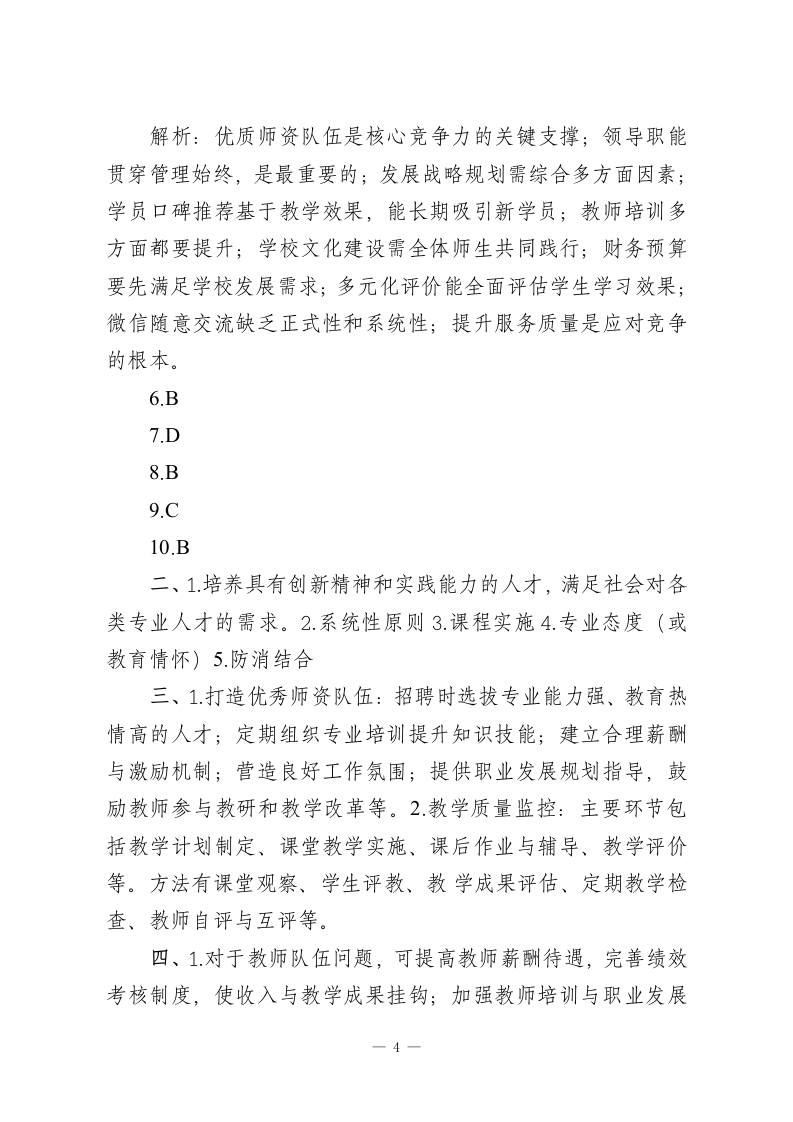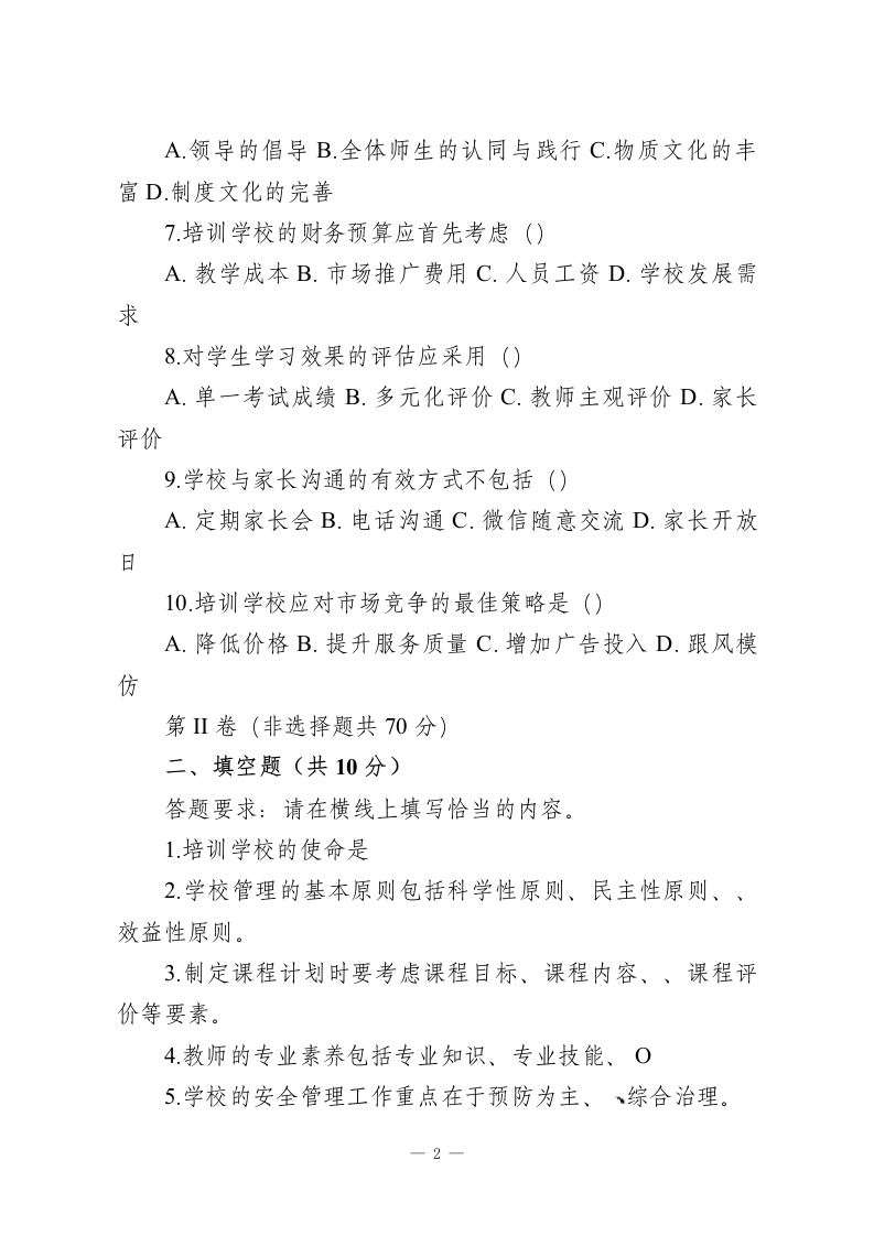 2026年培训学校校长(培训学校管理)试题及答案(考试时间:90分钟满分100分)班级姓名第I卷(选择题共30分)答题要求:本卷共10小题,每小题3分。在每小题给出的四个选项中,只有一项是符合题目要求的。请将正确答案的序号填在括号内。1.培训学校的核心竞争力在于()A.优质的师资队伍B.先进的教学设备C.独特的课程体系D.良好的口碑2.学校管理中,最重要的管理职能是()A.计划B.组织C.领导D.控制3培训学校的发展战略规划应基于()A.市场需求B.学校现有资源C.竞争对手情况D.以上都是4.以下哪种招生方式效果可能最持久()A.线上广告B.举办招生讲座C.学员口碑推荐D.参加教育展会5.教师培训的重点应放在()A.专业知识更新B.教学技能提升C.教育理念转变D.以上都重要6.学校文化建设的关键在于(()—1