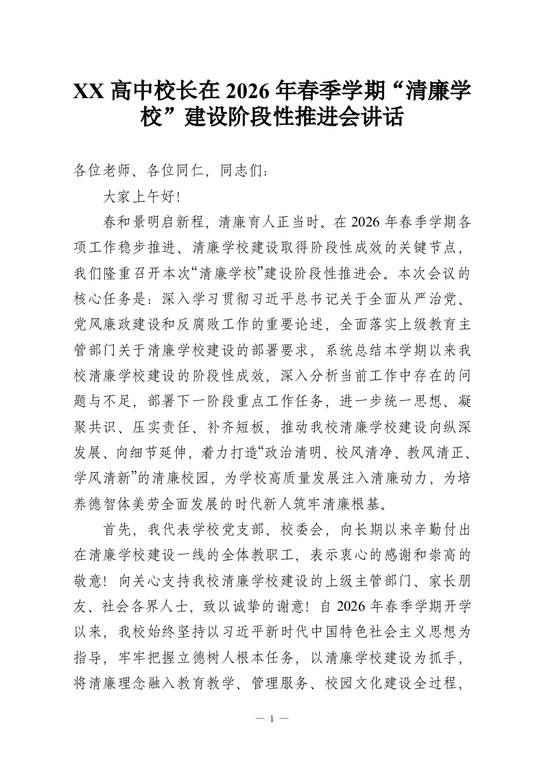 XX高中校长在2026年春季学期“清廉学校”建设阶段性推进会讲话各位老师、各位同仁,同志们:大家上午好!春和景明启新程,清廉育人正当时。在2026年春季学期各项工作稳步推进、清廉学校建设取得阶段性成效的关键节点,我们隆重召开本次“清廉学校”建设阶段性推进会。本次会议的核心任务是:深入学习贯彻习近平总书记关于全面从严治党、党风廉政建设和反腐败工作的重要论述,全面落实上级教育主管部门关于清廉学校建设的部署要求,系统总结本学期以来我校清廉学校建设的阶段性成效,深入分析当前工作中存在的问题与不足,部署下一阶段重点工作任务,进一步统一思想、凝聚共识、压实责任、补齐短板,推动我校清廉学校建设向纵深发展、向细节延伸,着力打造“政治清明、校风清净、教风清正、学风清新”的清廉校园,为学校高质量发展注入清廉动力,为培养德智体美劳全面发展的时代新人筑牢清廉根基。首先,我代表学校党支部、校委会,向长期以来辛勤付出在清廉学校建设一线的全体教职工,表示衷心的感谢和崇高的敬意!向关心支持我校清廉学校建设的上级主管部门、家长朋友、社会各界人士,致以诚挚的谢意!自2026年春季学期开学以来,我校始终坚持以习近平新时代中国特色社会主义思想为指导,牢牢把握立德树人根本任务,以清廉学校建设为抓手,将清廉理念融入教育教学、管理服务、校园文化建设全过程,1