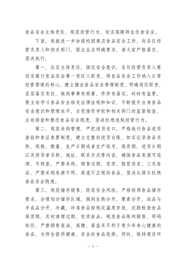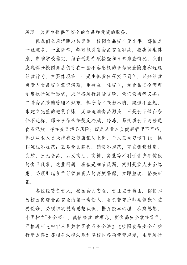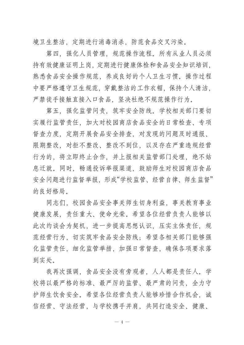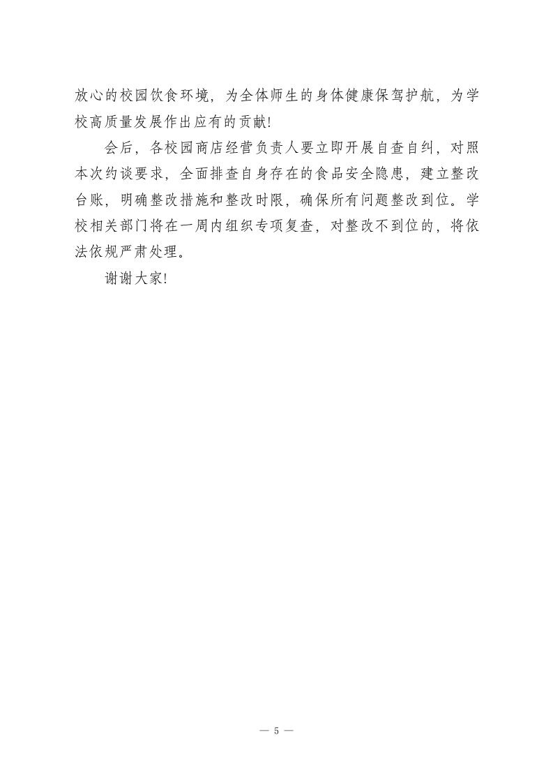 XX学校2026年春季学期校园商店食品安全约谈会校长讲话各位校园商店经营负责人、食品安全管理员,各相关部门负责人:大家上午好!民以食为天,食以安为先。校园食品安全是守护师生身体健康和生命安全的底线工程,是学校工作的重中之重,容不得丝毫懈怠、半点马虎。今天,我们召开XX学校2026年春季学期校园商店食品安全约谈会,核心目的是深入贯彻落实国家、省、市关于校园食品安全工作的各项部署要求,进一步压实校园商店食品安全主体责任,排查食品安全风险隐患,规范经营行为,强化监管力度,切实筑牢校园食品安全防线,为全体师生营造安全、健康、放心的饮食环境。首先,我代表学校领导班子,向长期以来配合学校食品安全管理工作的各位经营负责人,表示诚挚的感谢;同时,也对当前校园商店食品安全工作中存在的问题,提出严肃的警示和明确的要求。校园商店是为师生提供便捷服务的重要场所,其经营行为、食品安全状况,直接关系到每一位师生的身体健康,关系到校园的和谐稳定,更关系到学校的办学声誉。春季学期以来,气温逐渐回升,各类食品易变质、易滋生细菌,是食品安全风险的易发多发期。学校始终高度重视校园食品安全工作,多次开展校园商店食品安全专项检查,总体来看,多数校园商店能够遵守食品安全相关法律法规和学校管理规定,规范经营、诚信1