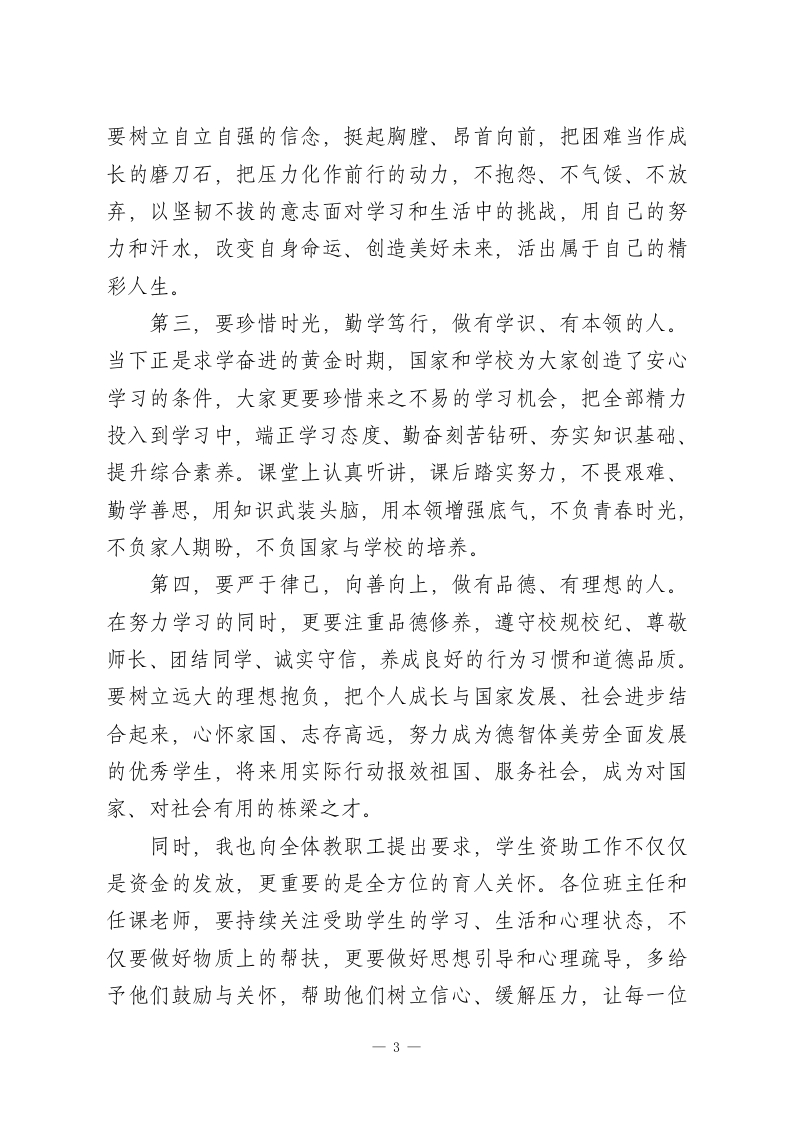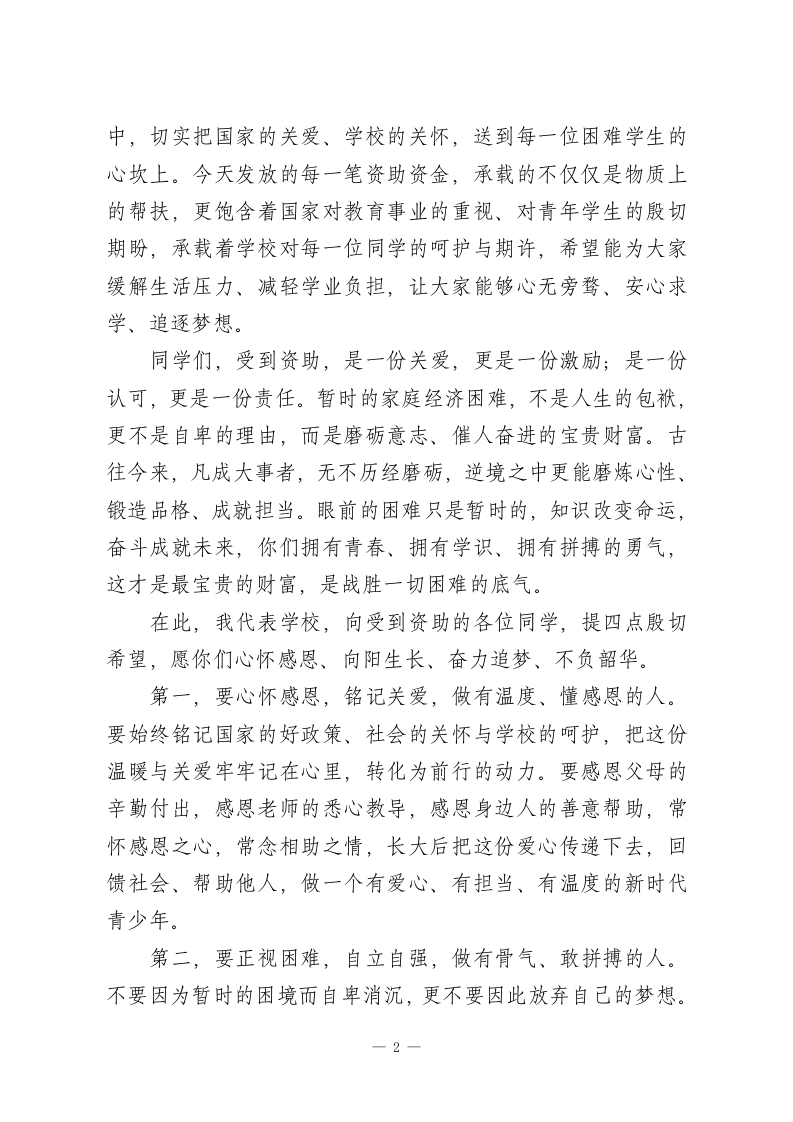 XX学校2026年春季学期学生资助资金发放仪式校长讲话各位老师、亲爱的同学们:大家上午好!春风送暖,爱意绵长;助学筑梦,暖心护航。在这充满生机与希望的初春时节,我们怀着温暖而庄重的心情,隆重举行XX学校2026年春季学期学生资助资金发放仪式。首先,我代表学校党支部、校委会以及全体教职工,向受到资助的各位同学,表示最诚挚的问候和衷心的祝贺!向长期以来关心支持教育事业、落实学生资助政策的各级部门和社会各界,致以崇高的敬意!向精心落实资助工作、细致摸排审核的各位班主任和工作人员,表示衷心的感谢学生资助工作,是国家保障教育公平、守护学生成长、落实民生福祉的重要举措,是一项暖人心、聚民心、筑信心的爱心工程,更是我校践行“以生为本”办学理念、不让任何一名学生因家庭经济困难掉队的庄严承诺。教育公平是社会公平的重要基础,每一个孩子都享有平等接受教育的权利,无论家庭条件如何,都不该被阻断求学之路,都不该因经济压力放弃梦想、辜负青春。学校始终高度重视学生资助工作,严格按照国家和上级教育部门的资助政策要求,坚持公开、公平、公正的原则,通过前期全面摸排、精准识别、规范审核、公示监督等一系列严谨流程,确保每一笔资助资金都能精准发放到真正需要的学生手1