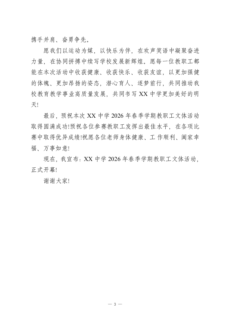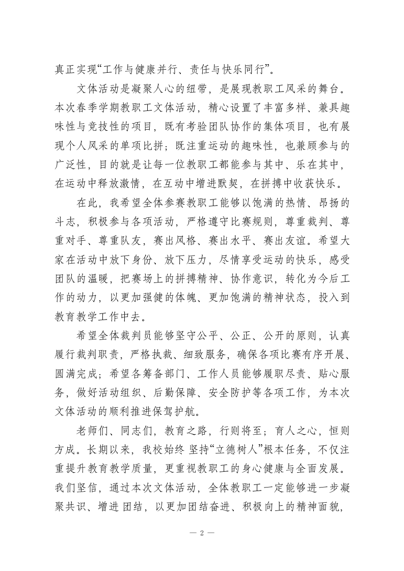 XX中学2026年春季学期教职工文体活动开幕式校长致辞各位老师、同志们:大家上午好!春和景明,万物竞发;凝心聚力,逐梦同行。在这充满生机与希望的美好时节,我们怀着无比喜悦的心情,欢聚一堂,隆重举行XX中学2026年春季学期教职工文体活动开幕式。首先,我代表学校领导班子,向本次文体活动的顺利举办表示热烈的祝贺!向精心筹备、辛勤付出的各部门工作人员、全体裁判员表示衷心的感谢!更向踊跃报名、积极参与本次活动的每一位教职工,致以最诚挚的问候和美好的祝愿!教育是一场温暖的修行,教师是这场修行中最坚定的践行者。春季学期以来,全体教职工立足本职、潜心育人,在三尺讲台上传道授业解惑,在教育教学中默默耕耘奉献,用爱心、耐心和责任心,守护着每一位学生的成长,推动着学校教育教学事业稳步前行。我们深知,各位老师既要承担繁重的教学、教研任务,也要兼顾家庭责任,长期的辛動付出,承载着学校的发展与希望。举办本次教职工文体活动,既是学校落实“以人为本”办学理念的具体体现,也是丰富教职工精神文化生活、缓解工作压力、增强团队凝聚力的重要举措。我们希望通过这场充满活力与温情的文体盛宴,让每一位教职工都能放下忙碌、放松身心,在运动中强健体魄,在交流中增进情谊,在协作中凝聚力量,1
