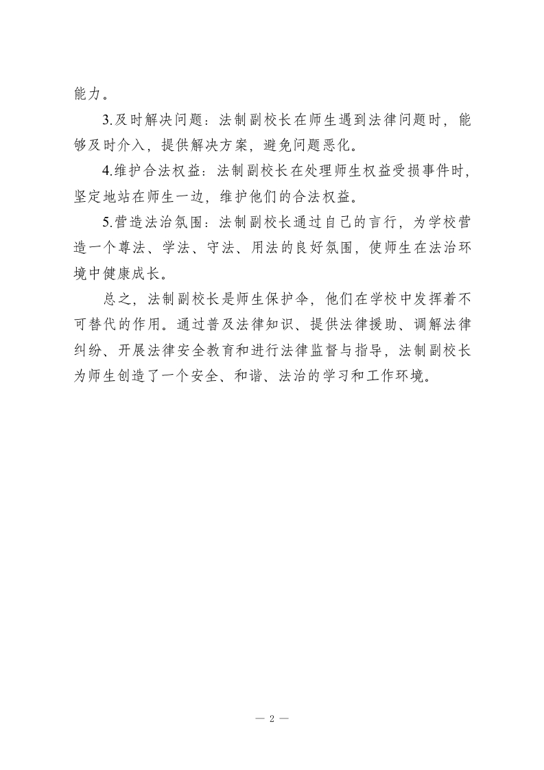 法制副校长是师生保护伞法制副校长在学校中扮演着至关重要的角色,他们不仅是法律知识的传播者,更是师生权益的守护者。以下是关于法制副校长如何成为师生保护伞的详细解析:一、法制副校长的职责1.法律知识普及:法制副校长通过举办讲座、研讨会等形式,向师生普及法律知识,提高师生的法律意识和自我保护能力。2法律咨询与援助:法制副校长为师生提供法律咨询服务,解答他们在学习、生活中遇到的法律问题,并在必要时提供法律援助。3.法律纠纷调解:法制副校长协助学校调解师生之间的法律纠纷,维护校园和谐稳定。4法律安全教育:法制副校长开展法律安全教育,提高师生对法律风险的认识,预防法律事件的发生。5.法律监督与指导:法制副校长对学校的管理制度、教育教学活动进行法律监督,确保学校各项工作符合法律法规要求。二、法制副校长如何成为师生保护伞1.提高法律意识:法制副校长通过多种形式的法律知识普及活动,提高师生的法律意识,使他们在遇到问题时能够自觉运用法律武器保护自己。2.强化自我保护能力:法制副校长通过教授法律知识和实用技能,如防范诈骗、应对校园欺凌等,增强师生的自我保护一1一