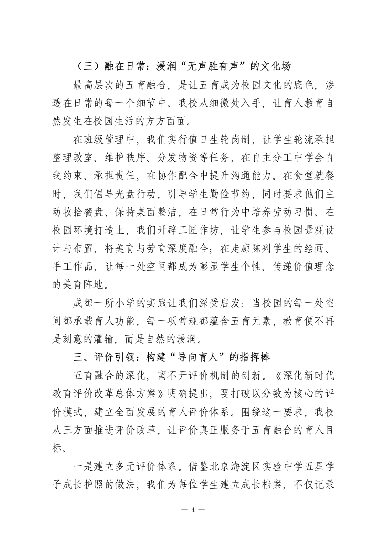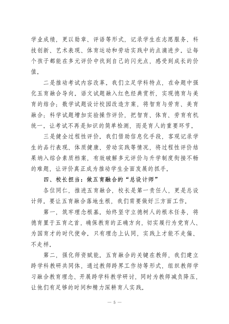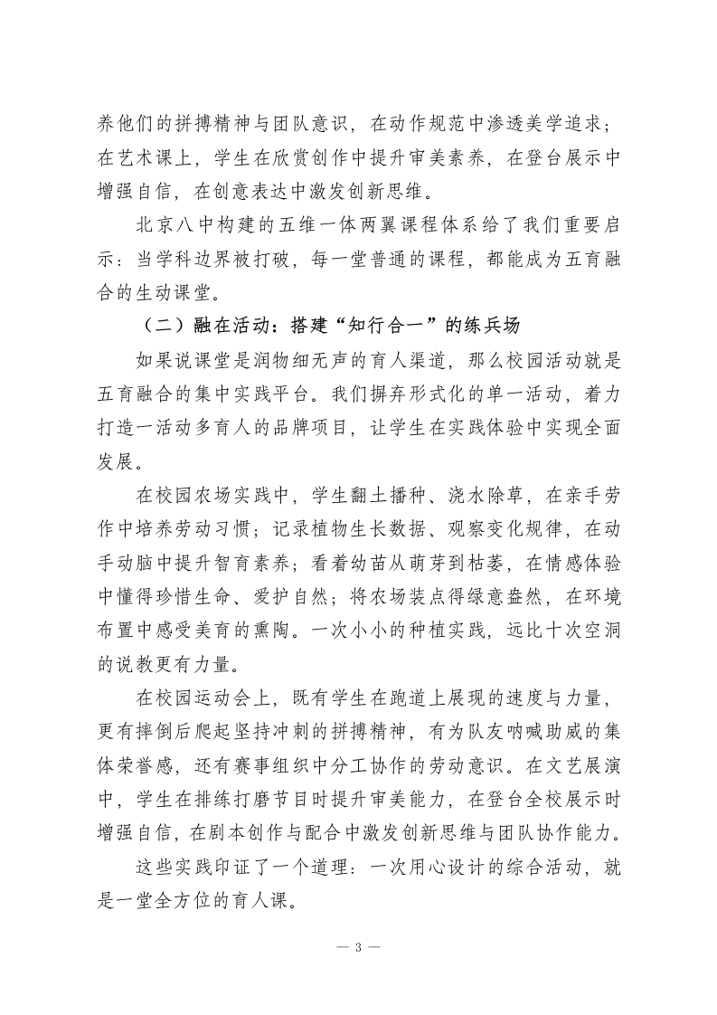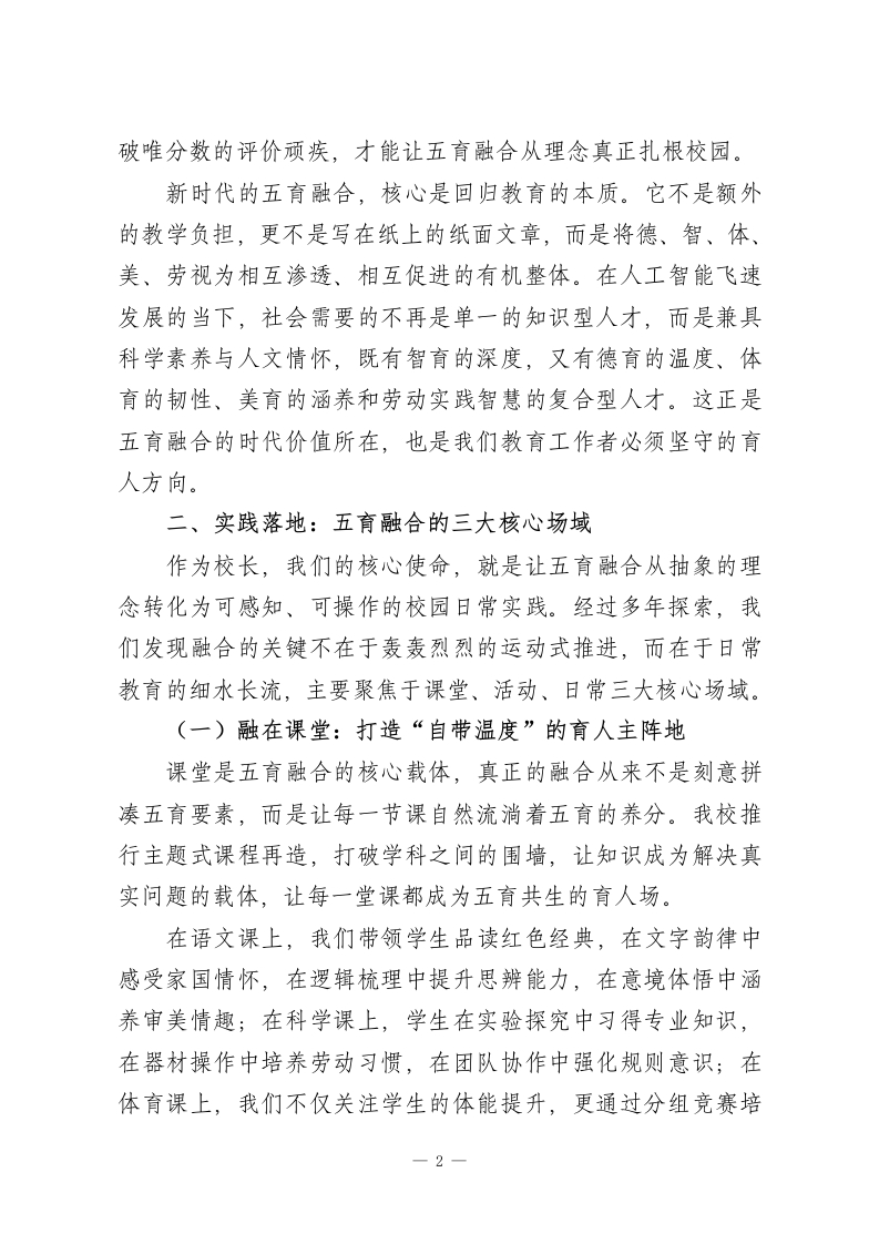 校长论坛发言:从“五育并举”到“五育融合”,到底“融”在哪里?尊敬的各位教育同仁:大家好!今天,很荣幸能在校长论坛上,与各位共同探讨五育融合这一新时代教育变革的核心命题。从五育并举到五育融合,看似一字之差,实则是教育回归本质、回应时代需求的深刻转型。接下来,我将结合我校的实践探索,从理念认知、实践落地、评价引领和校长担当四个方面,分享一些思考与做法。一、理念破局:从“并列并举”到“有机共生”的认知升级坚持中国特色社会主义教育发展道路,培养德智体美劳全面发展的社会主义建设者和接班人,这一重要论述为我们指明了教育的根本方向。回望百年教育历程,从蔡元培先生提出五育并举、奠定现代人格教育根基,到新时代将劳动教育纳入顶层设计、构建起五育有机统一的政策框架,五育理念的演进始终紧扣时代对人才培养的核心诉求。但在实际办学过程中,我们普遍面临着实践与理念脱节的困境:德育沦为班会课的空洞说教,智育只盯着纸笔考试的分数,体育美育成了少数特长生的专属舞台,劳育则简化为一次性的卫生大扫除。这种机械拼凑的融合方式,无法让五育产生真正的化学反应,反而让师生陷入赶场式的疲惫。而教育评价作为教育发展的指挥棒,正是破解这一困局的关键一一唯有打1-