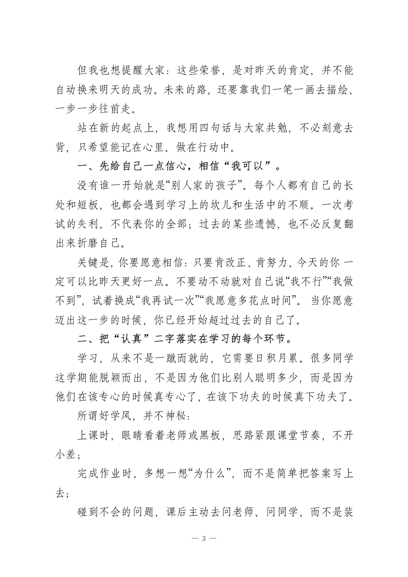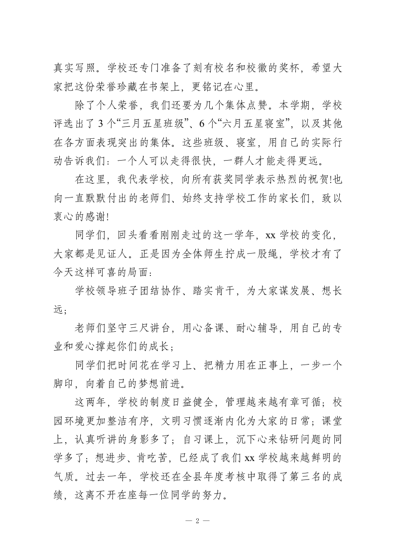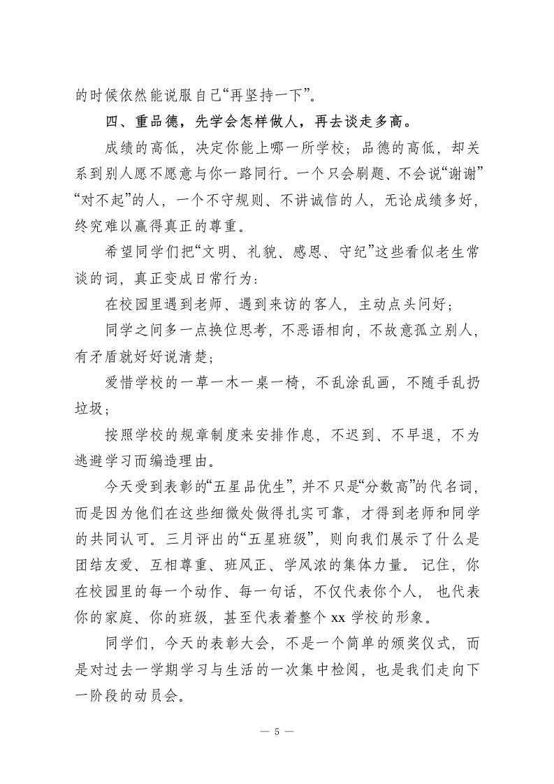 校长在优秀学生表彰大会上讲话:表彰优秀,一起向未来!老师们、同学们:大家上午好」今天,我们在这熟悉而又充满生机的校园里,隆重举行本学期学生表彰大会。此时此刻,礼堂里的每一阵掌声,都是对努力的肯定、对坚持的致敬。待会儿,将有一批同学走上台前,他们当中,有25名认真负责、甘愿付出的优秀学生干部,有20名在品德修养上表现突出的五星品优生,还有40名勤学刻苦、成绩优良的五星品学生。这些奖项,并不是临时起意,而是学校每个学期都坚持开展的一项重要工作。优秀学生干部,是从班干部和学生会干部中,依据他们平时履行职责的态度和效果,一点一滴考量出来的;五星品优生,是按照德育分进行排名,每个学段、每个学期会评出10名,在文明礼仪、遵规守纪、团结友爱等方面都经得起检验;五星品学生,主要依据期未考试成绩,不仅包含各学段前10名的同学,也特别把进步最大的10名同学纳入表彰范围,让“后来居上”的力量同样被看见。今天受到表彰的先进个人共有115名,占到全校430名同学的27%。这些数字背后,是一串串早起的闹钟、一道道演算过的题目、一次次主动担当的身影,也是我们学校育人质量的1