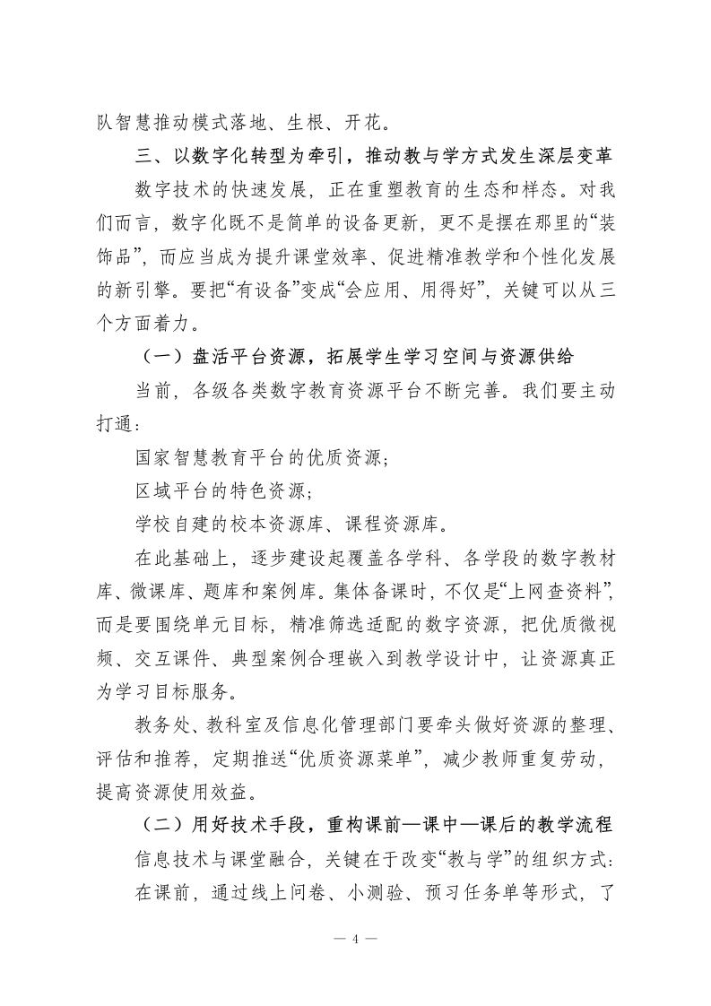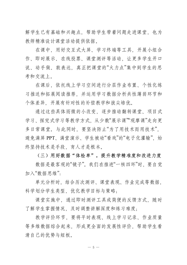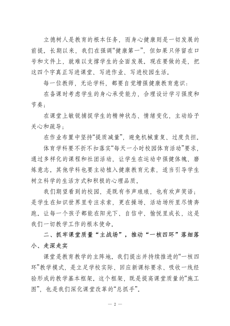 学校教学工作会:数字赋能课堂,这5大变化不容错过!老师们、同志们:上午好!伴随着春光渐浓,新学期的各项工作已经全面展开。今天我们召开全校教学工作会议,主题鲜明,就是紧紧围绕“数字赋能、课堂深耕”,系统谋划和推进本学期教学工作。既是一次对过去经验的梳理总结,也是一次对未来路径的再思考、再部署,更是一场凝心聚力、共推高质量发展的动员会。刚才,分管教学的校领导和各职能部门的负责同志,围绕新学期教学重点任务、常规管理要求和教研工作安排作了详细说明,目标清晰、措施具体。希望全体教师会后认真学习领会,对照要求逐一落实,在执行中不断优化细化,真正把会议精神落到课堂、体现在质量上。一个学校办学水平如何,最终要看教学质量;而教学质量,归根结底体现在一节一节“家常课”的日常表现上。现在,教育数字化转型加速推进,新课标全面进入落地深化阶段,传统教学方式正在被重新审视。面对机遇与挑战并存的新形势,我们必须牢牢抓住课堂这个“牛鼻子”,顺势而为、主动作为,在改革中寻找新动力,在创新中培育新优势。下面,我结合前面几位同志的部署安排,就本学期教学工作再谈几点意见,与大家交流共勉。一、把学生健康成长作为一切教学工作的出发点和落脚点一1