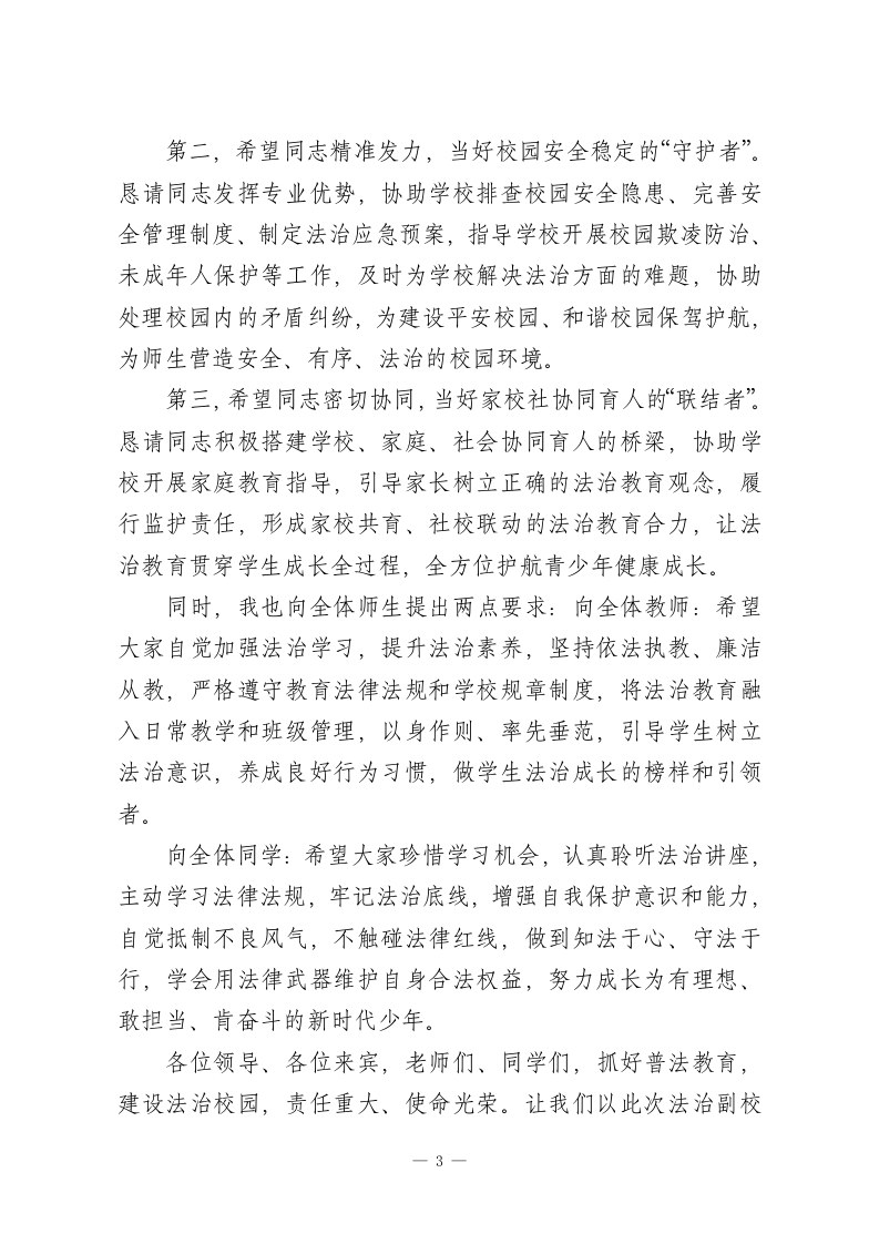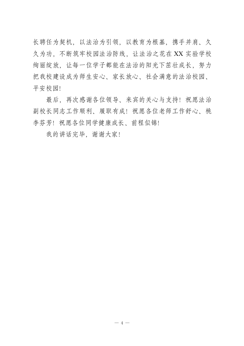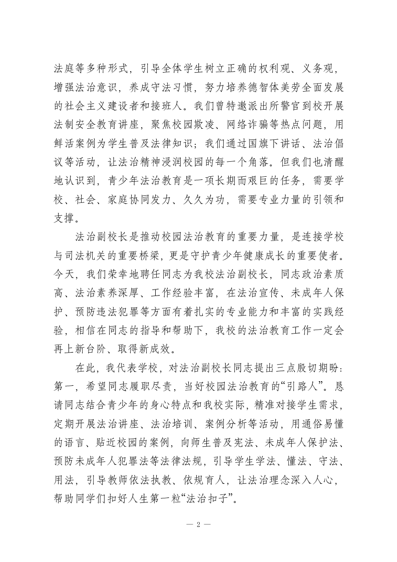 抓好普法教育建设法治校园一一XX实验学校法治副校长聘任仪式讲话尊敬的各位领导、各位来宾,亲爱的老师们、同学们:大家上午好!春和景明,万象更新,在这充满希望与生机的时节,我们怀着无比诚挚的心情,隆重举行XX实验学校法治副校长聘任仪式。首先,我代表学校全体师生,向百忙之中莅临本次仪式的各位领导、来宾表示最热烈的欢迎!向接受聘任的法治副校长同志,致以最诚挚的祝贺和最衷心的感谢!法治是治国安邦的基石,更是校园育人的底线。青少年是国家的未来、民族的希望,加强青少年法治教育,培养青少年法治意识和法治素养,是落实立德树人根本任务的重要举措,是护航青少年健康成长、预防未成年人违法犯罪的关键环节,更是建设平安校园、和谐校园的重要保障。习近平总书记多次对法治宣传教育工作作出重要指示,强调要深入开展法治宣传教育,增强全民法治观念、培育全民法治信仰,为全面依法治国夯实社会基础。而青少年法治教育作为国民教育的重要组成部分,更是重中之重,关乎一代又一代人的健康成长,关乎社会的和谐稳定,关乎国家的长治久安。长期以来,XX实验学校始终高度重视法治教育工作,严格落实《全国教育系统开展法治宣传教育的第八个五年规划(2021一2025年)》要求,坚持把法治教育融入教育教学、校园管理、文化建设全过程,通过法治讲座、主题班会、法治宣传、模拟1
