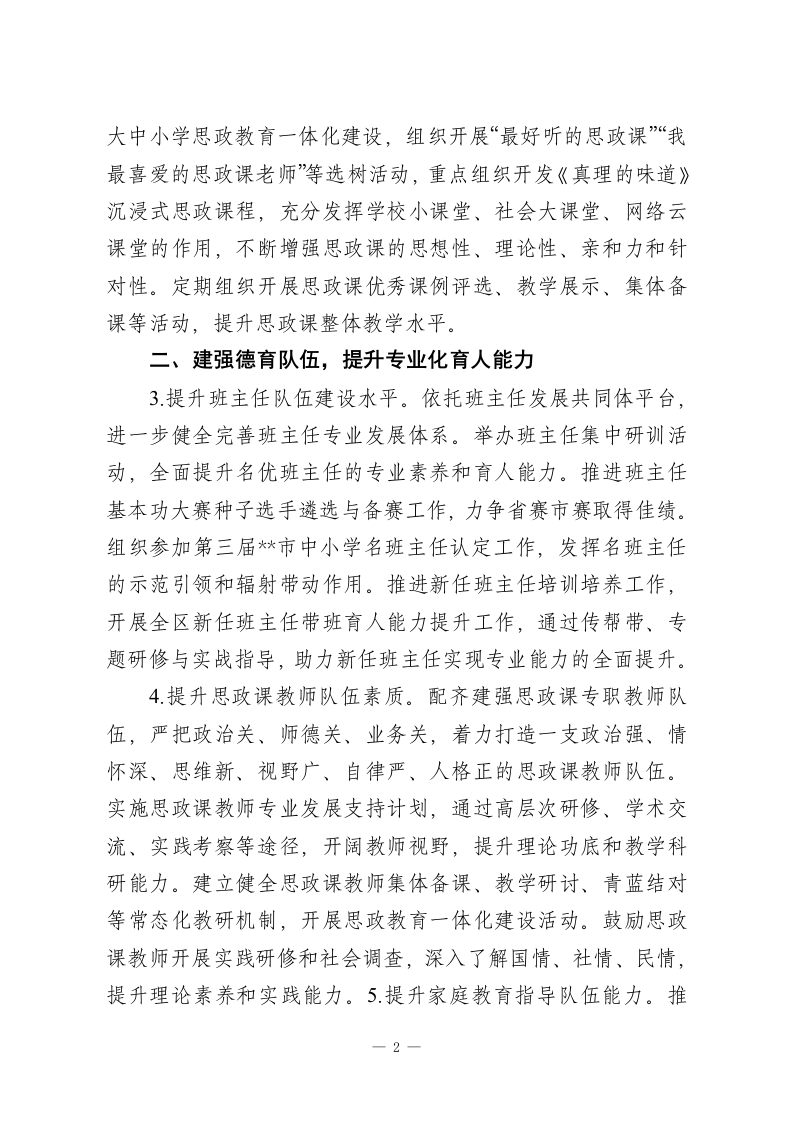 2026年区中小学德育工作要点2026年全区中小学德育工作指导思想和总体要求是坚持以习近平新时代中国特色社会主义思想为指导,落实立德树人根本任务,强化思想引领、夯实根基,坚持铸魂育人、以文化人,培育和践行社会主义核心价值观,不断提升中小学德育工作实效和水平,努力培育德智体美劳全面发展的中国特色社会主义事业建设者和接班人。一、强化铸魂育人,筑牢理想信念根基1.扎实开展系列主题教育活动。深入开展“学习新思想,做好接班人”主题教育,结合纪念中国共产党成立105周年、红军长征胜利90周年、抗日战争胜利81周年等重要时间节点,组织开展“强国复兴有我”等教育实践活动,依托慈城革命烈士陵园、真理园等本地红色资源,开展沉浸式红色教育。推进社会主义核心价值观教育进教材、进课堂、进头脑,开展“新时代好少年”学习宣传活动,选树一批可亲可敬可学的青少年榜样。常态化开展爱国主义、集体主义、社会主义教育,融入国情教育、国防教育、民族团结进步教育,引导学生增强国家意识和民族自豪感。加强法治教育、劳动教育、生态文明教育,培养学生法治观念、劳动精神和生态文明意识。2持续推进中小学思政课建设。全面贯彻党的教育方针,落实思政课关键课程地位,深化思政课教学改革创新,积极探索符合不同学段学生认知规律的教学模式与方法,大力推广案例式、探究式、体验式教学。持续打造大思政工作品牌,推进1