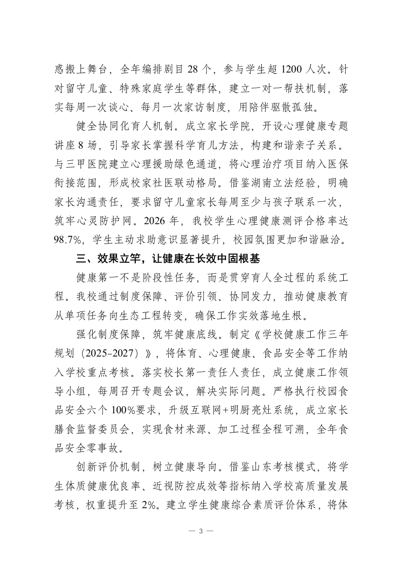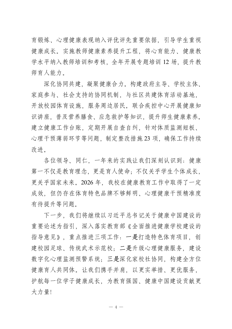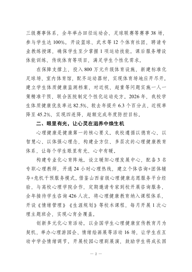 2026学校健康教育工作报,校长发言:践行健康第一理念,护航学子茁壮成长尊敬的各位领导、同仁:大家好!今天,我怀着对教育事业的赤诚与担当,汇报我校2026年践行健康第一教育理念的工作实践。习近平总书记深刻指出:“要坚持健康第一的教育理念,加强学校体育工作,推动青少年文化学习和体育锻炼协调发展。”这一重要论述为我们指明了育人方向。一年来,我校紧扣身心双健、全面发展目标,以三大举措破解育人难题,让健康之花在校园绽放。一、身上有汗,让学生在运动中强体魄我们坚信,强健的体魄是健康成长的根基。围绕让每个学生走出教室、走向操场的目标,我校全面落实教育部学生体质强健计划,构建课程+活动+保障三位一体的体育育人体系。在课程设置上,严格执行每天1节体育课、2小时综合体育活动刚性要求,义务教育阶段实现体育课全覆盖,高中阶段每周不少于2节体育课,无体育课当天安排45分钟专项锻炼。创新推行15分钟活力课间,摒弃课间圈养现象,设计跳绳挑战赛、趣味障碍跑等20余项活动,确保班班有特色、人人有参与。体育课原则上全部户外开展,建立运动负荷监测机制,杜绝不出汗的体育课,让学生在跑跳中增强体能。在活动载体上,打造天天有锻炼、周周有赛事的运动氛围。借鉴浙江长兴县天天体育周周赛经验,构建班级、年级、校级—1