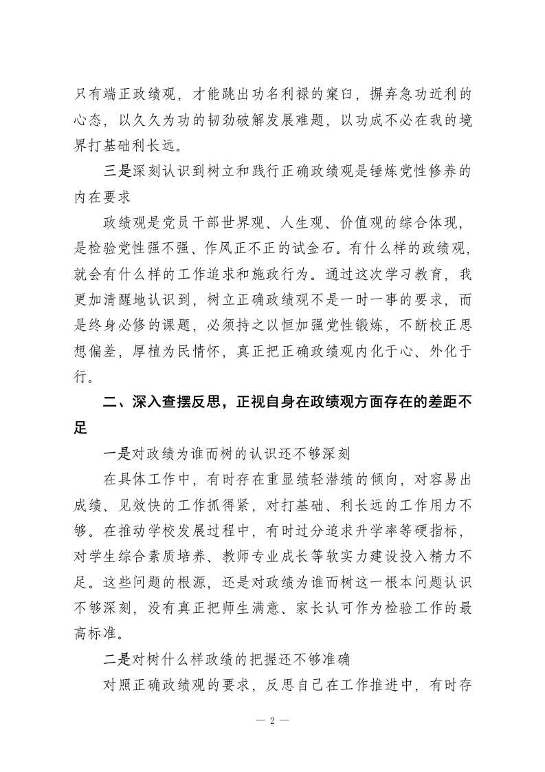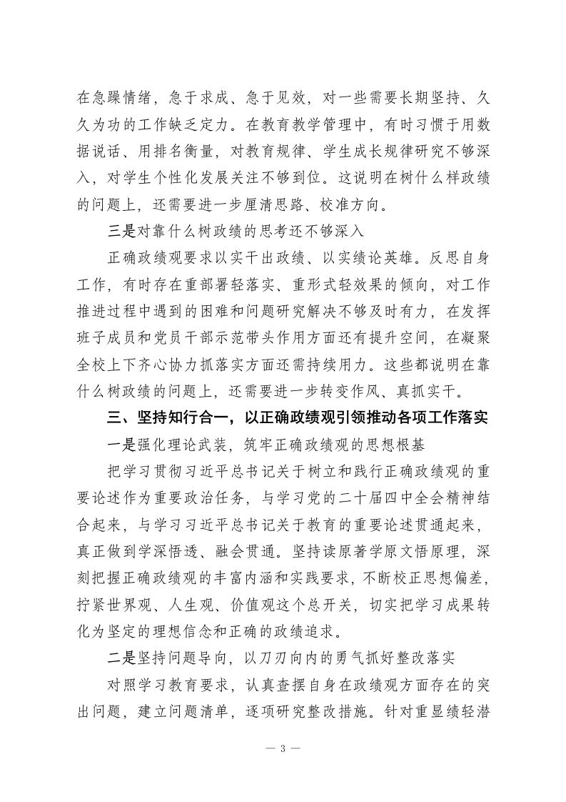 XX一中党委书记树立和践行正确政绩观学习教育读书班研讨发言材料同志们,按照中央部署和上级党委安排,今年在全党开展树立和践行正确政绩观学习教育。通过读书班的集中学习和深入研讨,我对正确政绩观的内涵要求有了更加深刻的理解和把握。下面,结合学习思考和工作实际,谈几点认识和体会。一、深化思想认识,准确把握正确政绩观的深刻内涵一是深刻认识到树立和践行正确政绩观是坚守初心使命的政治要求习近平总书记反复强调,政绩观正确与否,关系到党和人民事业发展。作为一名教育工作者,从事的是为党育人、为国育才的神圣事业,肩负着培养社会主义建设者和接班人的历史重任。政绩观出了偏差,办学方向就会偏离,育人使命就会落空。中央专门部署这次学习教育,就是要引导党员干部从政治高度认识政绩观的极端重要性,把为民造福作为最大政绩,把实事求是为民务实作为根本遵循,确保各项工作始终沿着正确方向前进。二是深刻认识到树立和践行正确政绩观是破解发展难题的现实需要当前,学校正处于高质量发展的关键时期,既面临难得的发展机遇,也面临诸多困难挑战。升学压力与素质教育如何统筹,尖子生培养与面向全体如何兼顾,办学规模扩大与教育质量提升如何同步,这些问题的破解都需要正确政绩观的引领。1