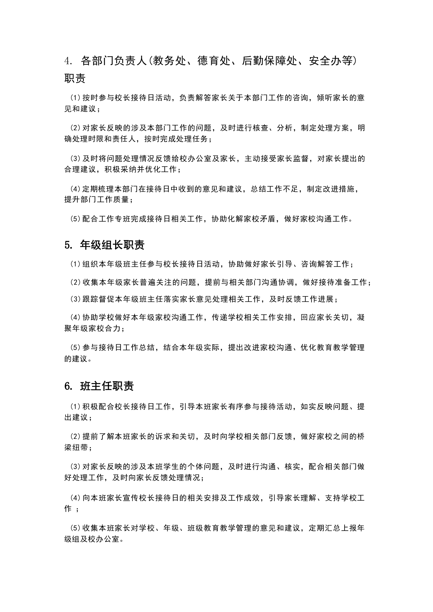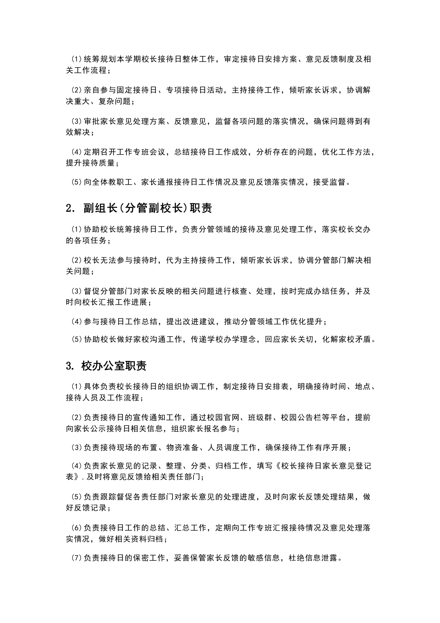 XX P中学2026年春季学期校长接待日安排及家长意见反馈为深入贯彻落实立德树人根本任务,搭建学校与家长高效沟通的桥梁,倾听家长心声、回应家长关切、凝聚家校合力,及时解决学生成长、学校发展过程中存在的问题,不断优化办学质量、提升管理水平,切实保障学生全面发展、健康成长,结合我校2026年春季学期办学实际,特制定本校长接待日安排及家长意见反馈制度。本安排及反馈制度适用于本学期所有校长接待日活动的组织、开展、落实及家长意见的收集、处理、反馈全流程,全体教职工、学生家长均需严格遵守、积极配合。校长接待日是学校践行“以生为本、家校共育”办学理念的重要举措,是畅通家校沟通渠道、接受家长监督、改进学校工作的重要途径。通过常态化、规范化开展校长接待日活动,让家长全面了解学校的教育教学管理、师资建设、校园安全、学生培养等各项工作,及时反馈学生在校、在家的表现及诉求,共同探讨教育方法、破解教育难题,形成“学校主导、家长参与、家校协同、共建共育”的良好教育生态,推动我校教育教学工作持续高质量发展。总则(一)制定目的1.搭建家校沟通桥梁,畅通家长诉求表达渠道,倾听家长对学校教育教学、管理服务、校园建设等方面的意见和建议,及时回应家长关切;2.接受家长监督,规范学校办学行为,及时发现学校工作中存在的不足,优化工作流程、改进工作方法,提升学校管理水平和办学质量;3.凝聚家校合力,引导家长积极参与学校教育管理,形成家校协同育人共识,共同为学生营造良好的成长环境,促进学生德智体美劳全面发展;4.宣传学校办学理念、办学特色及各项工作部署,让家长全面了解学校发展规划、教育教学成果,增强家长对学校的信任和支持;5.及时化解家校矛盾,妥善处理家长反映的各类问题,维护学校正常教育教学秩序,构建和谐家校关系。(二)适用范围