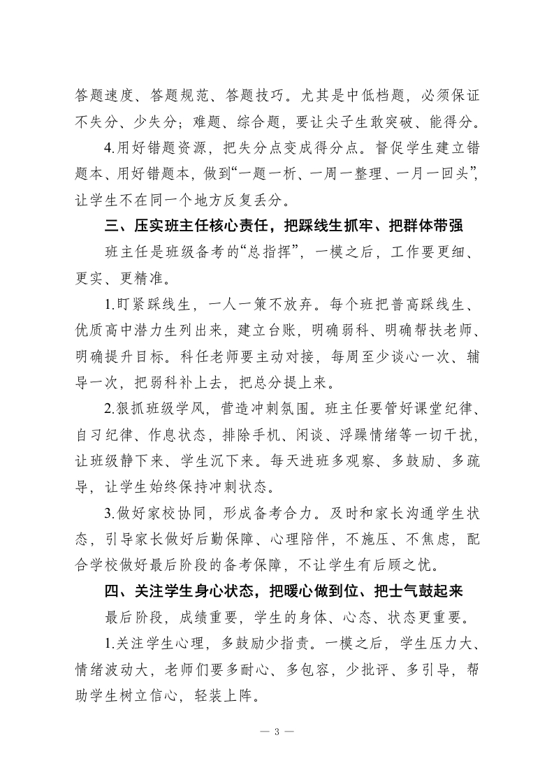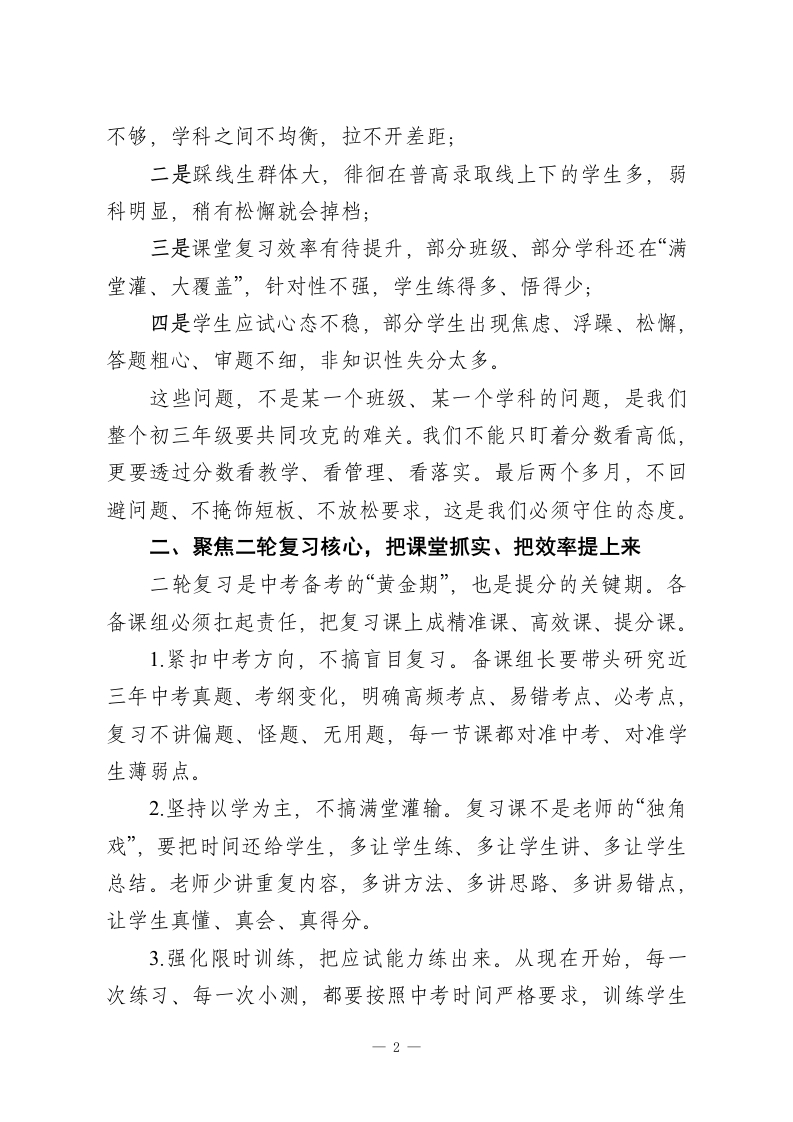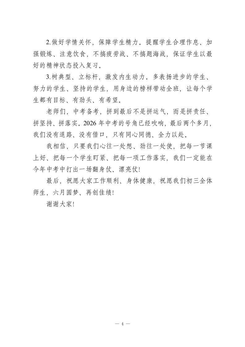 初三一模质量分析暨备考推进会上校长讲话:锚定短板精准发力冲刺逆袭各位初三的老师们:大家下午好!今天我们把大家召集起来,开这次一模质量分析会,没有多余的客套,核心就一件事:对着一模找问题、盯着问题定措施、憋着一股劲冲中考。一模不是终点,是我们中考备考路上最关键的一次“体检”,考出来的分数、暴露出的问题,比任何模拟卷都真实、比任何说教都管用。刚才年级组把整体成绩、各班情况、学科差距都做了细致分析,数据摆在面前,优势我们心里有数,短板我们更要直面不回避。首先,我代表学校,向这段时间起早贪黑、盯班上课、批改辅导的全体初三老师,说一声辛苦了!这段时间,大家放弃了休息时间,陪着学生刷题、讲卷、谈心,每一分成绩的背后,都是大家的付出。但成绩只能代表过去,距离中考只剩下最后两个多月,我们必须把一模当成“冲锋号”,把问题找准、把措施落细、把干劲鼓足,在最后阶段实现提质逆袭。结合一模反映出来的问题,也结合我们学校初三的实际情况,我讲四个方面的要求,和大家共勉、共推进」一、正视一模真实差距,把问题找准、把根源挖深这次一模,我们整体保持了稳定,但暴露出的问题,必须引起我们所有人的高度警惕:一是高分段学生优势不明显,能冲优质高中的尖子生数量-1