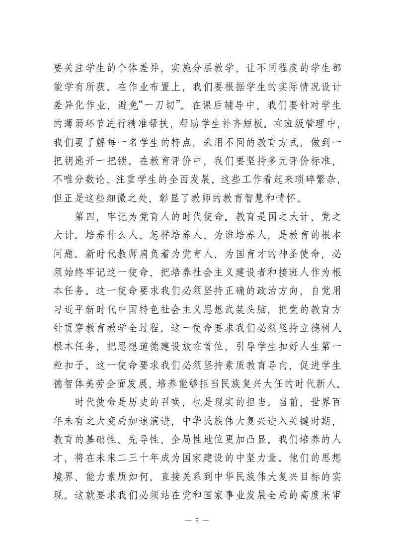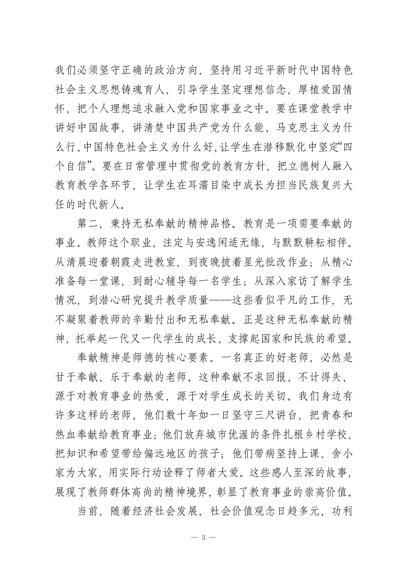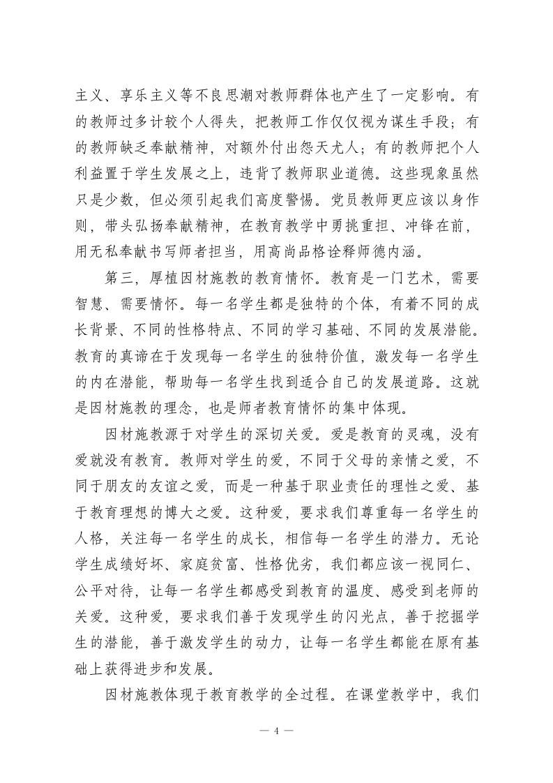 党课:坚守师者初心涵养高尚师德同志们:今天,我们在这里集中开展专题党课学习,主题是“坚守师者初心,涵养高尚师德”。这个主题既是对全校教师思想政治建设的一次深度推进,也是对我校教师队伍建设的一次重要部署。师德师风建设事关教育事业成败,事关立德树人根本任务的落实,事关千千万万学生的健康成长。作为一名教育工作者,一名党员教师,我们必须深刻认识到,坚守师者初心、涵养高尚师德,是新时代赋予我们的神圣使命,是党和人民对我们的殷切期望。党的十八大以来,以习近平同志为核心的党中央高度重视教师队伍建设,把师德师风建设摆在事关教育事业发展全局的战略位置。习近平总书记多次就教师队伍建设发表重要讲话,强调教师是人类灵魂的工程师,是人类文明的传承者,承载着传播知识、传播思想、传播真理,塑造灵魂、塑造生命、塑造新人的时代重任。党的二十大报告明确指出,要加强师德师风建设,培养高素质教师队伍,弘扬尊师重教社会风尚。这些重要论述和决策部署,为我们加强师德师风建设指明了方向,提供了根本遵循。当前,教育强国建设正处于关键时期。*省*县的教育事业也迎来了高质量发展的历史机遇期。我校作为县域教育的排头兵,肩负着为*大地培养德智体美劳全面发展的社会主义建设者和接班人的重任。全校现有党员教师70余名,这支队伍是推1