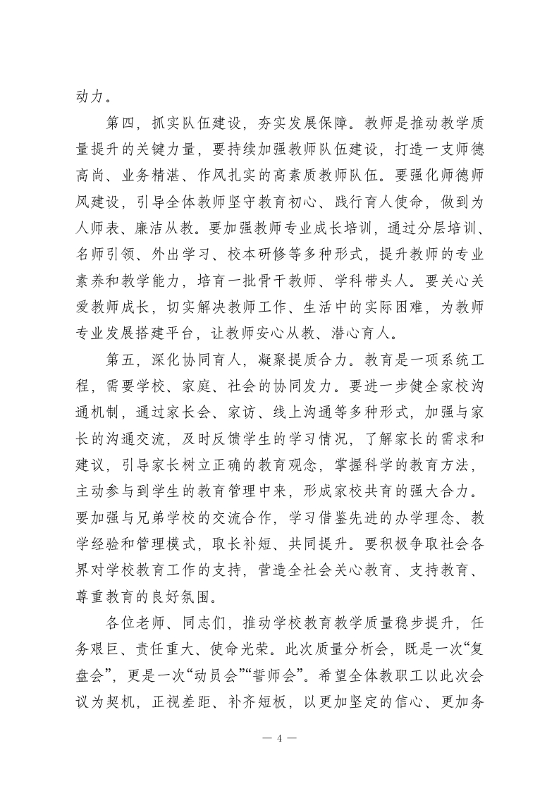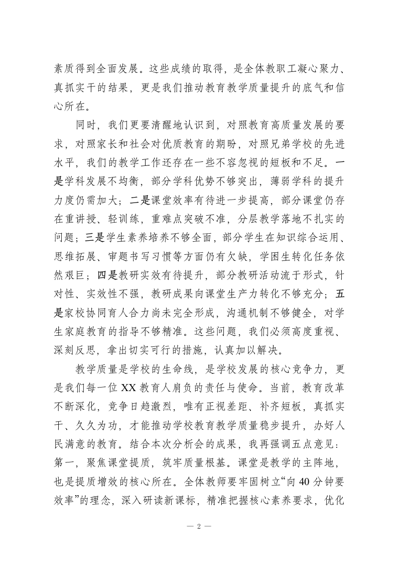 奋力推动学校教育教学质量稳步提升XX实验学校教学质量分析会总结讲话各位老师、同志们:今天,我们齐聚一堂,隆重召开XX实验学校教学质量分析会。这次会议既是对一段时期以来学校教育教学工作的全面复盘、系统梳理,也是一次精准把脉、凝聚共识、部署未来的动员会、攻坚会。刚才,教务处围绕各年级、各学科的质量数据,从平均分、优秀率、及格率等核心指标入手,进行了多维度、深层次的剖析,精准呈现了我们的教学成效与短板不足:各学科教研组长、年级组长结合自身工作实际,分享了宝贵的教学经验,也坦诚剖析了工作中存在的问题,提出了切实可行的改进建议;部分优秀教师代表倾囊相授,分享了抓实课堂常规、落实分层教学、强化家校协同的有效做法,引发了大家的广泛共鸣。在此,我代表学校,向辛勤耕耘在教学一线、默默奉献的全体教职工,致以衷心的感谢和崇高的敬意!回顾这段时期的教学工作,我们始终坚持以立德树人为根本任务,坚守“质量立校、特色兴校”的办学理念,聚焦课堂主阵地,深耕教学主业,在全体师生的共同努力下,取得了阶段性成效。我们的教师队伍素养持续提升,一批教师在各级各类教学竞赛中崭露头角,校本教研、集体备课的实效性不断增强;我们的课堂教学改革稳步推进,高效课堂建设初见成效,学生的课堂参与度、自主学习能力得到有效提升;我们的学生培养质量稳步向好,在各类学业检测、学科竞赛中表现良好,综合1
