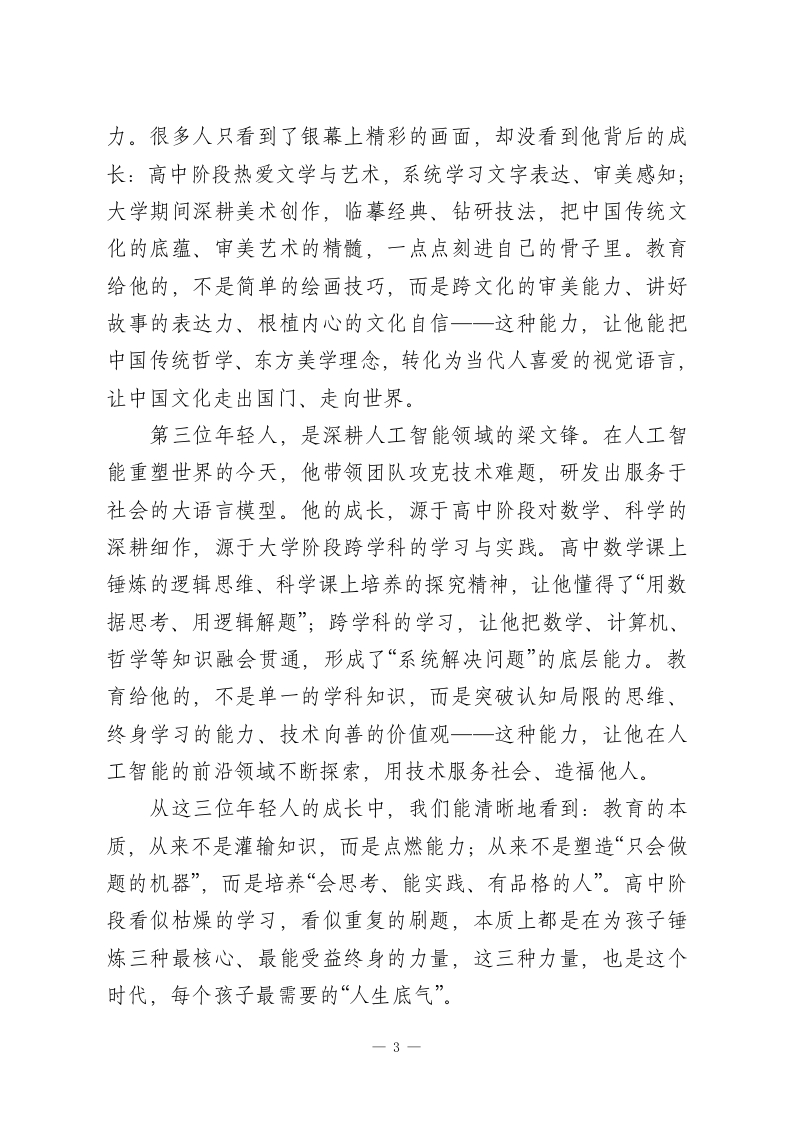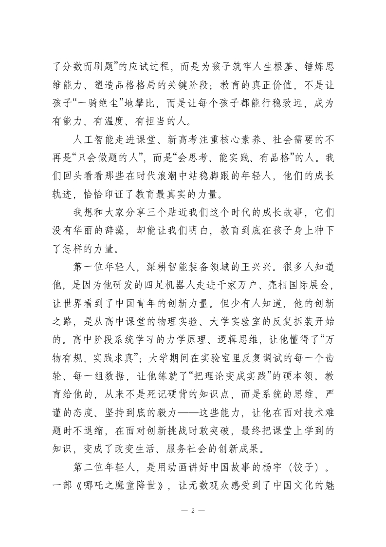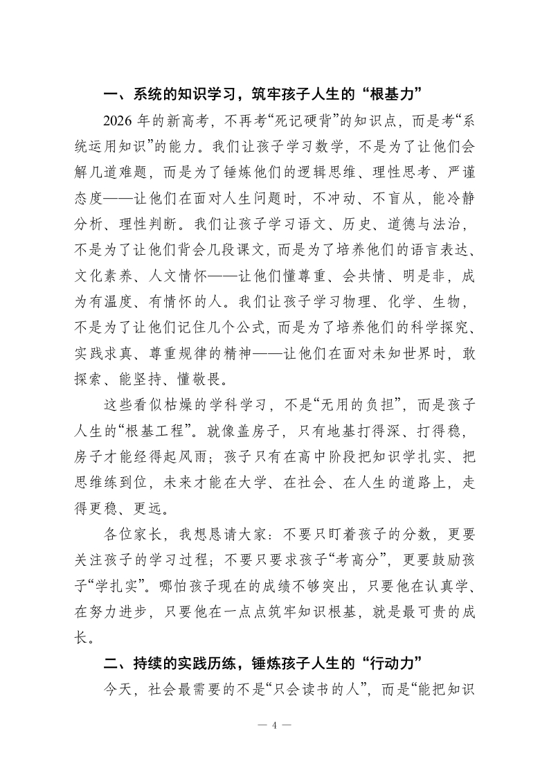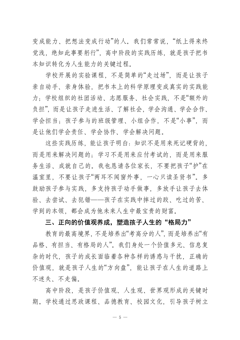 高中家长会校长讲话:以教育为基以成长为要让每个该子行稳致远尊敬的各位家长、亲爱的老师们、同学们:大家好!首先,我代表学校全体师生,向各位家长在百忙之中抽空到来,表示最诚挚的感谢一一教育从来不是学校的孤军奋战,而是家庭与学校同心同向、携手同行的漫长旅程,你们的理解、支持与陪伴,是孩子们安心求学、健康成长最坚实的底气。今天我们坐在一起,不谈空洞的口号,不聊表面的成绩,只想和大家聊一个最朴素、也最关键的话题:站在这个人工智能飞速发展、新高考全面落地、社会竞争日新月异的时代,我们的孩子在高中校园里埋头苦读,到底在“学什么”?教育又能真正为孩子的未来带来什么?我知道,在座的每一位家长,心里都藏着一份焦虑。看着孩子每天早出晚归、埋首于书山题海,看着试卷上的分数起起伏伏,大家既心疼又迷茫:孩子学的这些公式、课文、知识点,未来真的能用得上吗?在这个AI能做题、能解题的时代,孩子苦读高中三年,意义到底在哪里?也有不少孩子会在心底发问:我每天重复刷题、背书,到底是为了什么?这些看似枯燥的知识,真的能照亮我未来的路吗?今天,我想和大家一起,抛开“唯分数论”的浮躁,静下心来读懂教育的本质。我们不用遥远的大道理,只用身边最真实的成长、时代最真切的需求,告诉大家:高中教育从来不是“为一1
