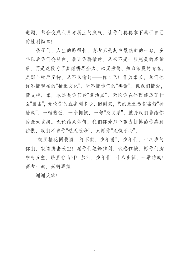 家委会主任在XX中学2026届成人礼上的发言:不求“逆天改命”,只愿“无愧于心”尊敬的校领导、老师们,亲爱的孩子们,以及此刻正坐在台下、心情可能比你们还激动的家长们:大家好!我是高三(8)班学生XXX的家长,非常荣幸,也无比激动,能作为家长代表站在这里。首先,我代表所有家长,向一路陪伴孩子们的校领导和老师们,说一句最真心的感谢:老师们,你们辛苦了!今天,站在这里,看着台下孩子们这一张张青春洋溢、眼神清澈的脸庞,心里满是感慨。仿佛昨天才把你们送进学校的大门,转眼间,就已经站在了十八岁的路口,即将迎接人生第一场真正的“大型副本”一一高考。孩子们,今天是你们的成人礼。十八岁,是一个什么概念呢?在网络上,这叫“解锁成年皮肤”;在法律上,这叫“正式持证上岗”;而在我们父母眼里,这是你们从“新手村”走向广阔天地的“传送门”。我知道,现在的你们很累。这三年来,每天迎着晨星起床,伴着月色回家,书包越来越重,试卷越叠越高,你们可能会在深夜里怀疑人生,想着“这日子什么时候是个头,我真的会谢”,想发个QQ空间吐槽:“毁灭吧,累了”,甚至想做个“躺平”的青年。但是,孩子们,这都是你们在为自己的未来攒buff、冲段位啊!眼下的每一分辛苦,现在多熬的每一个夜、多啃的每一