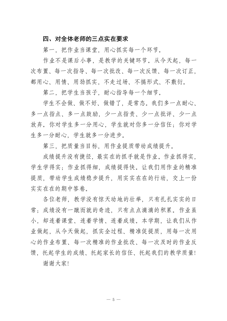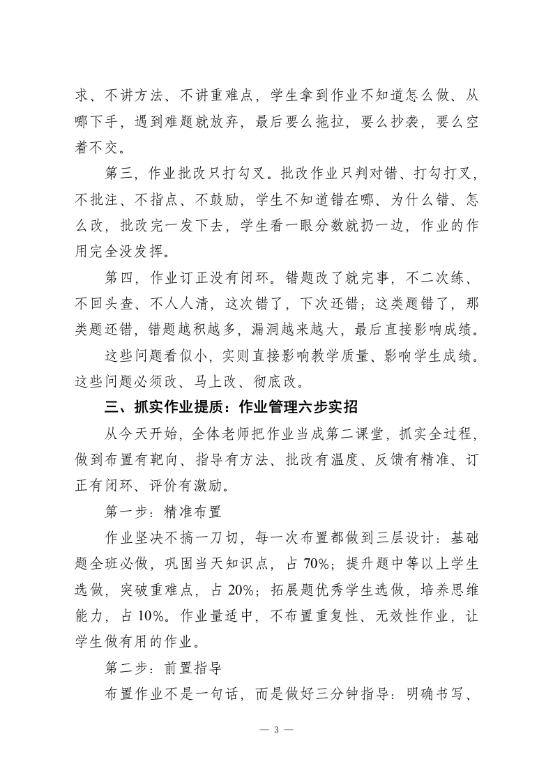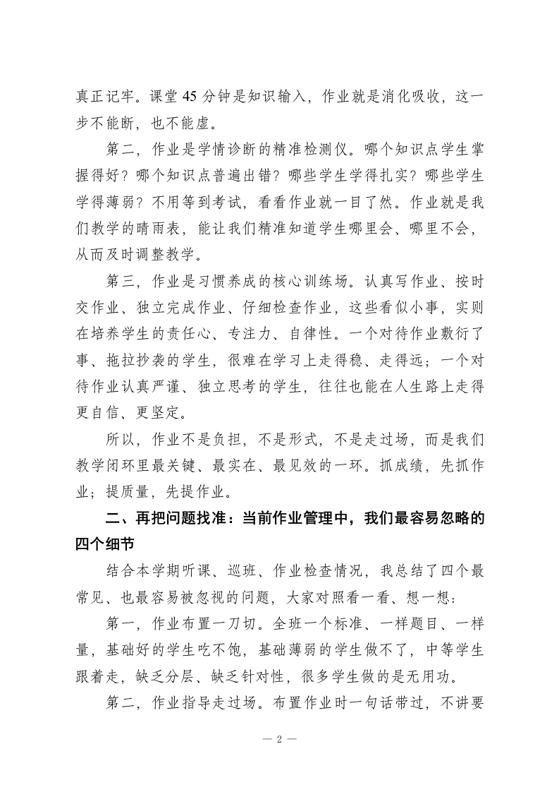 教学工作推进会教学副校长讲话:抓实作业全过程管理以精准提质促成绩提升各位老师:大家好!今天我们不聊宏观理念,不讲空泛口号,专门聚焦一件天天做、人人做,但最容易做虚的事一作业。在日常教学里,作业不是课后的附加任务,而是课堂的延伸、知识的巩固、学情的体检,更是提升成绩最直接、最见效的抓手。课堂讲得再好,知识点讲得再透,作业落不实,一切等于零。学生的知识漏洞、习惯问题、薄弱环节,几乎都能从作业里看得一清二楚;我们的教学是否精准、指导是否到位、反馈是否及时,也全都体现在作业里。今天,我结合本学期过半的教学实际,围绕作业怎么布置、怎么指导、怎么批改、怎么反馈、怎么订正,和大家聊几句实在话、真心话,把作业这件小事抓实、抓细、抓出成效,用作业提质带动整体成绩稳步提升。一、先把认识摆正:作业不是负担,是教学不可或缺的关键一环很多老师觉得,作业就是课后让学生做做题、练练手;很多学生觉得,作业就是老师布置的任务,做完就行。这种认识太浅、太片面。第一,作业是知识巩固的最后一公里。课堂上听懂了,不代表真掌握了;只有动笔做一做、认真练一练,才能把知识点1
