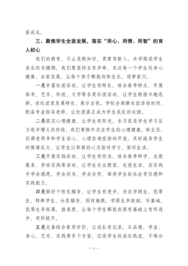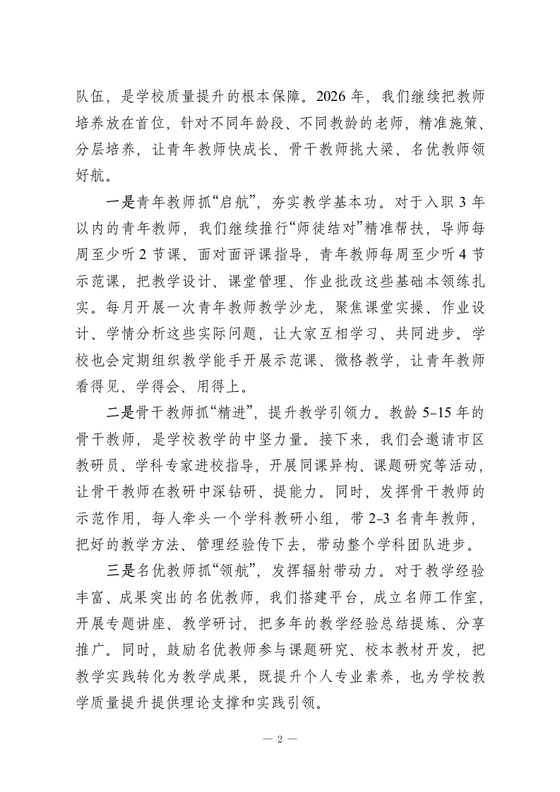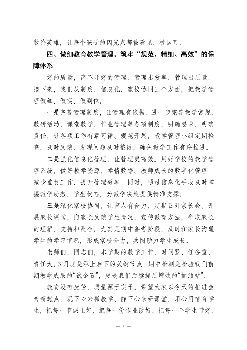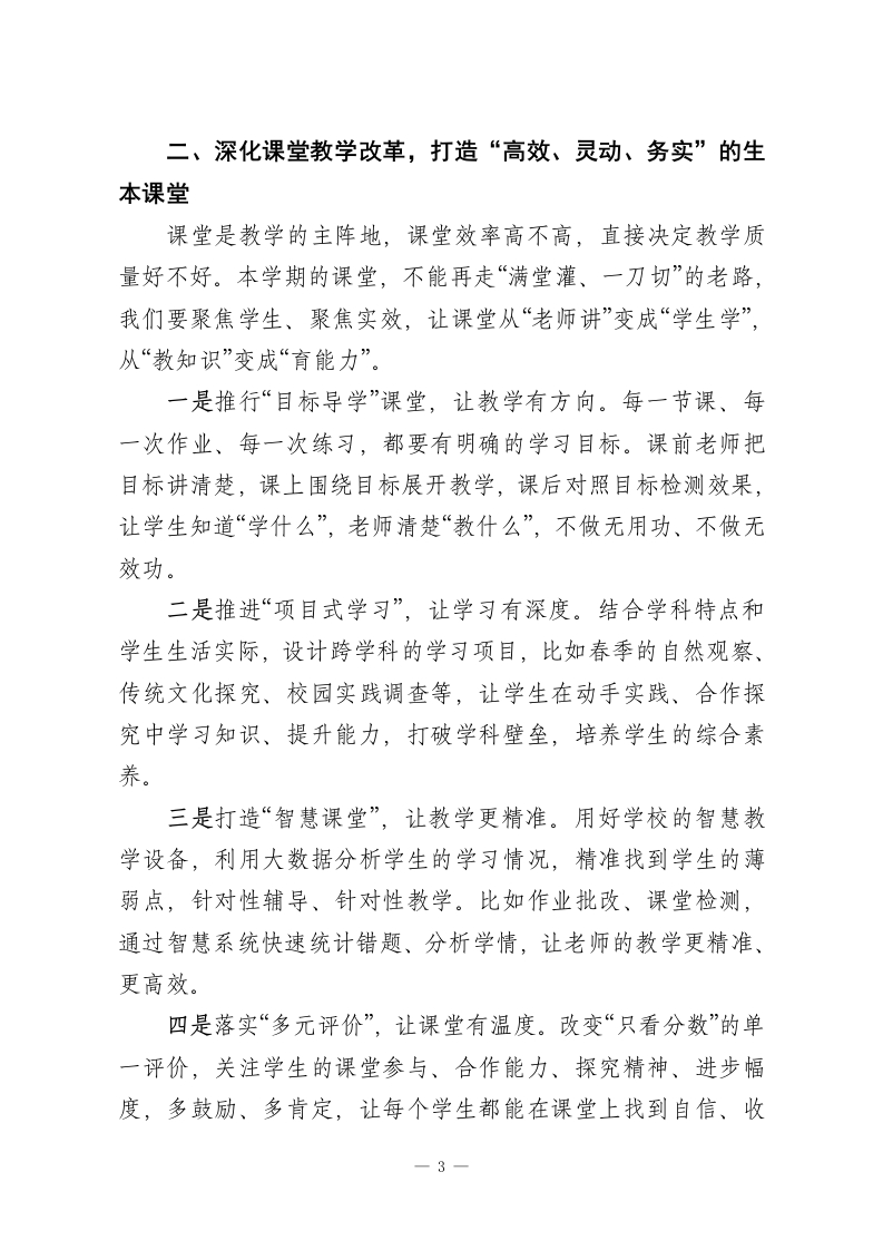 教学质量推进会上校长讲话:深耕教学提质效笃行实干启新程各位老师、同志们:大家下午好!教学工作进入了“爬坡过坎、提质增效”的核心阶段,今天我们召开教育教学质量推进会,不是讲空话、喊口号,而是坐下来、沉下心,一起复盘前期工作、查摆现存问题、明晰后续路径,把“教学质量”这根弦绷得更紧,把“育人实效”这件事抓得更实,全力推动学校教育教学工作再上新台阶。教育教学质量是学校的立校之本、发展之基,更是我们每一位教育工作者的初心所在、责任所在。过去这段时间,大家坚守讲台、深耕课堂、用心育人,学校的教学秩序平稳有序、师生状态积极向上,这离不开每一位老师的辛勤付出。但我们也要清醒地看到,当前我们的教学工作还存在不少短板:青年教师成长速度有待加快,课堂教学效率有待提升,学生个性化培养有待细化,家校协同力度有待加强。这些问题,既是我们当前的“堵点”,也是我们后续提质的“重点”。结合本学期教学规律和学校实际,接下来,我围绕教师成长、课堂变革、学生发展、管理保障四个核心方面,和大家交流几点思路,也明确下一阶段的工作重点。一、抓实教师分层培养,打造“能教、善教、乐教”的师资队伍教师是教学的第一资源,一支业务精湛、责任心强的教师-1