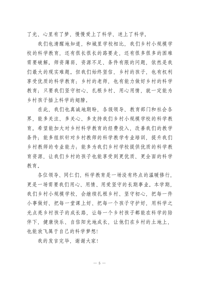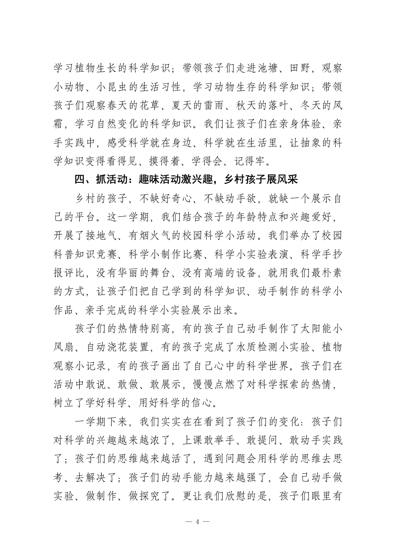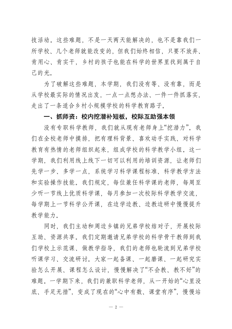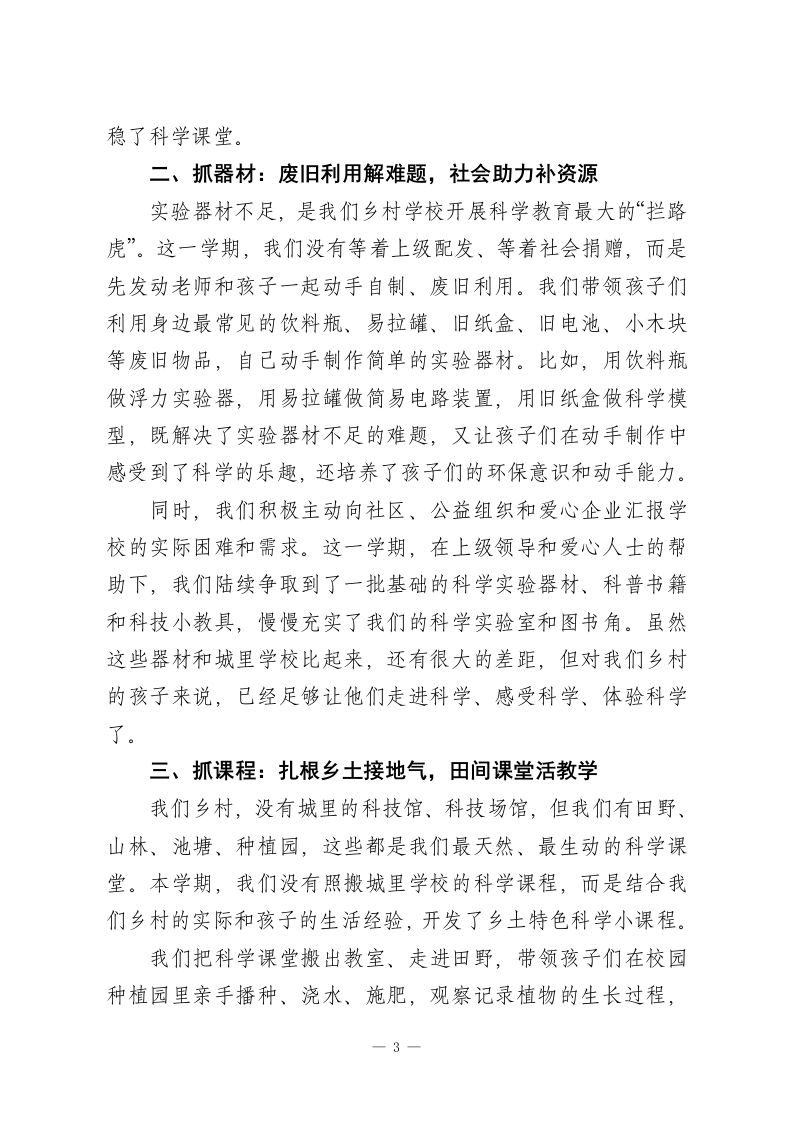 农村小规模学校科学教育工作汇报:扎根乡村守初心以科学之光点亮农村孩子成长路尊敬的各位领导、亲爱的教育同仁们:大家好!非常荣幸能在本学期中小学科学教育工作推进会上,和大家面对面交流、学习。作为一名长期扎根在乡村小规模学校的教育工作者,我每天最牵挂的,就是如何让我们乡村的孩子也能享受到和城里孩子一样的科学教育,如何让有限的资源发挥最大的作用,如何让科学的种子在孩子们心里生根发芽。今天,我就结合我们学校这一学期的真实实践、具体做法和真实感受,和大家分享我们乡村小规模学校在推进科学教育中的探索与思考。我们乡村小规模学校,最大的特点就是学生少、规模小、师资薄、资源缺。本学期,随着科学教育全面纳入中小学教育教学重点,我们既感到振奋,也实实在在面对着现实的难题:一是没有专职的科学教师,所有科学课都由其他学科老师兼任,大家没有系统的科学教学经验,专业能力跟不上;二是实验器材严重不足,陈旧老化,很多基础的科学实验没法开展;三是我们乡村孩子接触面窄,没有太多机会接触科技产品、科技场馆,对科学的认知大多只停留在课本上;四是学校经费有限,没有办法像城里学校一样添置大量的科技设备、开展丰富的科