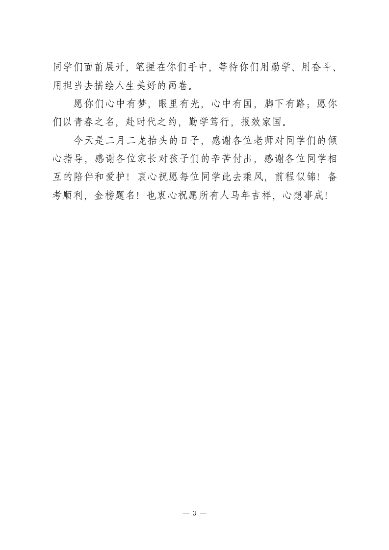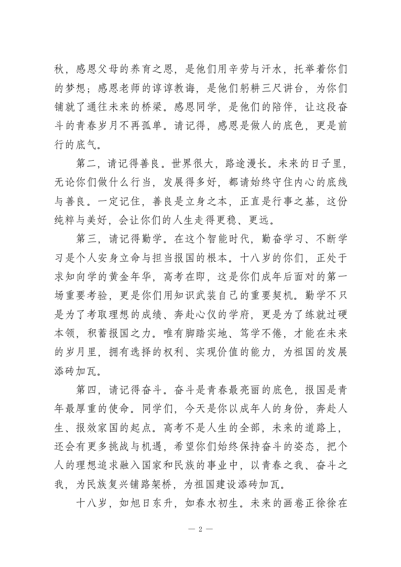书记在我校2026届高三成人礼上的讲话:以学铸魂以行报国尊敬的各位老师、各位家长,亲爱的同学们:大家好!今天,我们在这里为高三同学举行十八岁成人仪式。看着你们朝气蓬勃的面庞、眼中闪耀的光芒,我们老师和家长内心满是欣慰与期许。十八岁,是青春最美的序章,是人生崭新的起点,是让人永远铭记的时刻。三年前,你们怀揣着梦想与憧憬走进东师附深的校园;一千多个日夜,你们在教室里埋首书卷、挑灯夜战,在操场上挥洒汗水、共同拼搏。那些为一道难题冥思苦想的夜晚,那些和同窗携手奋进的时光,都将成为你们青春里最珍贵的印记。你们在这里不仅收获了知识的养分,更学会了独立思考、懂得了担当付出,为奔赴更广阔的天地打下了坚实的基础。从今天开始,你们正式迈入成年的行列,拥有了法律赋予的公民权利,也就要扛起法律要求的公民义务。你们不再是父母照顾的孩子,而是要成为独立自强、为自已言行负责的成年人,更要成为心怀家国、肩有担当的新时代青年。成人,意味着独立,意味着对自己、对家庭的责任,更意味着对社会、对国家、对时代的使命。在这个充满仪式感的日子里,我想对即将开启人生新征程的同学们说几句心里话,希望能照亮你们未来的征途。第一,请记得感恩。做人不忘本,行路有根基。十八载春-1