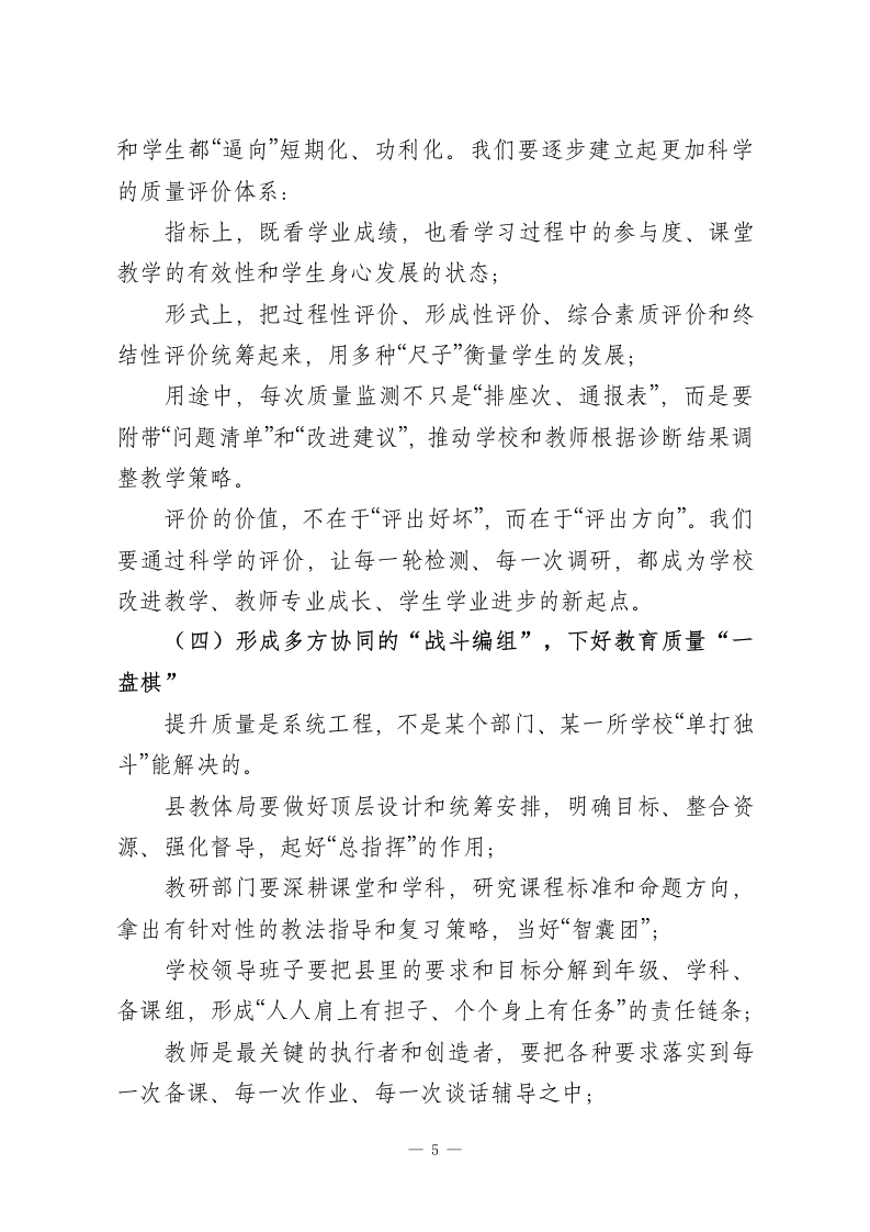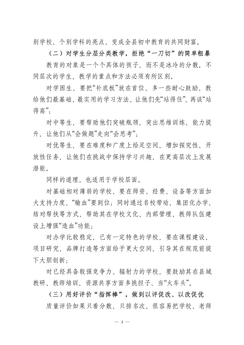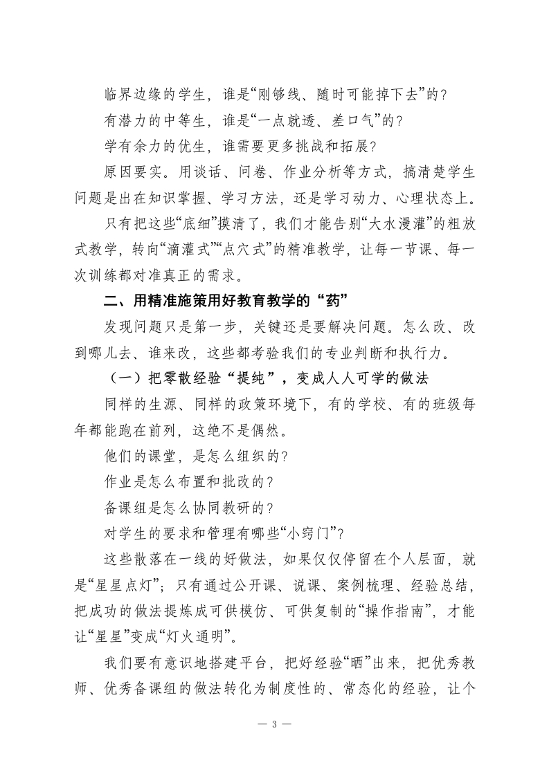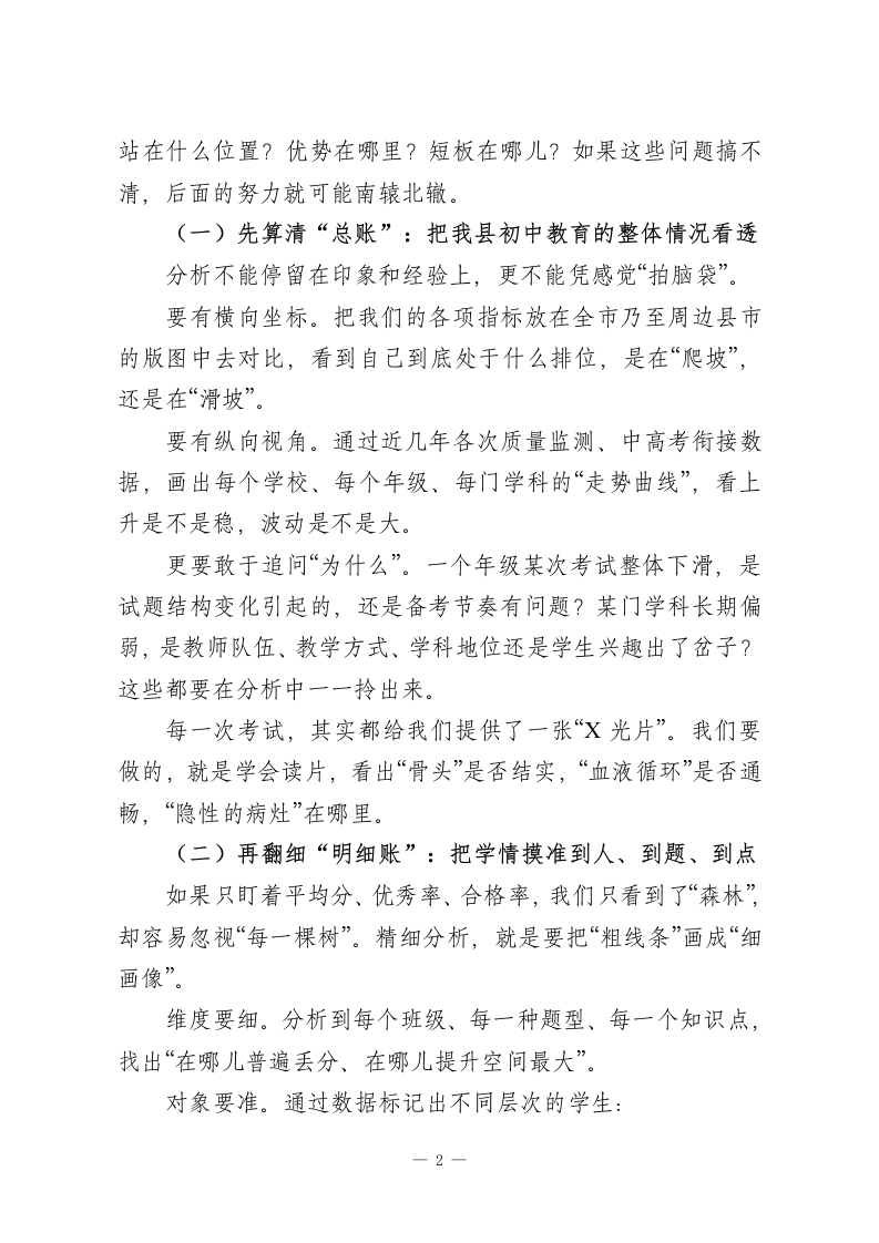 县初中教学质量如何“提上去、稳下来、走长远”?校长在这场分析会上的发言给出系统答案各位领导,各位校长,亲爱的教育同仁们:大家上午好!今天,我们围坐在一起,讨论的是同一件事一一怎样把我县初中教育教学质量真正“提上去、稳下来、走长远”。大会确定的主题是“精细分析、精准施策、精益求精”。乍一听,这是我们常挂在嘴边的工作要求,但如果再往深里想,这十二个字,其实就是质量提升的“操作指南”。有人说,一个人发展的上限,往往被他的认知边界所限定。教育领域也是如此:一所学校能走多远,一个年级、一个备课组能爬多高,很大程度取决于管理者和教师的教育视野与专业判断。换句话说,认知高度,决定质量高度。我理解的这十二个字,既是破解难题的“方法论”,也是我们坚守教育初心、追求育人品质的“价值观”。围绕这个主题,我想从三个方面同大家作一个交流:第一,用精细分析把准脉;第二,用精准施策用好药;第三,用精益求精走长远。一、用精细分析把准教育教学的“脉”质量提升,第一步不是“怎么干”,而是“看清楚”。我们究竟1